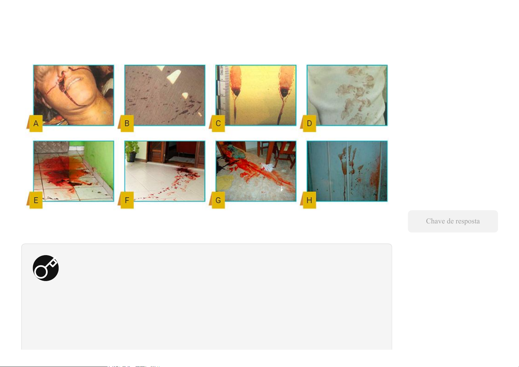 Verificando o aprendizado Questão 1 Observe as imagens a seguir e identifique o tipo de mancha de sangue existente em cada cenário. Chave de resposta Chave de resposta A - Mancha por escorrimento. B - Mancha por projeção em plano horizontal. C - Mancha por precipitação em plano inclinado. Questão 2 Observe a imagem a seguir registrada em uma cena de homicídio. Manchas de sangue no chão de uma sala, ao lado de uma bicicleta. Pela análise da mancha de sangue é possível afirmar que: A A vítima encontrava-se em movimentação rápida em direção ao sofá. B A vítima encontrava-se parada enquanto sangrava. D - Mancha por contato. E - Mancha por derramamento. F - Mancha por contato. G - Mancha por remoção ou limpeza. H - Mancha por projeção em parede. C A vítima encontrava-se em movimentação morosa em direção ao sofá. D É uma mancha de sangue produzida por contato. E É uma mancha produzida por derramamento. Parabéns! A alternativa B está correta. Questão 3 A seguir, observamos uma trilha de gotejamento de sangue deixado pela vítima em um local de crime. O padrão de espinhos na gota nos fornece informações sobre o deslocamento da vítima. Responda A forma e a distribuição da mancha indicam ausência de movimento no momento do sangramento, o que leva à conclusão de que a vítima estava parada. A morfologia dessas manchas permite afirmar que: A A vítima foi atingida nesse local e permaneceu parada enquanto sangrava até morrer. B A vítima se deslocou no sentido da estrada para o canavial enquanto sangrava. C A vítima se deslocou no sentido do canavial para a estrada enquanto sangrava. D A vítima se movia com muita velocidade. E Não é possível afirmar nada sobre o deslocamento da vítima, uma vez que as manchas são oriundas de tentativa de remoção. Parabéns! A alternativa C está correta. Questão 4 Quanto ao suporte sobre o qual se localizam as manchas de sangue é possível afirmar que: A A forma original da mancha não é alterada pela textura da superfície. B Quanto maior o poder de absorção e textura da superfície menor será o diâmetro das manchas. C Independentemente das características da superfície, as manchas de sangue não formarão raiamentos. Responda A direção e a forma das manchas de sangue demonstram que a vítima se deslocava do canavial para a estrada enquanto sangrava, permitindo essa afirmação com base na análise da morfologia do padrão de sangue. D A formação de raiamentos nas manchas de sangue por precipitação dependem somente da altura da queda da gota. E Quanto maior o poder de absorção e textura da superfície maior será o diâmetro das manchas. Parabéns! A alternativa E está correta. Questão 5 A imagem a seguir ilustra a morfologia da mancha de sangue produzida por precipitação em um plano horizontal. Responda Quanto maior a absorção e a rugosidade da superfície, maior será a área de dispersão do sangue, resultando em manchas com diâmetro mais amplo. Essa observação é fundamental em análises de manchas de sangue na investigação forense, ajudando a determinar não apenas o tipo de superfície atingida, mas também aspectos como o ângulo e a intensidade do impacto. Em relação a cada gota de sangue é correto afirmar que: A A gota de sangue D sofreu queda de uma altura maior que as gotas A, B e C. B A morfologia dessas manchas de sangue não sofre influência da altura da queda. C A gota de sangue A sofreu queda de uma altura maior que as gotas B, C e D. D A gota de sangue B sofreu queda de uma altura maior que as gotas A, C e D. E A gota de sangue C sofreu queda de uma altura menor que a gota de sangue A. Parabéns! A alternativa A está correta. Responda Em análises de manchas de sangue, quanto maior a altura da queda, maior será a dispersão da mancha ao atingir a superfície, gerando bordas mais irregulares e diâmetro maior. Questão 6 A análise da morfologia das manchas de sangue em locais de crime depende de diversas variáveis físicas e químicas relacionadas tanto ao próprio fluido quanto às superfícies onde as gotas se depositam. Considerando esses fatores e a dinâmica de formação das manchas de sangue, assinale a alternativa correta: A A tensão superficial do fluido é um dos fatores que interferem na morfologia e na dinâmica de dispersão do sangue em cenários de crime. B Entre as principais propriedades do sangue, incluem-se o peso específico, a viscosidade e a tensão superficial, que são responsáveis pela estabilidade das gotas e por sua coesão, que aliado às características do substrato, são as principais variáveis que interferem na formação dos padrões das manchas de sangue. C Nas manchas por queda livre sobre planos horizontais, o sangue atinge o piso ou outro anteparo, impulsionado pela ação da gravidade (efeito da força peso). D Se o anteparo for oblíquo, a configuração das manchas não será circular. Inicialmente, a gota se expande e depois o sangue desce para a parte inferior alargando-se. E Nas manchas por projeção sobre planos horizontais, atua sobre a gota apenas a ação da gravidade. Responda Parabéns! A alternativa E está correta. A formação e o padrão das manchas de sangue em um local de crime são diretamente influenciados por propriedades físicas do fluido, como peso específico, viscosidade e, especialmente, tensão superficial, que mantêm a coesão da gota até o impacto com uma superfície. Além disso, fatores como a inclinação do anteparo (superfície onde o sangue se deposita) alteram a morfologia da mancha: em superfícies horizontais, a tendência é a formação de manchas circulares, enquanto em planos inclinados, o sangue tende a escorrer após o impacto, criando manchas alongadas. Portanto, compreender essas características é fundamental para interpretar corretamente os vestígios sanguíneos no contexto da dinâmica do crime.