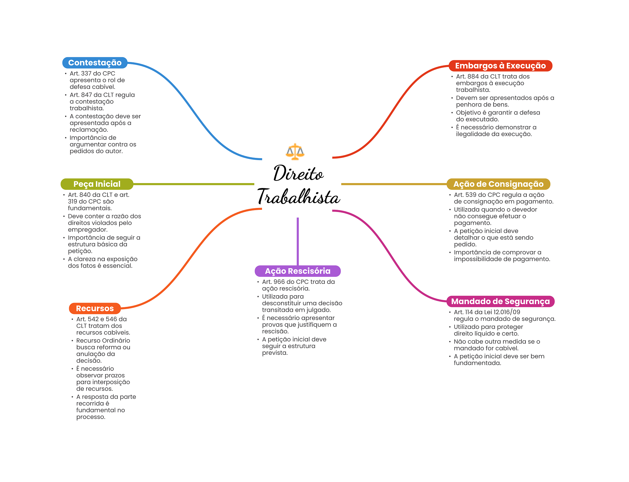Contestação Embargos à Execução Art. 337 do CPC Art. 884 da CLT trata dos apresenta rol de defesa cabível. embargos à execução trabalhista. Art. 847 da CLT regula Devem ser apresentados após a a contestação trabalhista. penhora de bens. Objetivo é garantir a defesa A contestação deve ser do executado. apresentada após a reclamação. É necessário demonstrar a Importância de ilegalidade da execução. argumentar contra pedidos do autor. Direito Peça Inicial Ação de Consignação Art. 840 da CLT e art. 319 do CPC são Trabalhista Art. 539 do CPC regula a ação de consignação em pagamento. fundamentais. Utilizada quando devedor Deve conter a razão dos não consegue efetuar direitos violados pelo pagamento. empregador. A petição inicial deve Importância de seguir a detalhar que está sendo estrutura básica da pedido. petição. Importância de comprovar a A clareza na exposição impossibilidade de pagamento. dos fatos é essencial. Ação Rescisória Art. 966 do CPC trata da ação rescisória. Utilizada para desconstituir uma decisão Mandado de Segurança Recursos transitada em julgado. Art. 114 da Lei 12.016/09 Art. 542 e 546 da É necessário apresentar regula O mandado de segurança. CLT tratam dos provas que justifiquem a Utilizado para proteger recursos cabíveis. rescisão. direito líquido e certo. Recurso Ordinário A petição inicial deve Não cabe outra medida se O busca reforma ou seguir a estrutura mandado for cabível. anulação da prevista. A petição inicial deve ser bem decisão. fundamentada. É necessário observar prazos para interposição de recursos. A resposta da parte recorrida é fundamental no processo.