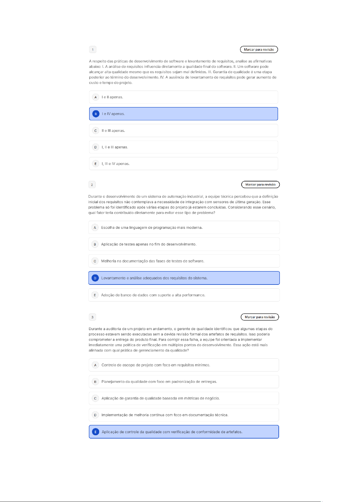 1 Marcar para revisão A respeito das práticas de desenvolvimento de software e levantamento de requisitos, analise as afirmativas abaixo: I.A análise de requisitos influencia diretamente a qualidade final do software. II. Um software pode alcançar alta qualidade mesmo que os requisitos sejam mal definidos. III. Garantia de qualidade é uma etapa posterior ao término do desenvolvimento. IV. A ausência de levantamento de requisitos pode gerar aumento de custo e tempo do projeto. A e apenas. le IV apenas. e III apenas. D I, e III apenas. E I, III e IV apenas. 2 Marcar para revisão Durante o desenvolvimento de um sistema de automação industrial, a equipe técnica percebeu que a definição inicial dos requisitos não contemplava a necessidade de integração com sensores de última geração. Esse problema só foi identificado após várias etapas do projeto já estarem concluídas. Considerando esse cenário, qual fator teria contribuído diretamente para evitar esse tipo de problema? A Escolha de uma linguagem de programação mais moderna. Aplicação de testes apenas no fim do desenvolvimento. C Melhoria na documentação das fases de testes de software. D Levantamento e análise adequados dos requisitos do sistema. E Adoção de banco de dados com suporte a alta performance. 3 Marcar para revisão Durante a auditoria de um projeto em andamento, o gerente de qualidade identificou que algumas etapas do processo estavam sendo executadas sem a devida revisão formal dos artefatos de requisitos. Isso poderia comprometer a entrega do produto final. Para corrigir essa falha, a equipe foi orientada a implementar imediatamente uma política de verificação em múltiplos pontos do desenvolvimento. Essa ação está mais alinhada com qual prática de gerenciamento da qualidade? A Controle de escopo de projeto com foco em requisitos mínimos. Planejamento da qualidade com foco em padronização de entregas. C Aplicação de garantia de qualidade baseada em métricas de negócio. D Implementação de melhoria contínua com foco em documentação técnica. E Aplicação de controle da qualidade com verificação de conformidade de artefatos.4 Marcar para revisão Em relação aos conceitos de requisitos de software, analise itens a seguir e coloque (V) para a assertiva verdadeira e (F) para a assertiva falsa. () Na definição dos requisitos de software, nem todos requisitos não funcionais dizem respeito ao sistema de software a ser desenvolvido. levantamento de requisitos de software privilegia a visão do desenvolvedor em relação aos requisitos de um produto. Já a análise dos requisitos prioriza a visão que cliente e usuários têm dos requisitos de um produto. () Os requisitos de um sistema são descrições dos serviços fornecidos pelo sistema e suas restrições operacionais. processo de descobrir, analisar, documentar e verificar esses serviços e restrições é denominado engenharia de requisitos. () Gerência de requisitos pode ser conceituada como enfoque sistemático para a elicitação, organização e documentação dos requisitos do sistema e um processo que estabelece e mantém acordo entre usuários e a equipe de projeto à medida que os requisitos são modificados. A F,F,V,V V,F,V,V F,F,V,F D V,V,F,V E 5 Marcar para revisão Uma empresa de software desenvolveu um sistema de atendimento bancário. Após o lançamento, clientes relataram que sistema apresentava falhas na visualização de dados em alguns navegadores. A equipe de desenvolvimento alegou que os testes foram realizados, mas apenas no navegador padrão da empresa. Diante dessa situação, qual ação teria contribuído para minimizar a ocorrência desse tipo de falha? A Adoção de um cronograma com prazos mais extensos para cada entrega. Melhoria na infraestrutura da equipe de atendimento ao cliente. Inclusão de métricas de qualidade para análise do comportamento do código. D Ampliação do escopo dos testes para diferentes ambientes e plataformas. E Substituição do sistema por uma versão com recursos simplificados. 6 Marcar para revisão Uma equipe de desenvolvimento está utilizando práticas de auditoria, revisões formais e testes para garantir a conformidade de um software com padrões definidos. Essas práticas estão diretamente relacionadas a que aspecto do processo de qualidade? A Planejamento estratégico do projeto. Controle de escopo de requisitos. Garantia de qualidade do produto. D Integração contínua entre equipes. E Controle de versão do código-fonte.