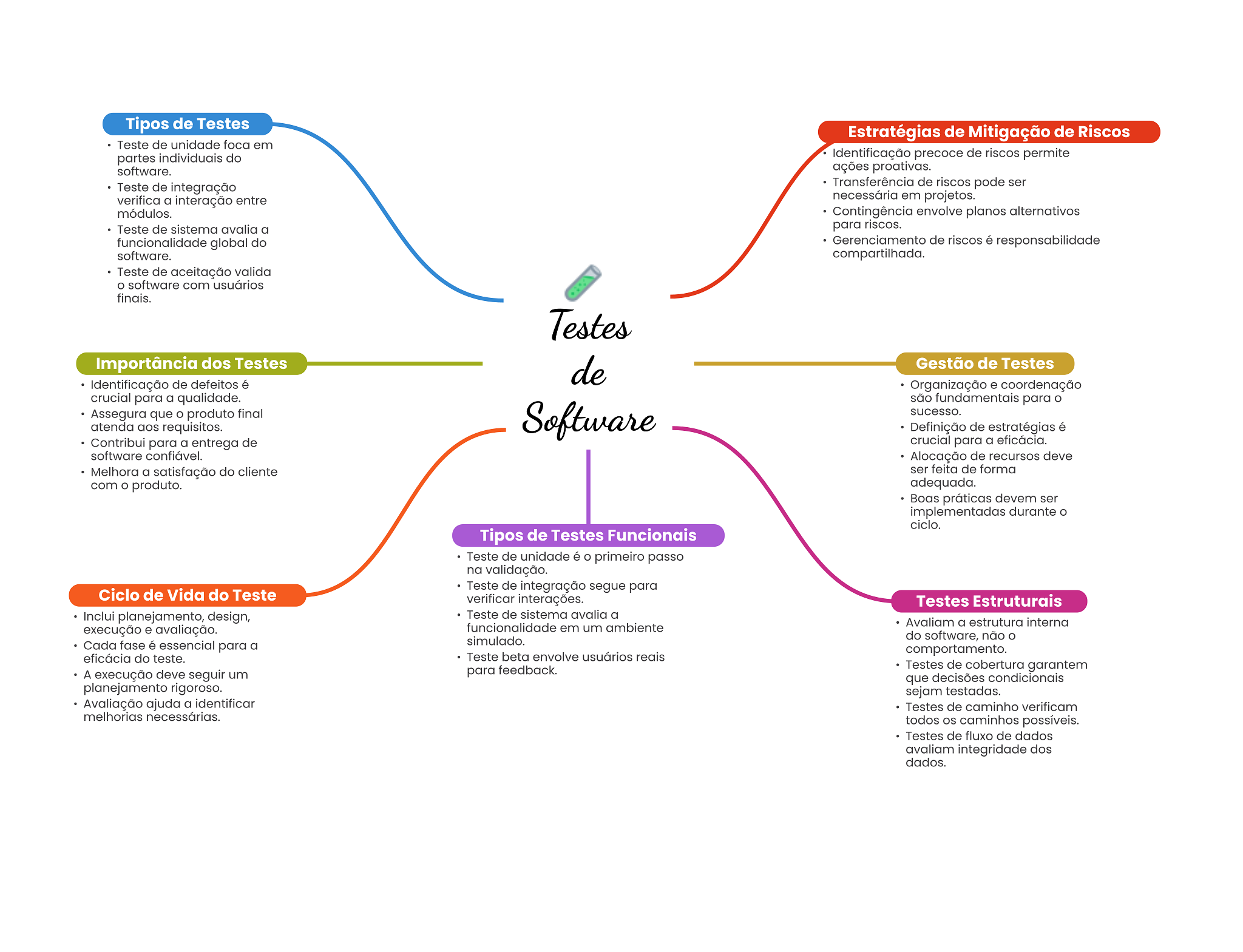 Tipos de Testes Estratégias de Mitigação de Riscos Teste de unidade foca em partes individuais do Identificação precoce de riscos permite software. ações proativas. Teste de integração Transferência de riscos pode ser verifica a interação entre necessária em projetos. módulos. Contingência envolve planos alternativos Teste de sistema avalia a para riscos. funcionalidade global do Gerenciamento de riscos é responsabilidade software. compartilhada. Teste de aceitação valida software com usuários finais. Testes Importância dos Testes de Gestão de Testes Identificação de defeitos é Organização e coordenação crucial para a qualidade. são fundamentais para O Assegura que produto final Software sucesso. atenda aos requisitos. Definição de estratégias é Contribui para a entrega de crucial para a eficácia. software confiável. Alocação de recursos deve Melhora a satisfação do cliente ser feita de forma com produto. adequada. Boas práticas devem ser implementadas durante ciclo. Tipos de Testes Funcionais Teste de unidade é O primeiro passo na validação. Teste de integração segue para Ciclo de Vida do Teste verificar interações. Testes Estruturais Inclui planejamento, design, Teste de sistema avalia a execução e avaliação. funcionalidade em um ambiente Avaliam a estrutura interna Cada fase é essencial para a simulado. do software, não comportamento. eficácia do teste. Teste beta envolve usuários reais para feedback. Testes de cobertura garantem A execução deve seguir um que decisões condicionais planejamento rigoroso. sejam testadas. Avaliação ajuda a identificar Testes de caminho verificam melhorias necessárias. todos caminhos possíveis. Testes de fluxo de dados avaliam integridade dos dados.