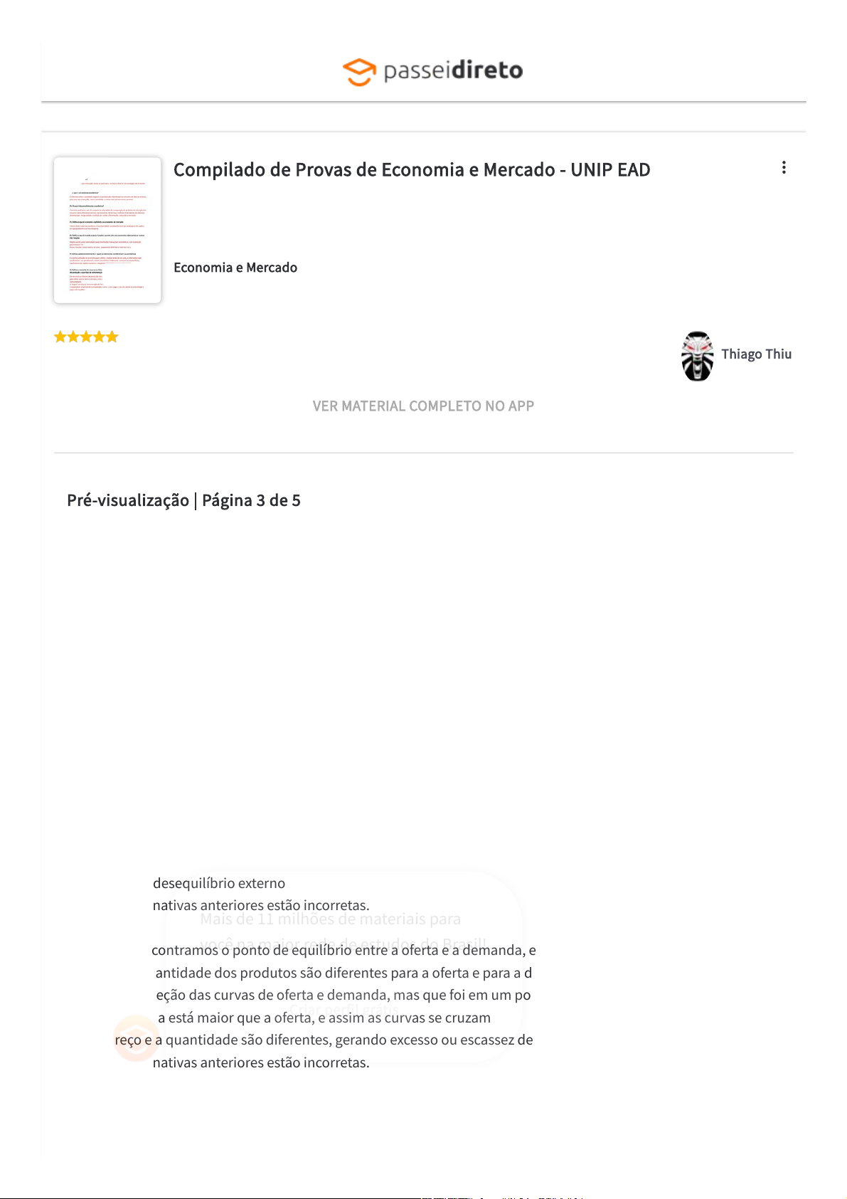 26/05/2022 15:34 Compilado de Provas de Economia e Mercado - UNIP EAD - Economia e Mercado - 3 https://www.passeidireto.com/arquivo/48139776/compilado-de-provas-de-economia-e-mercado-unip-ead/3 1/4 Compilado de Provas de Economia e Mercado - UNIP EAD Economia UNIP Economia e Mercado Enviado por Thiago Thiu138 avaliações VER MATERIAL COMPLETO NO APP Pré-visualização | Página 3 de 5 primeira As duas afirmativas estão erradas A afirmativa I está errada, mas a afirmativa II está correta As duas afirmativas estão corretas, mas a segunda não complementa a primeira A afirmativa I está correta, mas a afirmativa II está errada. A segunda afirmativa não complementa a primeira. P) Quais dos itens abaixo não necessitamos incluir na análise da curva de oferta? Preço do bem desejado Tecnologia Renda Preço dos bens substitutos Preço dos bens complementares. P) A implementação do (Processo de Substituição de Importações), encontrou algumas dificuldades, entre elas: Êxodo urbano. Tendências ao desequilíbrio interno Reduzido papel do Estado Tendência ao desequilíbrio externo Todas as alternativas anteriores estão incorretas. P) Quando encontramos o ponto de equilíbrio entre a oferta e a demanda, estamos dizendo que: O preço e a quantidade dos produtos são diferentes para a oferta e para a demanda. Houve a interseção das curvas de oferta e demanda, mas que foi em um ponto abaixo do ideal. Que a demanda está maior que a oferta, e assim as curvas se cruzam Que o preço e a quantidade são diferentes, gerando excesso ou escassez de produtos. Todas as alternativas anteriores estão incorretas. P) Observe a curva de possibilidade de produção a seguir: Após observar a figura anterior, leia as afirmativas a seguir e assinale a alternativa correta: I – No ponto A, a economia descrita pela curva de possibilidades de produção já utilizou todos os recursos Grátis 19 pág. Mais de 11 milhões de materiais para você na maior rede de estudos do Brasil! Criar perfil grátis https://www.passeidireto.com/tag/economia https://www.passeidireto.com/disciplina/economia-e-mercado https://www.passeidireto.comhttps//www.passeidireto.com/perfil/454761-thiago-thiu https://www.passeidireto.com/ 26/05/2022 15:34 Compilado de Provas de Economia e Mercado - UNIP EAD - Economia e Mercado - 3 https://www.passeidireto.com/arquivo/48139776/compilado-de-provas-de-economia-e-mercado-unip-ead/3 2/4 existentes II – Não pode haver produção no ponto B, uma vez que a economia não atingiu um estágio de crescimento econômico suficiente para alcançar esse nível de produção. III – No ponto C, a economia descrita pela curva de possibilidades de produção enfatiza a produção de canhões. Estão correta as afirmativas Todas as alternativas estão corretas Nenhuma das afirmativas está correta. Apenas a afirmativa III está correta Apenas a afirmativa I está correta Apenas a afirmativa II está correta P) A economia e seus entraves fundamentais originam-se da carência de: Margem de contribuição Ponto de equilíbrio Recursos produtivos Custos variáveis Custos fixos P) Assinale a alternativa que complete a sentença: “Contabilidade social...”: Permite a Receita Federal verificar o montante de impostos que uma empresa deve pagar ao final do exercício. Permite aos proprietários verificar a saúde financeira da empresa Permite verificar o Ativo e o Passivo de uma empresa Registro contábil da atividade econômica de um pais num dado período. Auxilia os investidores a tomarem decisões de compra de ações. P) Caso os preços dos carros se mantenham muito altos, durante muito tempo, mantidos outros fatores constantes, pode-se afirmar que: A demanda por combustíveis devera aumenta, pois carros e combustíveis são bens substitutos A demanda por combustíveis deverá diminuir, pois carro e combustíveis são bens inferiores A demanda por combustíveis devera aumenta, pois carros e combustíveis são bens que não dependem da renda do consumidor A demanda por combustíveis devera reduzir-se, pois carros e combustíveis são bens complementares. Uma vez que se trata de mercados diferentes, não há relação entre o preço dos combustíveis e o preço dos carros. P) Educação, transporte, lazer e turismo. Essas necessidades podem ser classificadas em: Secundarias. Terciarias Primarias Raras Solidas P) Afirmar que os bens são econômicos implica que eles são relativamente: Abundantes Raros ou limitados Fartos Sólidos Solventes. P) Entre as funções da moeda descrita abaixo, assinale a alternativa incorreta: Padrão de pagamento diferido Reserva de valor Instrumento de poder Meio de troca Formadora de preço. Mais de 11 milhões de materiais para você na maior rede de estudos do Brasil! Criar perfil grátis https://www.passeidireto.com/ 26/05/2022 15:34 Compilado de Provas de Economia e Mercado - UNIP EAD - Economia e Mercado - 3 https://www.passeidireto.com/arquivo/48139776/compilado-de-provas-de-economia-e-mercado-unip-ead/3 3/4 P) Surgem a partir da década de 1930 do século XX, quando ainda prevalecem a livre iniciativa, a propriedade privada e as forças do mercado. Mas há grande participação do Estado, não apenas na produção de bens e serviços, mas também na alocação e na distribuição de recursos. Estamos falando de: Economia mista Economia capitalista Economia comunista Economia socialista Monarquia P) É a unidade econômica de produção, responsável pela combinação entre os recursos produtivos, para produzir bens e serviços a serem ofertados para venda no mercado. Estamos falando de: Margem de contribuição Empresa ou firma Valor presente liquido Ponto de equilíbrio Custo fixo P) Também são utilizados na geração de outros bens, mas não se degastam totalmente no processo produtivo, ou seja, não são absorvidos no processo de produção. Estamos falando de: Bens de consumo Bens finais Bens solventes Bens intermediários Bens de capital P) O que represe