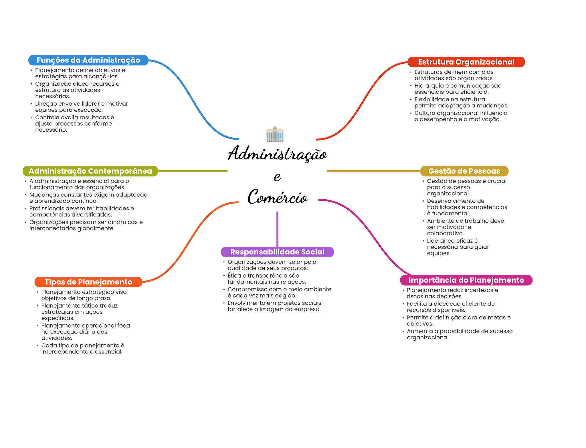 Funções da Administração Estrutura Organizacional Planejamento define objetivos e Estruturas definem como as estratégias para alcançá-los. atividades são organizadas. Organização aloca recursos e Hierarquia e comunicação são estrutura as atividades essenciais para eficiência. necessárias. Flexibilidade na estrutura Direção envolve liderar e motivar permite adaptação a mudanças. equipes para execução. Cultura organizacional influencia Controle avalia resultados e desempenho e a motivação. ajusta processos conforme necessário. Administração Administração Contemporânea Gestão de Pessoas A administração é essencial para e Gestão de pessoas é crucial funcionamento das organizações. para sucesso Mudanças constantes exigem adaptação Comércio organizacional. e aprendizado contínuo. Desenvolvimento de Profissionais devem ter habilidades e habilidades e competências competências diversificadas. é fundamental. Organizações precisam ser dinâmicas e Ambiente de trabalho deve interconectadas globalmente. ser motivador e colaborativo. Liderança eficaz é necessária para guiar Responsabilidade Social equipes. Organizações devem zelar pela qualidade de seus produtos. Ética e transparência são Tipos de Planejamento fundamentais nas relações. Importância do Planejamento Planejamento estratégico visa Compromisso com meio ambiente Planejamento reduz incertezas e objetivos de longo prazo. é cada vez mais exigido. riscos nas decisões. Planejamento tático traduz Envolvimento em projetos sociais Facilita a alocação eficiente de estratégias em ações fortalece a imagem da empresa. recursos disponíveis. específicas. Permite a definição clara de metas e Planejamento operacional foca objetivos. na execução diária das Aumenta a probabilidade de sucesso atividades. organizacional. Cada tipo de planejamento é interdependente e essencial.