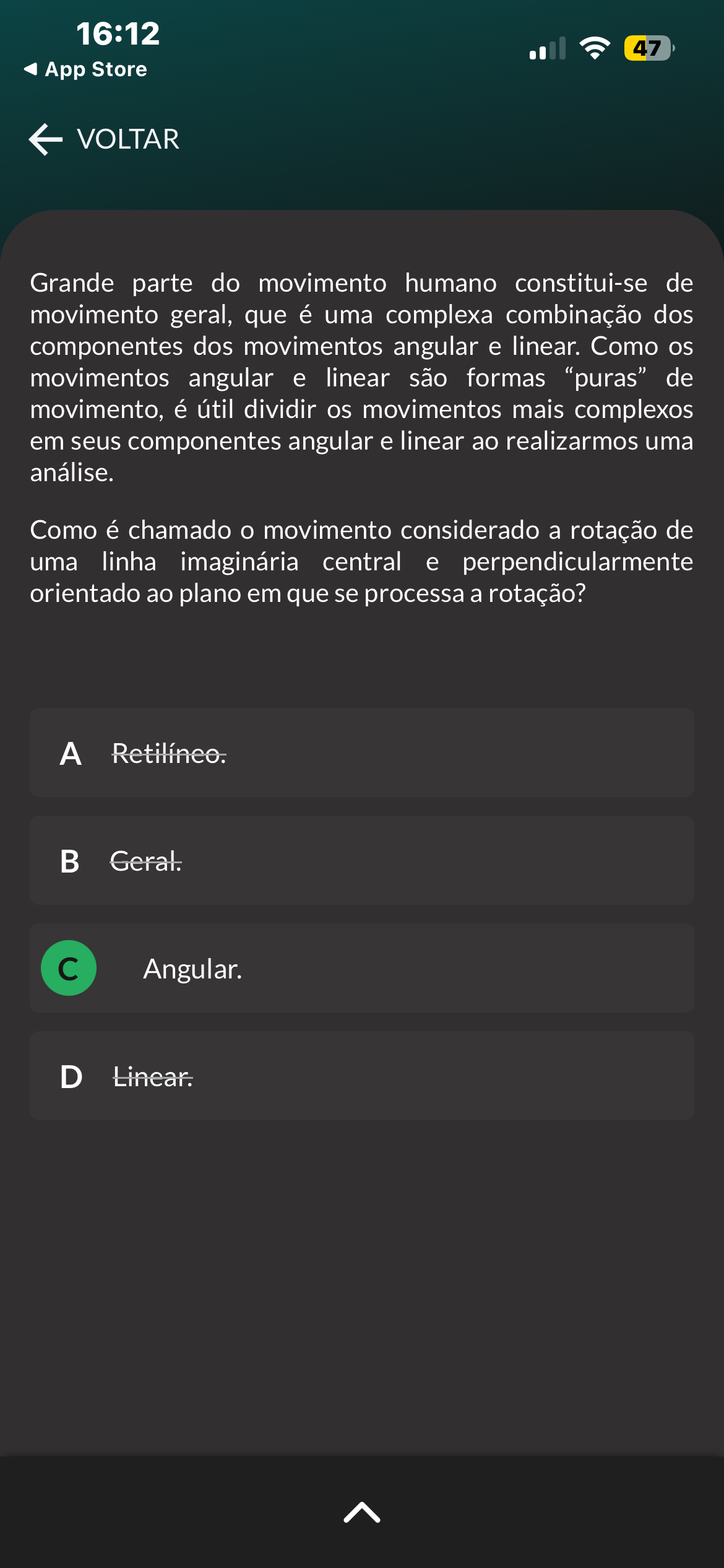 16:12 47 App Store VOLTAR Grande parte do movimento humano constitui-se de movimento geral, que é uma complexa combinação dos componentes dos movimentos angular e linear. Como os movimentos angular e linear são formas "puras" de movimento, é útil dividir os movimentos mais complexos em seus componentes angular e linear ao realizarmos uma análise. Como é chamado movimento considerado a rotação de uma linha imaginária central e perpendicularmente orientado ao plano em que se processa a rotação? A Retilíneo. B Geral. Angular. D Linear.