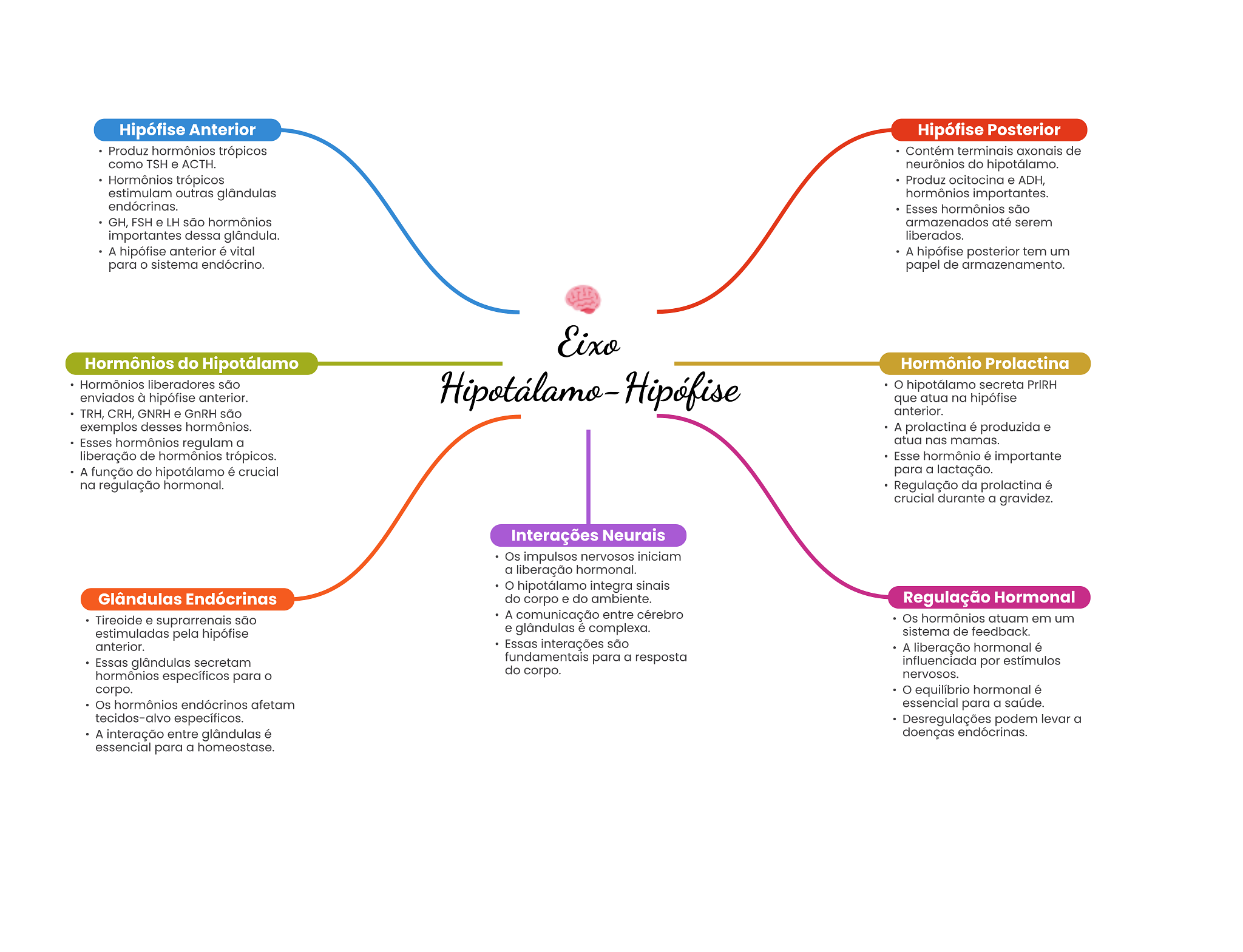 Hipófise Anterior Hipófise Posterior Produz hormônios trópicos Contém terminais axonais de como TSH e ACTH. neurônios do hipotálamo. Hormônios trópicos Produz ocitocina e ADH, estimulam outras glândulas hormônios importantes. endócrinas. Esses hormônios são GH, FSH e LH são hormônios armazenados até serem importantes dessa glândula. liberados. A hipófise anterior é vital A hipófise posterior tem um para sistema endócrino. papel de armazenamento. Eixo Hormônios do Hipotálamo Hormônio Prolactina Hormônios liberadores são Hipotálamo- Hipófise hipotálamo secreta PrIRH enviados à hipófise anterior. que atua na hipófise TRH, CRH, GNRH e GnRH são anterior. exemplos desses hormônios. A prolactina é produzida e Esses hormônios regulam a atua nas mamas. liberação de hormônios trópicos. Esse hormônio é importante A função do hipotálamo é crucial para a lactação. na regulação hormonal. Regulação da prolactina é crucial durante a gravidez. Interações Neurais Os impulsos nervosos iniciam a liberação hormonal. hipotálamo integra sinais Glândulas Endócrinas do corpo e do ambiente. Regulação Hormonal Tireoide e suprarrenais são A comunicação entre cérebro Os hormônios atuam em um estimuladas pela hipófise e glândulas é complexa. sistema de feedback. anterior. Essas interações são A liberação hormonal é Essas glândulas secretam fundamentais para a resposta influenciada por estímulos hormônios específicos para O do corpo. nervosos. corpo. equilíbrio hormonal é Os hormônios endócrinos afetam essencial para a saúde. tecidos-alvo específicos. Desregulações podem levar a A interação entre glândulas é doenças endócrinas. essencial para a homeostase.