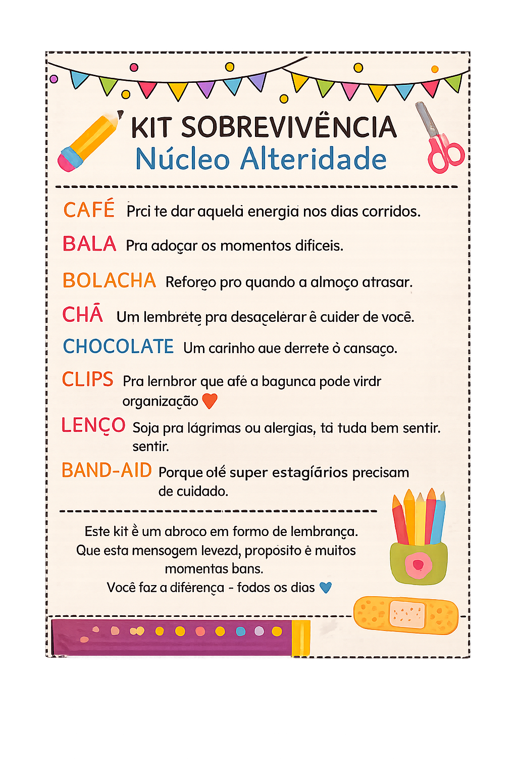 KIT SOBREVIVÊNCIA Núcleo Alteridade CAFÉ Prci te dar aquela energia nos dias corridos. BALA Pra adoçar os momentos dificeis. BOLACHA Reforeo pro quando a almoço atrasar. Um lembrete pra cuider de você. CHOCOLATE Um carinho que derrete cansaço. CLIPS Pra lernbror que afé a bagunca pode virdr organização LENÇO Soja pra lágrimas ou alergias, ta tuda bem sentir. sentir. BAND-AID Porque olé super estagíários precisam de cuidado. Este kit è um abroco em formo de lembrança. Que esta mensogem levezd, proposito muitos momentas bans. Você faz a diférença - fodos os dias