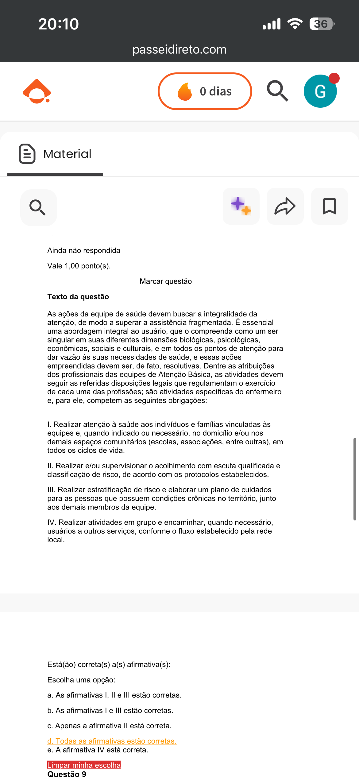 20:10 36 passeidireto.com 0 dias G Material Ainda não respondida Vale 1,00 ponto(s). Marcar questão Texto da questão As ações da equipe de saúde devem buscar a integralidade da atenção, de modo a superar a assistência fragmentada. É essencial uma abordagem integral ao usuário, que o compreenda como um ser singular em suas diferentes dimensões biológicas, psicológicas, econômicas, sociais e culturais, e em todos os pontos de atenção para dar vazão às suas necessidades de saúde, e essas ações empreendidas devem ser, de fato, resolutivas. Dentre as atribuições dos profissionais das equipes de Atenção Básica, as atividades devem seguir as referidas disposições legais que regulamentam exercício de cada uma das profissões; são atividades específicas do enfermeiro e, para ele, competem as seguintes obrigações: I. Realizar atenção à saúde aos indivíduos e famílias vinculadas às equipes e, quando indicado ou necessário, no domicílio e/ou nos demais espaços comunitários (escolas, associações, entre outras), em todos os ciclos de vida. II. Realizar e/ou supervisionar acolhimento com escuta qualificada e classificação de risco, de acordo com protocolos estabelecidos. III. Realizar estratificação de risco e elaborar um plano de cuidados para as pessoas que possuem condições crônicas no território, junto aos demais membros da equipe. IV. Realizar atividades em grupo e encaminhar, quando necessário, usuários a outros serviços, conforme fluxo estabelecido pela rede local. Está(ão) correta(s) a(s) afirmativa(s): Escolha uma opção: a. As afirmativas I, e III estão corretas. b. As afirmativas e III estão corretas. C. Apenas a afirmativa está correta. d. Todas as afirmativas estão corretas. e. A afirmativa IV está correta. minha escolha Questão 9