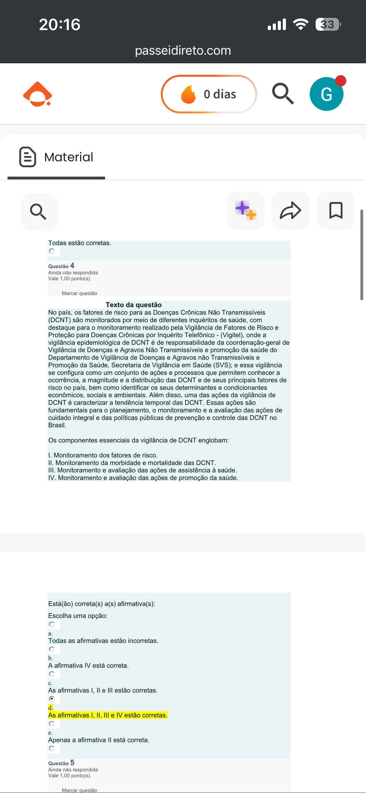 20:16 33 passeidireto.com 0 dias G Material Todas estão corretas. Questão 4 Ainda não respondida Vale 1,00 ponto(s). Marcar questão Texto da questão No país, os fatores de risco para as Doenças Crônicas Não Transmissíveis (DCNT) são monitorados por meio de diferentes inquéritos de saúde, com destaque para monitoramento realizado pela Vigilância de Fatores de Risco e Proteção para Doenças Crônicas por Inquérito Telefônico (Vigitel), onde a vigilância epidemiológica de DCNT é de responsabilidade da coordenação-geral de Vigilância de Doenças e Agravos Não Transmissíveis e promoção da saúde do Departamento de Vigilância de Doenças e Agravos não Transmissíveis e Promoção da Saúde, Secretaria de Vigilância em Saúde (SVS); e essa vigilância se configura como um conjunto de ações e processos que permitem conhecer a ocorrência, a magnitude e a distribuição das DCNT e de seus principais fatores de risco no país, bem como identificar os seus determinantes e condicionantes econômicos, sociais e ambientais. Além disso, uma das ações da vigilância de DCNT é caracterizar a tendência temporal das DCNT. Essas ações são fundamentais para planejamento, monitoramento e a avaliação das ações de cuidado integral e das políticas públicas de prevenção e controle das DCNT no Brasil. Os componentes essenciais da vigilância de DCNT englobam: I. Monitoramento dos fatores de risco. II. Monitoramento da morbidade e mortalidade das DCNT. III. Monitoramento e avaliação das ações de assistência à saúde. IV. Monitoramento e avaliação das ações de promoção da saúde. Está(ão) correta(s) a(s) afirmativa(s): Escolha uma opção: a. Todas as afirmativas estão incorretas. b. A afirmativa IV está correta. As afirmativas I, II e III estão corretas. d. As afirmativas I, II, III e IV estão corretas. e. Apenas a afirmativa está correta. Questão 5 Ainda não respondida Vale 1,00 ponto(s). Marcar questão