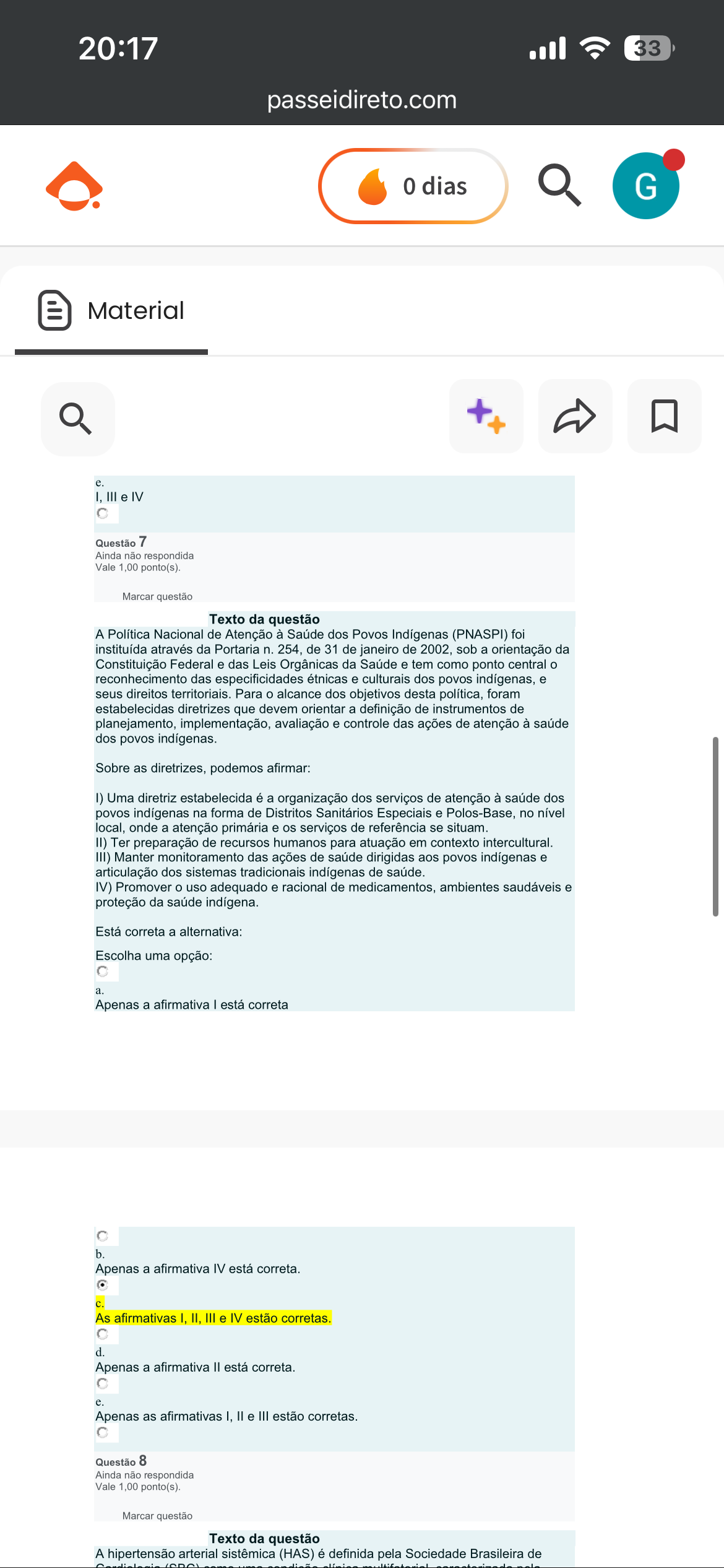 20:17 33 passeidireto.com 0 dias G Material e. I, III e IV Questão 7 Ainda não respondida Vale 1,00 ponto(s). Marcar questão Texto da questão A Política Nacional de Atenção à Saúde dos Povos Indígenas (PNASPI) foi instituída através da Portaria n. 254, de 31 de janeiro de 2002, sob a orientação da Constituição Federal e das Leis Orgânicas da Saúde e tem como ponto central reconhecimento das especificidades étnicas e culturais dos povos indígenas, e seus direitos territoriais. Para alcance dos objetivos desta política, foram estabelecidas diretrizes que devem orientar a definição de instrumentos de planejamento, implementação, avaliação e controle das ações de atenção à saúde dos povos indígenas. Sobre as diretrizes, podemos afirmar: I) Uma diretriz estabelecida é a organização dos serviços de atenção à saúde dos povos indígenas na forma de Distritos Sanitários Especiais e Polos-Base, no nível local, onde a atenção primária e os serviços de referência se situam. II) Ter preparação de recursos humanos para atuação em contexto intercultural. III) Manter monitoramento das ações de saúde dirigidas aos povos indígenas e articulação dos sistemas tradicionais indígenas de saúde. IV) Promover uso adequado e racional de medicamentos, ambientes saudáveis e proteção da saúde indígena. Está correta a alternativa: Escolha uma opção: a. Apenas a afirmativa está correta b. Apenas a afirmativa IV está correta. As afirmativas I, II, III e IV estão corretas. d. Apenas a afirmativa II está correta. e. Apenas as afirmativas I, II e III estão corretas. Questão 8 Ainda não respondida Vale 1,00 ponto(s). Marcar questão Texto da questão A hipertensão arterial sistêmica (HAS) é definida pela Sociedade Brasileira de