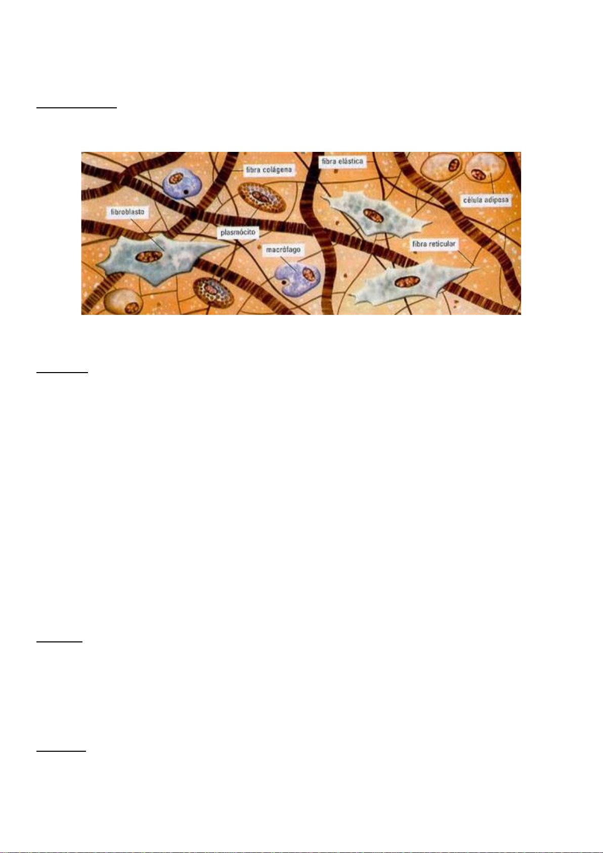 TECIDO CONJUNTIVO Constituição: diversos tipos de células separadas por abundante material intercelular: - fibras do tecido conjuntivo (colágenas, elásticas, reticulares) - matriz extracelular ou substância fundamental (gel de macromoléculas muito hidratadas). Funções: - sustentação - ex: tecido ósseo (tipo especial de tecido conjuntivo) - preenchimento - ex: tecido conjuntivo propriamente dito - armazenamento - ex: tecido adiposo (tipo especial de tecido conjuntivo) - transporte - ex: tecido sanguíneo (tipo especial de tecido conjuntivo) - defesa - por conter células fagocíticas , ex: macrófagos - reparação – por conter fibras de colágeno CÉLULAS DO TECIDO CONJUNTIVO 1– FIBROBLASTOS: É a célula mais comum no Tecido Conjuntivo. Possui prolongamentos citoplasmáticos irregulares, núcleo claro, grande e de forma ovoide Função: sintetiza fibras colágenas, elásticas e reticulares, bem como proteínas da matriz extra celular. 2- MACRÓFAGOS: Possui morfologia variável com superfície irregular e núcleo ovoide ou em forma de rim. Função: elementos de defesa (fagocitose e pinocitose). 3- MASTÓCITOS: São células grandes e globosas com núcleo esférico, central, grânulos citoplasmáticos escuros contendo: . heparina: substância anticoagulante . histamina: substância envolvida nos processos de reações alérgicas. É a principal célula responsável pelo choque anafilático. Função: A principal função dos mastócitos é armazenar potentes mediadores químicos da inflamação, como a heparina e a histamina citados anteriormente, participando das inflamações e alergias. 4- PLASMÓCITOS: São células pouco numerosos no tecido conjuntivo normal, de forma ovoide, núcleo esférico, excêntrico e com aspecto de uma roda de carroça. Estão presentes nas inflamações crônicas Função: produzem anticorpos. 5 – ADIPÓCITO: São células com pouco citoplasma, núcleo achatado e periférico. Função: armazenamento de energia (gorduras neutras ou triacilgliceróis). 6- CÉLULA MESENQUIMATOSA INDIFERENCIADA: Possuem forma de estrela ou fusiforme com núcleo grande e vesicular. Função: origina as demais células do Tecido Conjuntivo. 7- LEUCÓCITOS: O tecido conjuntivo normal contém leucócitos vindos do sangue. Mais frequentes: neutrófilos, eosinófilos, linfócitos. Fibras do Tecido Conjuntivo São elaboradas pelo fibroblasto no espaço intercelular. Classificação: colágenas, elásticas e reticulares. 1 - FIBRAS COLÁGENAS: São as mais frequentes. São brancas com estriações transversais, bastante sinuosas e alongadas e oferecem grande resistência à tração. Ex: tendões Locais: pele, ossos, cartilagem, músculo liso, lâmina basal. OBS: o colágeno representa 30% da proteína total do corpo. 2 - FIBRAS ELÁSTICAS: São produzidas por fibroblastos e por células musculares lisas dos vasos sanguíneos. São mais delgadas que as fibras colágenas, sem estriação longitudinal e de cor amarelada. Ramificam-se e ligam-se formando uma trama. Cedem facilmente a trações mínimas e retomam a forma inicial. Componente principal: elastina Localização: camada média das artérias Corante para visualização: orseína (coram-se mal em H.E.). 3 - FIBRAS RETICULARES OU ARGIRÓFILAS: São fibras colágenas de pequeno diâmetro e com estriações transversais. formam uma rede de colágeno que sustentam as células do baço, linfonodos e medula óssea (produtores de sangue) Têm afinidade por corantes a base de sais de prata: aparecem em negro. Não são visíveis em H.E. SUBSTÂNCIA FUNDAMENTAL AMORFA OU MATRIZ EXTRACELULAR É um gel incolor, hidratado e transparente que preenche o espaço entre as células e as fibras Classificação do Tecido Conjuntivo 1 - Tecido conjuntivo propriamente dito : - Tecido conjuntivo Frouxo - Tecido conjuntivo Denso: (Modelado e Não Modelado) 2 - Tecido conjuntivo elástico 3- Tecido conjuntivo reticular 4- Tecido conjuntivo mucoso 5- Tecido adiposo 6 -Tecido conjuntivo especializado : (cartilagem, ossos, sangue). 1 - TECIDO CONJUNTIVO PROPRIAMENTE DITO 1.1- Tecido conjuntivo frouxo: É o Tecido Conjuntivo mais comum no organismo. Preenche os espaços entre as fibras e feixes musculares. Apoia e nutre as células do tecido epitelial, forma uma camada em torno dos vasos sanguíneos e linfáticos, é um tecido flexível que oferece pouca resistência às trações. Constituição: principalmente por fibroblastos (90%) e macrófagos, fibras colágenas e elásticas. 2.1 – Tecido conjuntivo denso não modelado: Possui predomínio de fibras colágenas, cujos feixes não tem orientação fixa. É menos flexível, forma uma trama tridimensional que oferece certa resistência às trações. Locais: derme profunda da pele. 2.2- Tecido conjuntivo denso modelado: Apresenta feixes colágenos paralelos, de cor branca. Possui pouquíssimas células. São bastante resistentes às trações. Ex: tendões (estruturas cilíndricas que ligam os músculos esqueléticos aos ossos). TECIDO ADIPOSO Composto por células adiposas chamadas adipócitos. Função: fornecimento de energia, através do armazenamento de triglicerídeos, termorregulação ( produção de calor), isolante mecânico. Tipos de tecido adiposo: 1 - Tecido adiposo amarelo ou unilocular: cor amarelada, possuem células as com uma única gotícula de gordura que ocupa quase todo o citoplasma, é o tipo predominante no homem adulto, forma o panículo adiposo (sob a pele). Suas células são esféricas quando estão isoladas e poliédricas quando estão comprimidas. 2 - Tecido adiposo pardo ou multilocular: cor escura, abundante nos animais que hibernam, no feto e recém –nascido humano. Suas células são poligonais e menores que as do tecido adiposo comum e apresentam o citoplasma carregado de gotículas lipídicas de vários tamanhos. Função: produzir calor através da oxidação dos ácidos graxos.