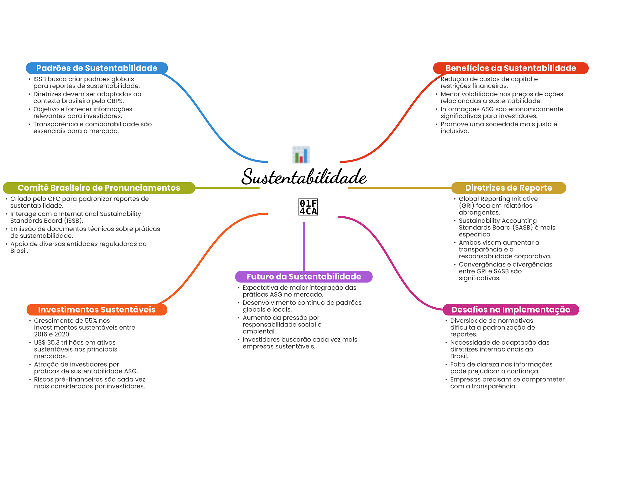 Padrões de Sustentabilidade Benefícios da Sustentabilidade ISSB busca criar padrões globais Redução de custos de capital e para reportes de sustentabilidade. restrições financeiras. Diretrizes devem ser adaptadas ao Menor volatilidade nos preços de ações contexto brasileiro pelo CBPS. relacionadas a sustentabilidade. Objetivo é fornecer informações Informações ASG são economicamente relevantes para investidores. significativas para investidores. Transparência e comparabilidade são Promove uma sociedade mais justa e essenciais para mercado. inclusiva. Sustentabilidade Comitê Brasileiro de Pronunciamentos Diretrizes de Reporte Criado pelo CFC para padronizar reportes de Global Reporting Initiative sustentabilidade. 01F (GRI) foca em relatórios Interage com International Sustainability 4CA abrangentes. Standards Board (ISSB). Sustainability Accounting Emissão de documentos técnicos sobre práticas Standards Board (SASB) é mais de sustentabilidade. específico. Apoio de diversas entidades reguladoras do Ambas visam aumentar a Brasil. transparência e a responsabilidade corporativa. Convergências e divergências entre GRI e SASB são Futuro da Sustentabilidade significativas. Expectativa de maior integração das práticas ASG no mercado. Desenvolvimento contínuo de padrões Investimentos Sustentáveis globais e locais. Desafios na Implementação Crescimento de 55% nos Aumento da pressão por Diversidade de normativas investimentos sustentáveis entre responsabilidade social e ambiental. dificulta a padronização de 2016 e 2020. reportes. US$ 35,3 trilhões em ativos Investidores buscarão cada vez mais Necessidade de adaptação das sustentáveis nos principais empresas sustentáveis. diretrizes internacionais ao mercados. Brasil. Atração de investidores por Falta de clareza nas informações práticas de sustentabilidade ASG. pode prejudicar a confiança. Riscos pré-financeiros são cada vez Empresas precisam se comprometer mais considerados por investidores. com a transparência.