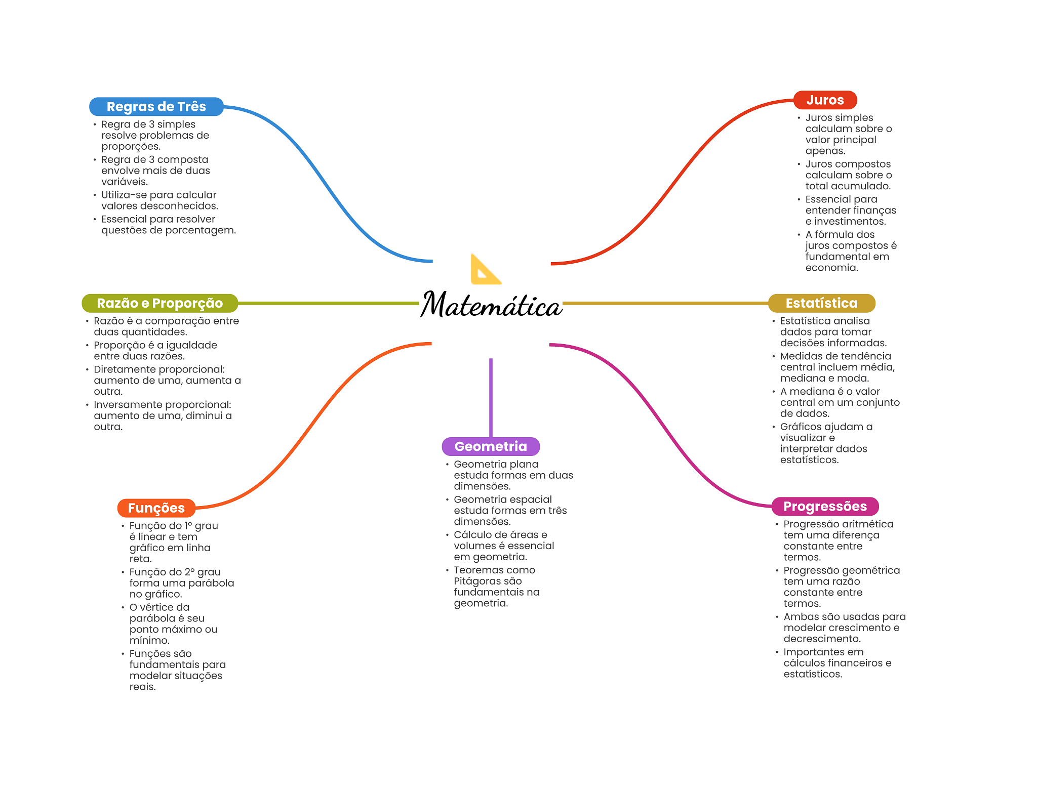 Juros Regras de Três Juros simples Regra de 3 simples calculam sobre resolve problemas de valor principal proporções. apenas. Regra de 3 composta Juros compostos envolve mais de duas calculam sobre variáveis. total acumulado. Utiliza-se para calcular Essencial para valores desconhecidos. entender finanças Essencial para resolver e investimentos. questões de porcentagem. A fórmula dos juros compostos é fundamental em economia. Razão e Proporção Matemática Estatística Razão é a comparação entre Estatística analisa duas quantidades. dados para tomar Proporção é a igualdade decisões informadas. entre duas razões. Medidas de tendência Diretamente proporcional: central incluem média, aumento de uma, aumenta a mediana e moda. outra. A mediana é valor Inversamente proporcional: central em um conjunto aumento de uma, diminui a de dados. outra. Gráficos ajudam a visualizar e Geometria interpretar dados estatísticos. Geometria plana estuda formas em duas dimensões. Geometria espacial Funções estuda formas em três Progressões Função do 1° grau dimensões. Progressão aritmética é linear e tem Cálculo de áreas e tem uma diferença gráfico em linha volumes é essencial constante entre reta. em geometria. termos. Função do 2° grau Teoremas como Progressão geométrica forma uma parábola Pitágoras são tem uma razão no gráfico. fundamentais na constante entre vértice da geometria. termos. parábola é seu Ambas são usadas para ponto máximo ou modelar crescimento e mínimo. decrescimento. Funções são Importantes em fundamentais para cálculos financeiros e modelar situações estatísticos. reais.