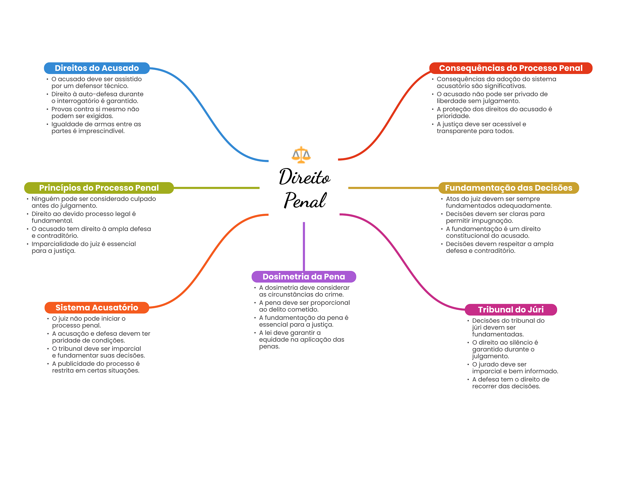 Direitos do Acusado Consequências do Processo Penal acusado deve ser assistido Consequências da adoção do sistema por um defensor técnico. acusatório são significativas. Direito à auto-defesa durante acusado não pode ser privado de interrogatório é garantido. liberdade sem julgamento. Provas contra si mesmo não A proteção dos direitos do acusado é podem ser exigidas. prioridade. Igualdade de armas entre as A justiça deve ser acessível e partes é imprescindível. transparente para todos. Direito Princípios do Processo Penal Fundamentação das Decisões Ninguém pode ser considerado culpado antes do julgamento. Penal Atos do juiz devem ser sempre fundamentados adequadamente. Direito ao devido processo legal é Decisões devem ser claras para fundamental. permitir impugnação. acusado tem direito à ampla defesa A fundamentação é um direito e contraditório. constitucional do acusado. Imparcialidade do juiz é essencial Decisões devem respeitar a ampla para a justiça. defesa e contraditório. Dosimetria da Pena A dosimetria deve considerar as circunstâncias do crime. A pena deve ser proporcional Sistema Acusatório ao delito cometido. Tribunal do Júri juiz não pode iniciar A fundamentação da pena é Decisões do tribunal do processo penal. essencial para a justiça. júri devem ser A acusação e defesa devem ter A lei deve garantir a fundamentadas. paridade de condições. equidade na aplicação das direito ao silêncio é tribunal deve ser imparcial penas. garantido durante e fundamentar suas decisões. julgamento. A publicidade do processo é O jurado deve ser restrita em certas situações. imparcial e bem informado. A defesa tem direito de recorrer das decisões.