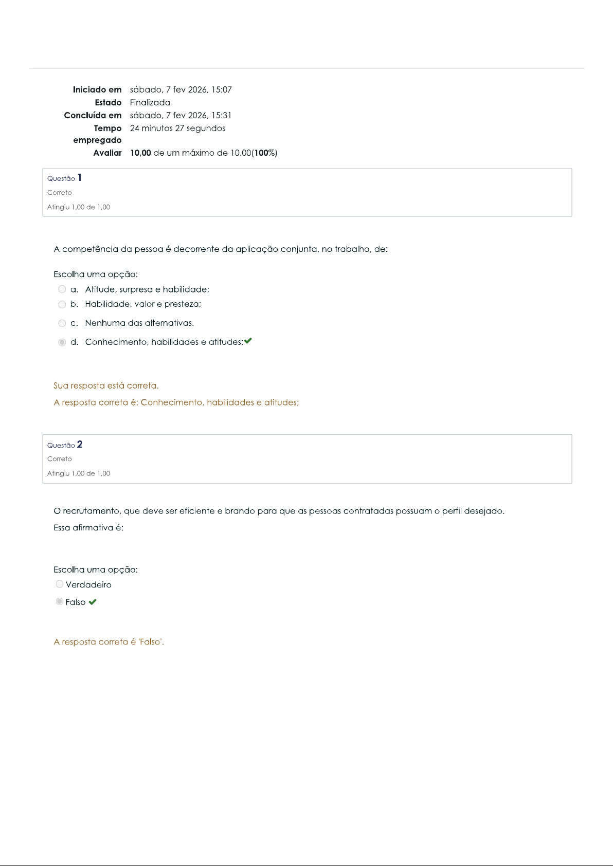Iniciado em sábado, 7 fev 2026, 15:07 Estado Finalizada Concluída em sábado, 7 fev 2026, 15:31 Tempo 24 minutos 27 segundos empregado Avaliar 10,00 de um máximo de 10,00(100%) Questão 1 Correto Atingiu 1,00 de 1,00 A competência da pessoa é decorrente da aplicação conjunta, no trabalho, de: Escolha uma opção: a. Atitude, surpresa e habilidade; b. Habilidade, valor e presteza; C. Nenhuma das alternativas. d. Conhecimento, habilidades e atitudes; Sua resposta está correta. A resposta correta é: Conhecimento, habilidades e atitudes; Questão 2 Correto Atingiu 1,00 de 1,00 recrutamento, que deve ser eficiente e brando para que as pessoas contratadas possuam perfil desejado. Essa afirmativa é: Escolha uma opção: Verdadeiro Falso A resposta correta é 'Falso'.Questão 3 Correto Atingiu 1,00 de 1,00 recrutamento, que deve ser eficiente e brando para que as pessoas contratadas possuam perfil desejado. Essa afirmativa é: Escolha uma opção: Verdadeiro Falso A resposta correta é 'Falso'. Questão 4 Correto Atingiu 1,00 de 1,00 Qualidades (boas) do chefe: Escolha uma opção: a. pedante, paroleiro. b. ouvinte, empático. C. centralizador, megalomaníaco. d. pedante, arrogante. Sua resposta está correta. A resposta correta é: ouvinte, empático. Questão 5 Correto Atingiu 1,00 de 1,00 A prova escrita pode ter várias formas: dissertações, perguntas fechadas, perguntas abertas, estudo de caso etc. Escolha uma opção: Verdadeiro Falso A resposta correta é 'Verdadeiro'.Questão 6 Correto Atingiu 1,00 de 1,00 A partir de que ano surgiu direito de greve e a necessidade de ter nas organizações um departamento de pessoal com funções de recrutamento, seleção, treinamento e remuneração? Escolha uma opção: a. 1942. b. 1949. C. 1946. d. 1947. Sua resposta está correta. A resposta correta é: 1946. Questão 7 Correto Atingiu 1,00 de 1,00 A prova escrita pode ter várias formas: dissertações, perguntas fechadas, perguntas abertas, estudo de caso etc. Escolha uma opção: Verdadeiro Falso A resposta correta é 'Verdadeiro'. Questão 8 Correto Atingiu 1,00 de 1,00 levantamento de necessidades de treinamento pode ser feito nos seguintes níveis de análise: Escolha uma opção: a. Análise da estrutura de cargos, Análise do treinamento, Abordagem Tradicional, Análise Curricular. b. Análise organizacional, Análise dos recursos humanos, Análise Curricular, Análise do treinamento. C. Análise organizacional, Abordagem Tradicional, Análise da estrutura de cargos, Análise do treinamento. d. Análise organizacional, Análise dos recursos humanos, Análise da estrutura de cargos, Análise do treinamento. Sua resposta está correta. A resposta correta é: Análise organizacional, Análise dos recursos humanos, Análise da estrutura de cargos, Análise do treinamento.Questão 9 Correto Atingiu 1,00 de 1,00 Qualidades (boas) do chefe: Escolha uma opção: a. ouvinte, empático. b. pedante, paroleiro. C. pedante, arrogante. d. centralizador, megalomaníaco. Sua resposta está correta. A resposta correta é: ouvinte, empático. Questão 10 Correto Atingiu 1,00 de 1,00 Assinale a alternativa correta. "As provas de conhecimento passíveis de serem aplicadas no setor público são: provas práticas, provas escritas (geralmente eliminatórias) e provas de títulos (geralmente A prova prática é mais usada em cargos de natureza operacional, servindo também para seleções de cargos administrativos e para cargos de professores" III "A prova escrita pode ter várias formas: dissertações, perguntas fechadas, perguntas abertas, estudo de caso etc". IV "As provas de concurso geralmente são compostas de questões fechadas, cujas respostas constam de um gabarito para correção e transparência do processo". Escolha uma opção: a. e III. b. Todas as opções estão corretas. C. e IV. d. le IV. Sua resposta está correta. A resposta correta é: Todas as opções estão corretas.