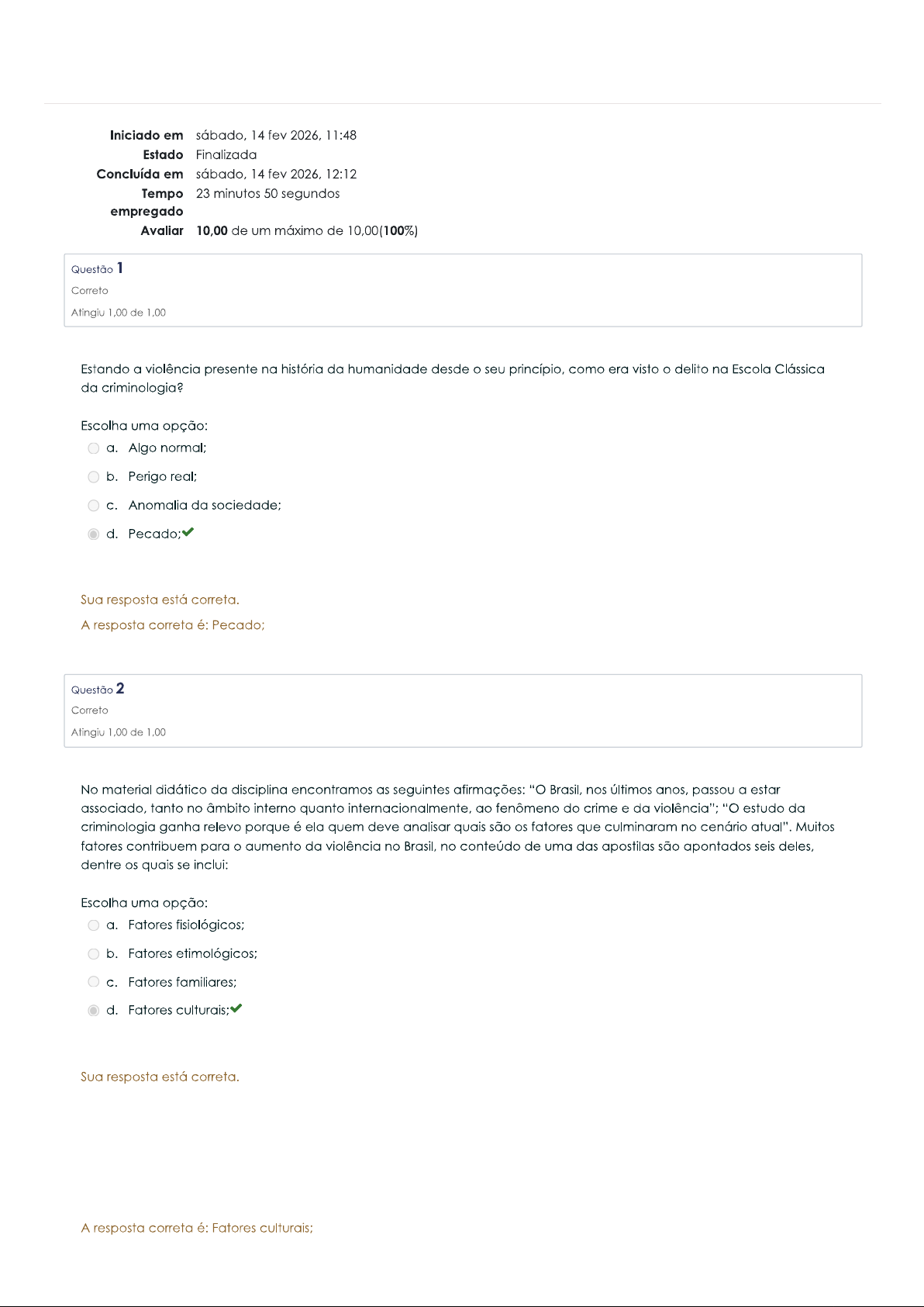 Iniciado em sábado, 14 fev 2026, 11:48 Estado Finalizada Concluída em sábado, 14 fev 2026, 12:12 Tempo 23 minutos 50 segundos empregado Avaliar 10,00 de um máximo de 10,00(100%) Questão 1 Correto Atingiu 1,00 de 1,00 Estando a violência presente na história da humanidade desde seu princípio, como era visto delito na Escola Clássica da criminologia? Escolha uma opção: a. Algo normal; b. Perigo real; C. Anomalia da sociedade; d. Pecado; Sua resposta está correta. A resposta correta é: Pecado; Questão 2 Correto Atingiu 1,00 de 1,00 No material didático da disciplina encontramos as seguintes afirmações: "O Brasil, nos últimos anos, passou a estar associado, tanto no âmbito interno quanto ao fenômeno do crime e da violência"; "O estudo da criminologia ganha relevo porque é ela quem deve analisar quais são os fatores que culminaram no cenário atual". Muitos fatores contribuem para aumento da violência no Brasil, no conteúdo de uma das apostilas são apontados seis deles, dentre quais se inclui: Escolha uma opção: a. Fatores fisiológicos; b. Fatores etimológicos; C. Fatores familiares; d. Fatores culturais; Sua resposta está correta. A resposta correta é: Fatores culturais;Questão 3 Correto Atingiu 1,00 de 1,00 Segundo conteúdos etudados, considerando exclusivamente a perspectiva técnico-jurídica, que é crime? Escolha uma opção: a. Um fenômeno social. b. Ação atípica, antissocial, dolosa e punível. C. Conduta do ser humano, não aceita pela sociedade. d. Ação típica, antijurídica, culpável e punível. Sua resposta está correta. A resposta correta é: Ação típica, antijurídica, culpável e punível. Questão 4 Correto Atingiu 1,00 de 1,00 Movimento científico iniciado na década de 60, caracterizado por não se concentrar mais nos motivos que levam agente a delinquir, mas nos critérios utilizados pelos órgãos de controle como responsáveis pela produção normativa e por sua aplicação. Escolha uma opção: a. Criminologia social. b. Criminologia positivista ou tradicional. C. Criminologia crítica ou nova criminologia. d. Tolerância zero "janelas quebradas". Sua resposta está correta. A resposta correta é: Criminologia crítica nova criminologia.Questão 5 Correto Atingiu 1,00 de 1,00 A importância do estudo da criminologia vem ganhando relevância nos últimos anos. Segundo conteúdo estudado, quais os motivos para a ascensão da criminologia? Escolha uma opção: a. incremento de complexas redes criminais e crescimento do terrorismo. b. reconhecimento da Criminologia como uma ciência capaz de solucionar complexos fenômenos criminais da atualidade. C. aumento da violência urbana e crescimento gradativo da população carcerária e do caos dos penais. d. aumento da divulgação de informações sobre a corrupção e a impunidade. Sua resposta está correta. A resposta correta é: aumento da violência urbana e crescimento gradativo da população carcerária e do caos dos estabelecimentos penais. Questão 6 Correto Atingiu 1,00 de 1,00 Qual a posição da Criminologia Clássica quanto ao comportamento do criminoso? Escolha uma opção: a. criminoso age movido por uma força maior, segundo seu destino. b. criminoso age por instinto, dominado por fatores biológicos. C. criminoso age influenciado por regras sociais. d. criminoso age por livre escolha, pois é detentor de livre arbítrio. Sua resposta está correta. A resposta correta é: criminoso age por livre escolha, pois é detentor de livre arbítrio.Questão 7 Correto Atingiu 1,00 de 1,00 A Escola de Chicago, precursora da teoria Broken Windows, origina a ideia da: Escolha uma opção: a. Tolerância zero. b. Criminalidade na cidade. C. Criminalidade zero. d. Cidades sem crime. Sua resposta está correta. A resposta correta é: Tolerância zero. Questão 8 Correto Atingiu 1,00 de 1,00 Além da Criminologia, diversos outros campos de conhecimento utilizam a violência como objeto de estudo, entre eles se incluem: Escolha uma opção: a. Epidemiologia, Filosofia e Comunicação e Literatura; b. Biologia, Matemática, Física e Química; C. Biologia, Epidemiologia, Economia e Ciência Política; d. Ciência Política, Literatura, Artes e Música; Sua resposta está correta. A resposta correta é: Biologia, Epidemiologia, Economia e Ciência Política;Questão 9 Correto Atingiu 1,00 de 1,00 Criminologista italiano que descreveu a figura do "criminoso nato": Escolha uma opção: a. Eugenio Zaffaroni. b. Enrico Ferri. C. Antonio Garcia-Pablos de Molina. d. Cesare Lombroso. Sua resposta está correta. A resposta correta é: Cesare Lombroso. Questão 10 Correto Atingiu 1,00 de 1,00 Entre os objetivos das estratégias de prevenção NÃO se inclui: Escolha uma opção: a. Modificar fatores estruturais ou proximais; b. Modificar fatores sociais ou situacionais; C. Modificar fatores específicos de riscos e/ou proteção ou modificar um conjunto de fatores; d. Modificar fatores primários ou biológicos; Sua resposta está correta. A resposta correta é: Modificar fatores primários ou biológicos;