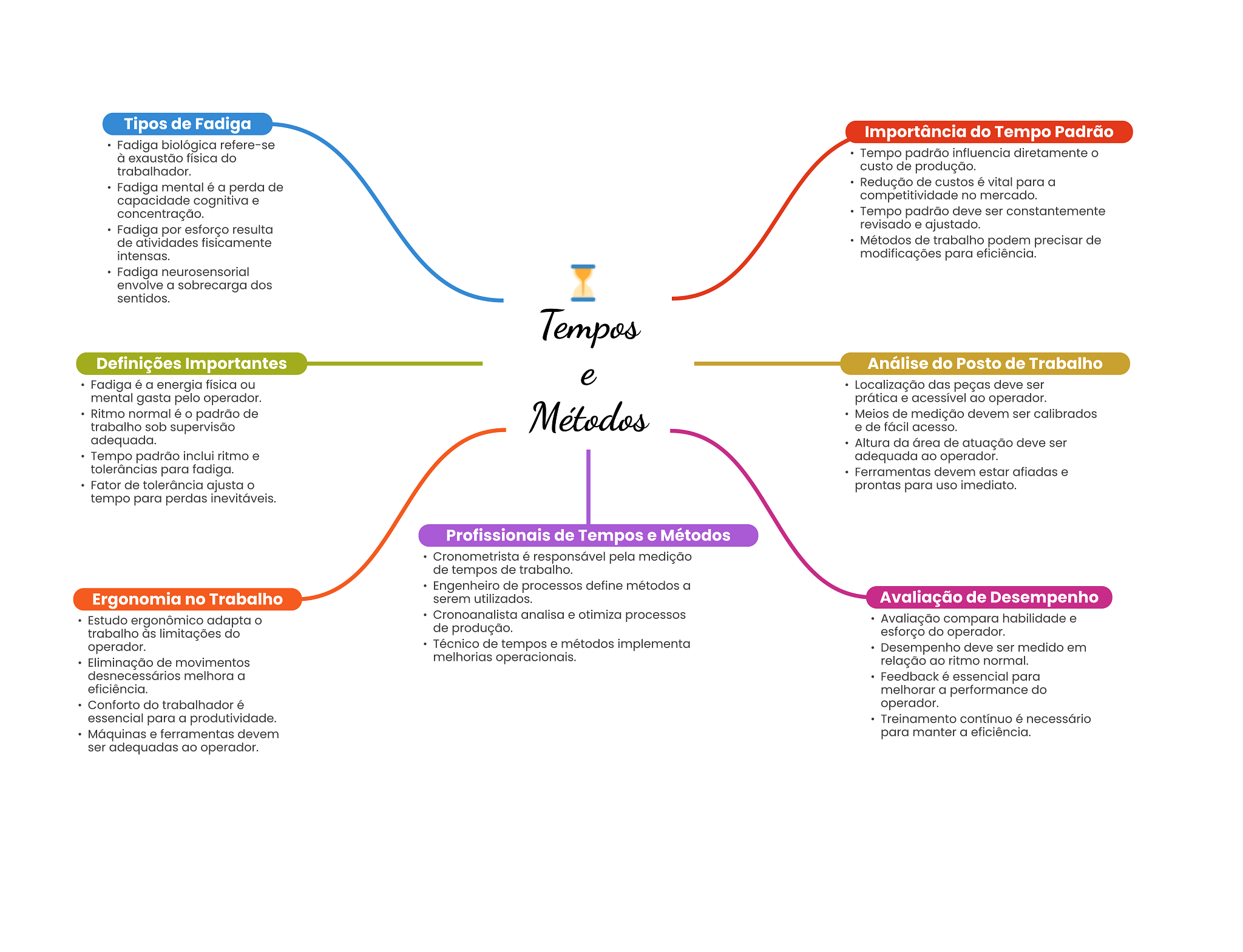 Tipos de Fadiga Importância do Tempo Padrão Fadiga biológica refere-se à exaustão física do Tempo padrão influencia diretamente o trabalhador. custo de produção. Fadiga mental é a perda de Redução de custos é vital para a capacidade cognitiva e competitividade no mercado. concentração. Tempo padrão deve ser constantemente Fadiga por esforço resulta revisado e ajustado. de atividades fisicamente Métodos de trabalho podem precisar de intensas. modificações para eficiência. Fadiga neurosensorial envolve a sobrecarga dos I sentidos. Tempos Definições Importantes Análise do Posto de Trabalho Fadiga é a energia física ou e Localização das peças deve ser mental gasta pelo operador. prática e acessível ao operador. Ritmo normal é padrão de Métodos Meios de medição devem ser calibrados trabalho sob supervisão e de fácil acesso. adequada. Altura da área de atuação deve ser Tempo padrão inclui ritmo e adequada ao operador. tolerâncias para fadiga. Ferramentas devem estar afiadas e Fator de tolerância ajusta prontas para uso imediato. tempo para perdas inevitáveis. Profissionais de Tempos e Métodos Cronometrista é responsável pela medição de tempos de trabalho. Engenheiro de processos define métodos a Ergonomia no Trabalho serem utilizados. Avaliação de Desempenho Estudo ergonômico adapta Cronoanalista analisa e otimiza processos Avaliação compara habilidade e trabalho às limitações do de produção. esforço do operador. operador. Técnico de tempos e métodos implementa Desempenho deve ser medido em Eliminação de movimentos melhorias operacionais. relação ao ritmo normal. desnecessários melhora a Feedback é essencial para eficiência. melhorar a performance do Conforto do trabalhador é operador. essencial para a produtividade. Treinamento contínuo é necessário Máquinas e ferramentas devem para manter a eficiência. ser adequadas ao operador.