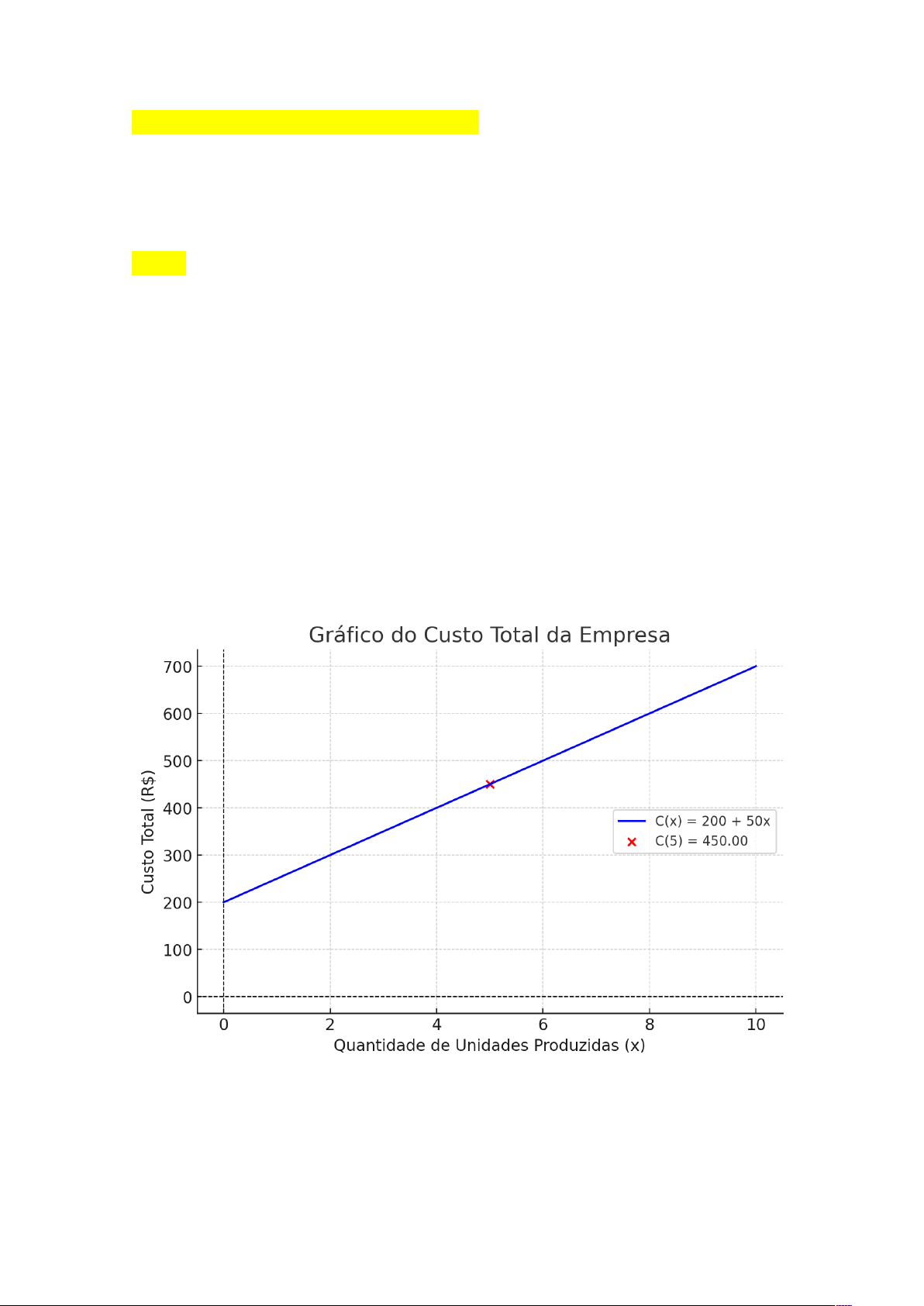 O custo total da empresa é dado por: C (x) = 200 + 50x Onde: 200 é o custo fixo, 50x é o custo variável, dependendo da quantidade x de unidades produzidas. Custo para 5 unidades produzidas: Substituímos x=5 na equação: C(5) = 200 + 50(5) = 200 + 250 = 450 Representando graficamente a função temos o seguinte: Aqui está o custo total da empresa, representando a função C(x) = 200 + 50x. O ponto em vermelho indica o custo total para 5 unidades produzidas, que é C(5) = R$450,00. image1.png