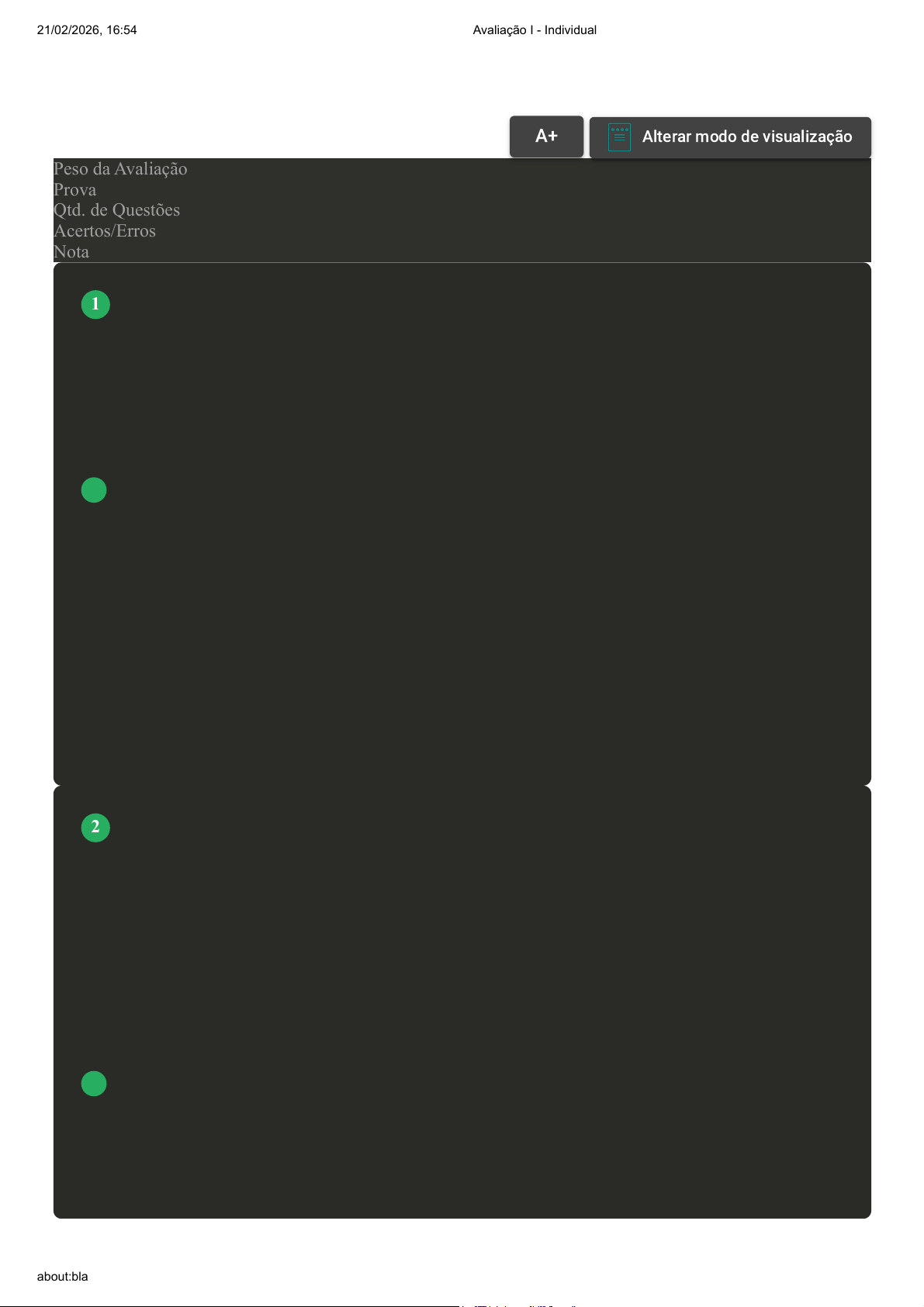Prova Impressa GABARITO | Avaliação I - Individual (Cod.:1601091) Peso da Avaliação 1,50 Prova 114236194 Qtd. de Questões 10 Acertos/Erros 10/0 Nota 10,00 Existe uma contrução de três resistências elétricas, RA, RB e RC, com fios de mesmo comprimento e com as seguintes características: o fio de RA tem resistividade 1,0·10–6 Ω·m e diâmetro de 0,50 mm; o fio de RB tem resistividade 1,2·10–6 Ω·m e diâmetro de 0,50 mm; e o fio de RC tem resistividade 1,5·10–6 Ω·m e diâmetro de 0,40 mm. Sobre o exposto, assinale a alternativa CORRETA: A RC > RB > RA. B RB > RA > RC. C RA > RB > RC. D RB > RC > RA. Em uma seção transversal de um fio condutor, circula uma carga de 20 C a cada 2 s, existindo uma intensidade de corrente através desse condutor. Sobre a intensidade de corrente através desse condutor, assinale a alternativa CORRETA: A 20 A. B 8 A. C 10 A. D 15 A. VOLTAR A+Aumentar, FonteAlterar modo de visualização 1 2 21/02/2026, 16:54 Avaliação I - Individual about:blank 1/6 Um estudante deseja adquirir um chuveiro elétrico que será ligado a um circuito sobre tensão de 220 V. Sabemos que a máxima corrente tolerada por esse circuito é de 30 A. Sobre a máxima potência que pode ter o chuveiro, assinale a alternativa CORRETA: A 66 W. B 60 kW. C 6600 W. D 300 W. [Laboratório Virtual – Lei de Ohm] O multímetro tem dois terminais, geralmente um preto e outro vermelho. Na prática, o fio preto deve permanecer sempre conectado ao conector COM (comum), enquanto o fio vermelho deve ser colocado no conector V/Ω para medir tensões ou resistências, ou em um dos pinos do amperímetro para medir correntes. A figura a seguir apresenta esses procedimentos: Com relação à determinação dos valores de tensão, da corrente e da resistência elétrica determinados neste experimento através do multímetro, analise as afirmativas a seguir: I- Para medir a tensão entre dois pontos no circuito, o multímetro deve ser colocado em paralelo em relação a esses pontos. II- Para medir a intensidade (ou corrente) que flui através de um ramo do circuito, o multímetro deve estar em série com ele. III- Com relação à medida da resistência, os bornes do multímetro devem se posicionados em paralelo, no mesmo resistor, para que se possa fazer a medição de um único resistor por vez. A fonte de alimentação deve estar desligada e o circuito aberto. IV- Para se efetuar a medida da resistência, os bornes devem ser posicionados em série, no mesmo resistor, para que possa fazer a medição de um único resistor por vez. A fonte de alimentação deve estar ligada e o circuito aberto. Assinale a alternativa CORRETA: 3 4 21/02/2026, 16:54 Avaliação I - Individual about:blank 2/6 Fonte: https://www.ugr.es/~fteorica/Docencia/Laboratorio/Web_Labo_FisicaGeneral/guiones/Ing/3_Ley_Ohm.pdf. Acesso em: 2 jan. 2023. A As afirmativas II e IV estão corretas. B As afirmativas I, II e IV estão corretas. C As afirmativas III e IV estão corretas. D As afirmativas I, II e III estão corretas. O campo magnético é produzido pela corrente que flui pela bobina de um outro campo. Sobre esse outro campo, assinale a alternativa CORRETA: A Estator ou resistivo. B Estacionário ou magnético. C Estacionário ou alternado. D Estacionário ou estator. Ao aplicarmos uma diferença de potencial de 9,0 V em um resistor de 3,0 Ω, podemos dizer que a corrente elétrica fluindo pelo resistor e a potência dissipada, respectivamente, possuem dois valores. Sobre esses valores, assinale a alternativa CORRETA: A 4 A e 36 W. B 2 A e 18 W. C 1 A e 9 W. 5 6 21/02/2026, 16:54 Avaliação I - Individual about:blank 3/6 D 3 A e 27 W. A potência elétrica é capaz de determinar a energia dissipada por um resistor em um determinado tempo. Considere que uma lâmpada de 30W fica ligada durante um tempo de 10 horas. Assinale a alternativa CORRETA que indica quantos quilowatts-hora são consumidos por esta lâmpada: A 300 kWh. B 30 kWh. C 3 kWh. D 0,3 kWh. Uma das mais importantes formas de produção de energia elétrica, em nossa vida cotidiana, é proveniente de processos de transformação que envolvem a obtenção dessa energia pelo movimento. A construção de geradores de energia elétrica baseia-se nos estudos de Faraday, que observou correntes elétricas (induzidas) em circuitos fechados, sem que pilhas ou baterias estivessem conectadas neles. As figuras a seguir representam, esquematicamente, situações fundamentais para a compreensão das condições necessárias para a obtenção de corrente elétrica induzida. Sobre quando as correntes elétricas induzidas aparecem em um circuito fechado, analise as sentenças a seguir: I- Um ímã ou uma bobina permanecem parados próximos ao circuito. II- Um ímã ou um eletroímã movem-se na região do circuito. III- Ocorrem variações, com o tempo, do campo magnético na região do circuito. 7 8 21/02/2026, 16:54 Avaliação I - Individual about:blank 4/6 Assinale a alternativa CORRETA: A As sentenças II e III estão corretas. B Somente a sentença I está correta. C As sentenças I e III estão corretas. D As sentenças I e II estão corretas. Um resistor ôhmico de resistência elétrica igual a 20 Ω é atravessado por uma corrente elétrica de 0,15 A. Sobre a quantidade de energia elétrica dissipada por esse resistor a cada segundo, assinale a alternativa CORRETA: A 1 W. 9 21/02/2026, 16:54 Avaliação I - Individual about:blank 5/6 B 0,45 W. C 0,75 W. D 3 W. [Laboratório Virtual – Associação de resistores] No laboratório virtual sobre associação de resistores, você utilizou um painel elétrico que continha os componentes que constituem o circuito elétrico: interruptor (chave de ligação), fio condutor (por onde a corrente elétrica é conduzida), resistência elétrica (lâmpadas) e fonte de tensão (alimentação do circuito). Em uma das simulações você organizou os resistores (lâmpadas) um após o outro no circuito elétrico, como os ant