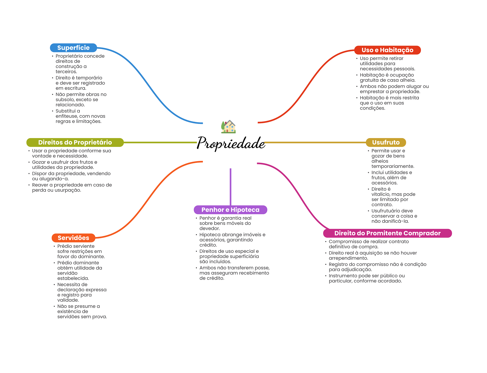 Superfície Uso e Habitação Proprietário concede direitos de Uso permite retirar utilidades para construção a terceiros. necessidades pessoais. Habitação é ocupação Direito é temporário gratuita de casa alheia. e deve ser registrado em escritura. Ambos não podem alugar ou Não permite obras no emprestar a propriedade. subsolo, exceto se Habitação é mais restrita relacionado. que uso em suas Substitui a condições. enfiteuse, com novas regras e limitações. Direitos do Proprietário Propriedade Usufruto Usar a propriedade conforme sua Permite usar e vontade e necessidade. gozar de bens Gozar e usufruir dos frutos e alheios utilidades da propriedade. temporariamente. Dispor da propriedade, vendendo Inclui utilidades e ou alugando-a. frutos, além de Reaver a propriedade em caso de acessórios. perda ou usurpação. Direito é vitalício, mas pode ser limitado por contrato. Penhor e Hipoteca Usufrutuário deve Penhor é garantia real conservar a coisa e sobre bens móveis do não danificá-la. devedor. Hipoteca abrange imóveis e Direito do Promitente Comprador Servidões acessórios, garantindo Compromisso de realizar contrato Prédio serviente crédito. definitivo de compra. sofre restrições em Direitos de uso especial e Direito real à aquisição se não houver favor do dominante. propriedade superficiária arrependimento. Prédio dominante são incluídos. Registro do compromisso não é condição obtém utilidade da Ambos não transferem posse, para adjudicação. servidão mas asseguram recebimento estabelecida. de crédito. Instrumento pode ser público ou particular, conforme acordado. Necessita de declaração expressa e registro para validade. Não se presume a existência de servidões sem prova.