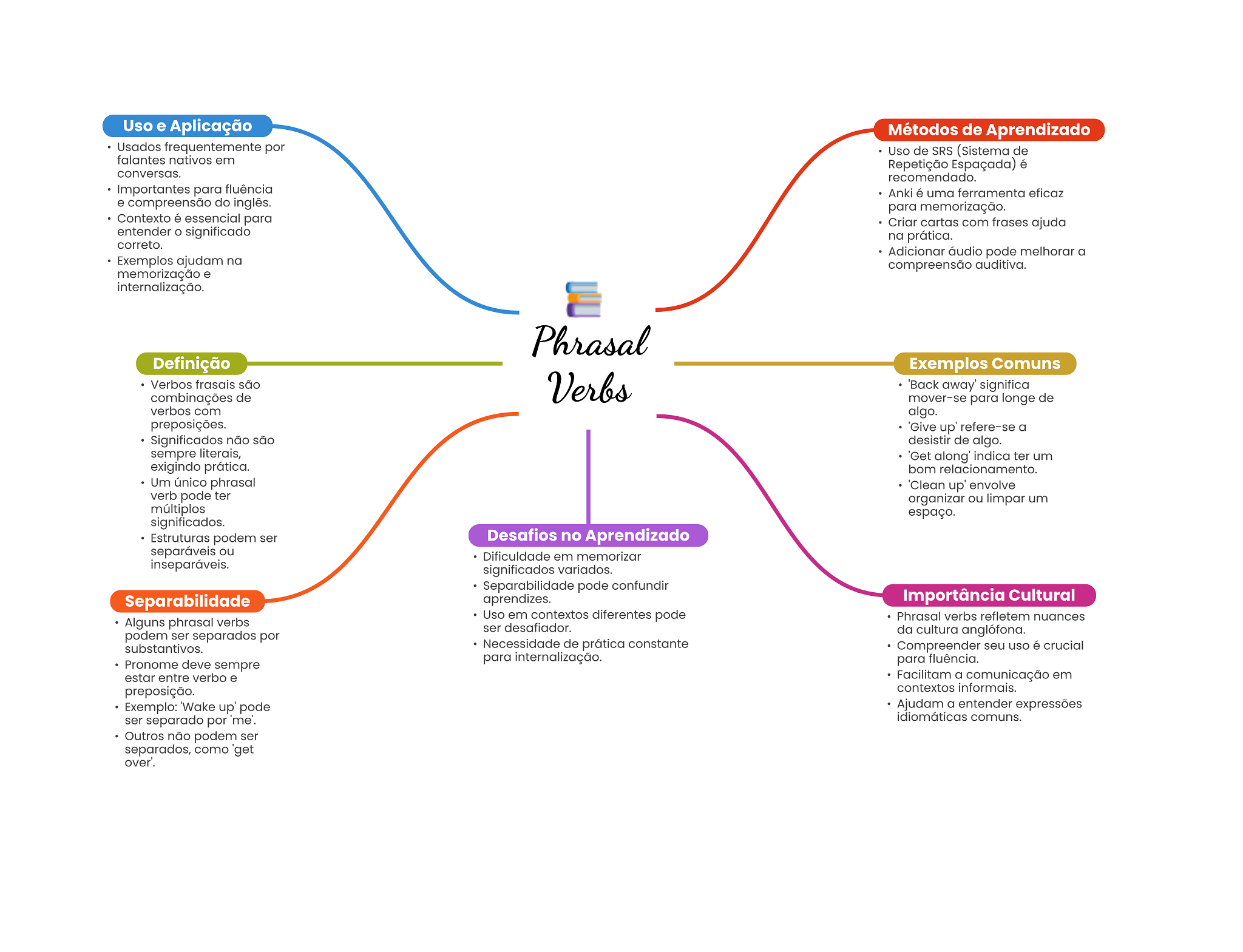 Uso e Aplicação Métodos de Aprendizado Usados frequentemente por Uso de SRS (Sistema de falantes nativos em Repetição Espaçada) é conversas. recomendado. Importantes para fluência Anki é uma ferramenta eficaz e compreensão do inglês. para memorização. Contexto é essencial para Criar cartas com frases ajuda entender significado na prática. correto. Adicionar áudio pode melhorar a Exemplos ajudam na compreensão auditiva. memorização e internalização. Phrasal Definição Exemplos Comuns Verbos frasais são Verbs 'Back away' significa combinações de mover-se para longe de verbos com algo. preposições. 'Give up' refere-se a Significados não são desistir de algo. sempre literais, 'Get along' indica ter um exigindo prática. bom relacionamento. Um único phrasal 'Clean up' envolve verb pode ter organizar ou limpar um múltiplos espaço. significados. Estruturas podem ser Desafios no Aprendizado separáveis ou Dificuldade em memorizar inseparáveis. significados variados. Separabilidade pode confundir Separabilidade aprendizes. Importância Cultural Uso em contextos diferentes pode Phrasal verbs refletem nuances Alguns phrasal verbs ser desafiador. podem ser separados por da cultura anglófona. substantivos. Necessidade de prática constante Compreender seu uso é crucial para internalização. Pronome deve sempre para fluência. estar entre verbo e Facilitam a comunicação em preposição. contextos informais. Exemplo: up' pode Ajudam a entender expressões ser separado por 'me'. idiomáticas comuns. Outros não podem ser separados, como over'.