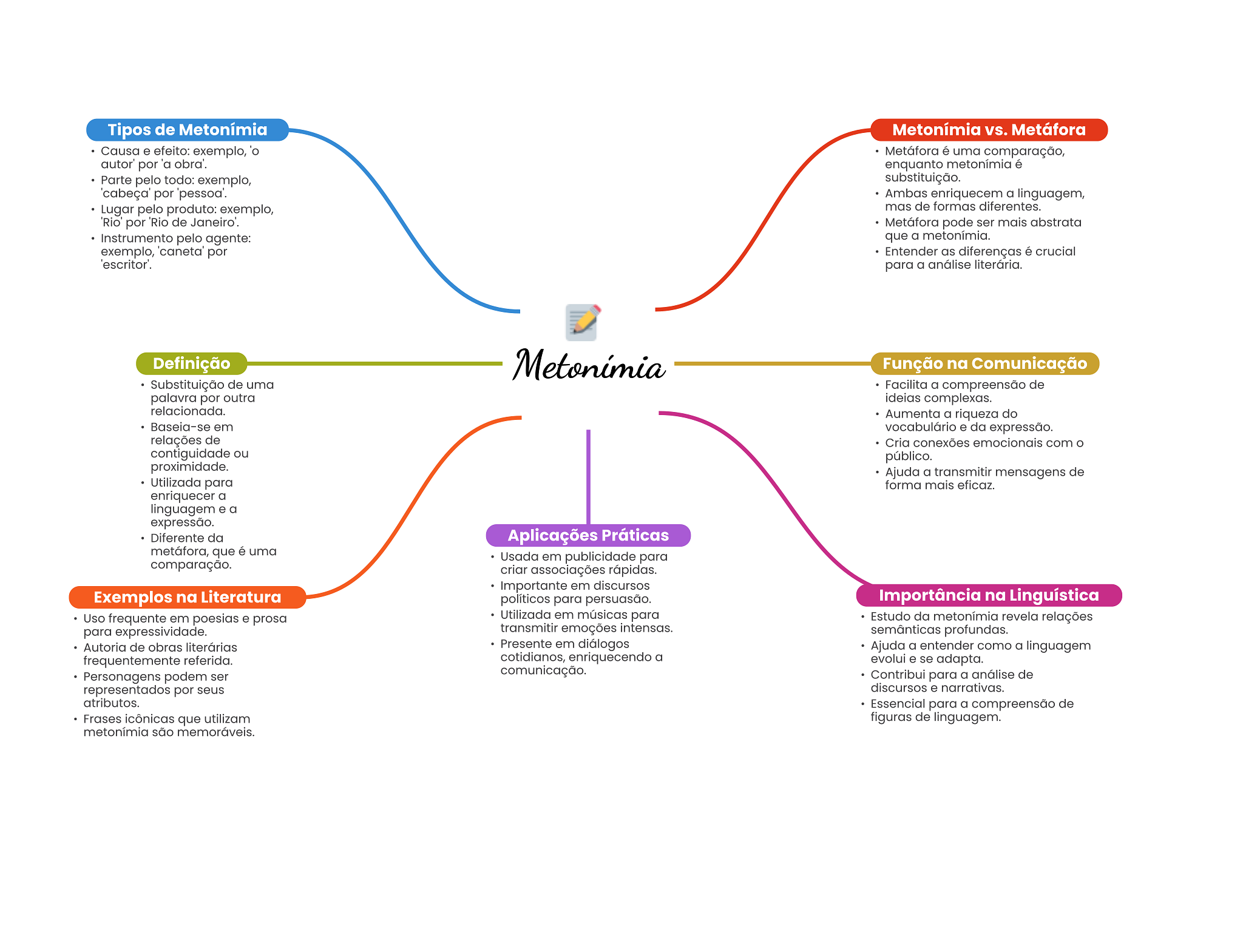 Tipos de Metonímia Metonímia vs. Metáfora Causa e efeito: exemplo, 'o Metáfora é uma comparação, por 'a obra'. enquanto metonímia é Parte pelo todo: exemplo, substituição. por 'pessoa'. Ambas enriquecem a linguagem, Lugar pelo produto: exemplo, mas de formas diferentes. 'Rio' por 'Rio de Janeiro'. Metáfora pode ser mais abstrata Instrumento pelo agente: que a metonímia. exemplo, por Entender as diferenças é crucial para a análise literária. Definição Função na Comunicação Substituição de uma Facilita a compreensão de palavra por outra ideias complexas. relacionada. Aumenta a riqueza do Baseia-se em vocabulário e da expressão. relações de Cria conexões emocionais com contiguidade ou público. proximidade. Ajuda a transmitir mensagens de Utilizada para forma mais eficaz. enriquecer a linguagem e a expressão. Diferente da Aplicações Práticas metáfora, que é uma Usada em publicidade para comparação. criar associações rápidas. Importante em discursos Exemplos na Literatura políticos para persuasão. Importância na Linguística Uso frequente em poesias e prosa Utilizada em músicas para Estudo da metonímia revela relações para expressividade. transmitir emoções intensas. semânticas profundas. Autoria de obras literárias Presente em diálogos Ajuda a entender como a linguagem frequentemente referida. cotidianos, enriquecendo a evolui e se adapta. Personagens podem ser comunicação. Contribui para a análise de representados por seus discursos e narrativas. atributos. Essencial para a compreensão de Frases icônicas que utilizam figuras de linguagem. metonímia são memoráveis.