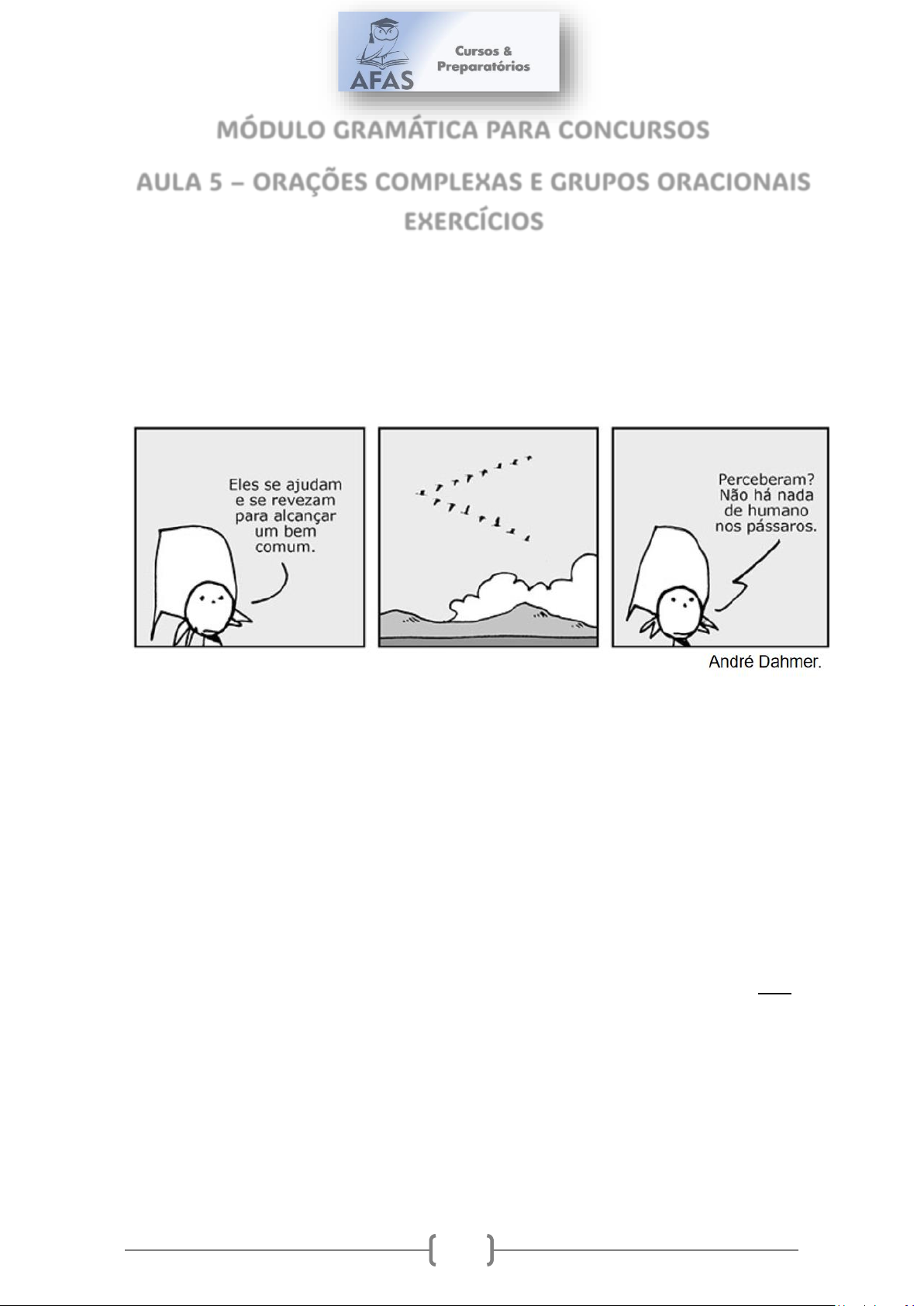 1 MÓDULO GRAMÁTICA PARA CONCURSOS AULA 5 – ORAÇÕES COMPLEXAS E GRUPOS ORACIONAIS EXERCÍCIOS 1. “Sem pedir licença, pegou o cartaz e com o giz escreveu outro conceito”; a oração “Sem pedir licença” pode ser adequadamente substituída pela seguinte oração desenvolvida: A) Sem que pedisse licença; B) Sem o pedido de licença; C) Sem que peça licença; D) Sem a petição de licença; E) Sem que havia pedido licença. Leia a tira para responder às questões de números 2 e 3 2. É correto concluir, a partir da leitura da tira, que o autor faz uma crítica ao que ele considera ser uma característica dos A) humanos: trabalharem em conjunto com vistas a um objetivo comum, que beneficie a todos os membros do grupo. B) pássaros: agirem de modo muito parecido com as ações humanas no que diz respeito ao bem- estar do grupo. C) humanos: em vez de se ajudarem, tendo em vista o bem comum de todo o grupo, comportam- se como os pássaros. D) pássaros: não serem capazes de imitar as ações dos homens, já que estes são exemplares quanto ao trabalho em grupo. E) humanos: atuarem de modo individualista, não se organizando para trabalhar em grupo, em busca de um bem comum. 3. O termo destacado na fala do primeiro quadrinho — Eles se ajudam e se revezam para alcançar um bem comum. — expressa A) condição. B) proporção. C) concessão. D) finalidade. E) conformidade. 2 4. Assinale a alternativa em que a expressão sublinhada é transformada, mas mantendo seu sentido original. A) A redução da disponibilidade hídrica intensificará a disputa pela água por seus usuários. A redução da disponibilidade hídrica fará os usuários disputarem a intensificação da água. B) Os empregos são altamente dependentes dos recursos hídricos. Os empregos recorrem à alta dependência hídrica. C) Há todo um trabalho para capacitar os empresários para essa transição econômica. Há todo um trabalho para capacitar os empresários a que transitem com economia. D) A produção de energia possibilita a criação de empregos diretos e indiretos. A produção de energia traz possibilidades diretas e indiretas de criar empregos. E) A falta de fornecimento de água pode resultar na perda de empregos. A falta de fornecimento de água pode resultar em que se percam empregos. 5. Identifique como verdadeiras (V) ou falsas (F) as seguintes afirmativas: ( )“Todas as alunas da classe que vieram sem uniforme terão que retornar às suas casas.” Essa frase necessariamente significa que todas as meninas da classe vieram sem uniforme. ( )“O diretor do centro hospitalar, médico e escritor, promove atividades literárias para os pacientes.” Nessa frase, a pontuação está incorreta, pois nela o sujeito e o predicado são separados por vírgula. ( )Nas frases “Começa o horário de verão; adiante o relógio à meia-noite de hoje” e “Começa o horário de verão. Adiante o relógio à meia-noite de hoje”, os usos de ponto e vírgula ou de ponto-final após a palavra “verão”, em um caso e noutro, são igualmente corretos. ( ) “A empresa adquiriu cem máquinas; e as máquinas, que a empresa comprou via licitação, estão alocadas de forma irregular.” Segundo esta frase, entende-se que as cem máquinas foram adquiridas pela empresa via licitação e que todas elas estão alocadas de forma irregular. Assinale a alternativa que apresenta a sequência correta, de cima para baixo. A) V — F — V — F. B) F — F — V — V. C) V — V — F — V. D) F — F — V — F. E) F — V — F — V. Leia o texto para responder as questões de números 6 e 7. Como surgiu a linguagem humana? Embora não exista uma resposta fechada para a pergunta, há alguns experimentos e teorias que sugerem que o início do processo se deu entre os antepassados do Homo Sapiens, há 1,5 milhão de anos. A hipótese mais considerada pelos especialistas para o início da linguagem é a antropológica. Segundo ela, o processo resultou da necessidade do homem, além de se comunicar socialmente, garantir sua sobrevivência. (adaptado) Galileu, junho de 2008. 6. No texto, a frase inicial “Embora não exista uma resposta fechada” tem uma substituição inadequada em: A) Posto que não exista uma resposta fechada; B) Malgrado não existir uma resposta fechada; C) Não obstante não existir uma resposta fechada; D) Ainda não existindo uma resposta fechada; E) Apesar de não existir uma resposta fechada. 3 7. No texto, a pergunta do título: A) é ignorada no desenvolvimento do texto; B) é respondida de forma vaga e imprecisa; C) não é respondida satisfatoriamente no texto; D) é claramente respondida, ainda que sob um só ponto de vista; E) é respondida, mas de forma não técnica. 8. Sistema de adestramento promete ensinar gatos a usarem vaso sanitário Um pet shop online está vendendo um produto que pode ser a solução para quem tem gatos e gosta da casa organizada ou mora em lugares pequenos: é um sistema de adestramento para treinar os bichanos a usarem o banheiro e evitarem o uso de caixa de areia. O veterinário e fundador do pet shop, Márcio Waldman, explica que o sistema consiste em aros de tamanhos diferentes, que são colocados no assento até que o animal se adapte a usar o vaso sanitário. “O produto é aplicado em fases e contém vários tamanhos de aros para serem diminuídos aos poucos até chegarem ao tamanho real do vaso sanitário. Para facilitar a adaptação, a areia é colocada neste recipiente, durante as fases”, explica Márcio. No início da adaptação, recomenda o especialista, os donos devem retirar a tradicional caixa de areia do alcance do animal por algumas horas e inserir o assento no vaso sanitário. É importante “aumentar gradativamente o período sem a caixa sanitária e com o assento no banheiro até que o gato perceba que o local a ser utilizado é o vaso sanitário”, afirma. O veterinário relata que não existe uma média de tempo para o animal 