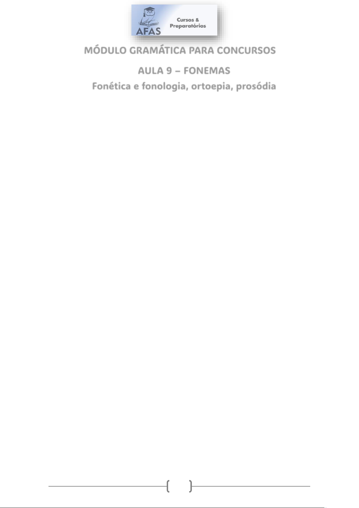1 MÓDULO GRAMÁTICA PARA CONCURSOS AULA 9 – FONEMAS Fonética e fonologia, ortoepia, prosódia EXERCÍCIOS 1. Assum preto Tudo em vorta é só beleza Sol de abril e a mata em frô Mas assum preto, cego dos óio Num vendo a luz, ai, canta de dor Tarvez por ignorança Ou mardade das pió Furaro os óio do assum preto Pra ele assim, ai, cantá mió Assum preto veve sorto Mas num pode avuá Mil veiz a sina de uma gaiola Desde que o céu, ai, pudesse oiá GONZAGA, Luiz; TEIXEIRA, Humberto. “Assum Preto”. Editora e Importadora Musical Fermata do Brasil Ltda. Disponível em: . As marcas da variedade regional registradas pelos compositores de “Assum preto” resultam da aplicação de um conjunto de princípios ou regras gerais que alteram a pronúncia, a morfologia, a sintaxe ou o léxico. No texto, é resultado de uma mesma regra a: A) pronúncia das palavras “vorta” e “veve”. B) pronúncia das palavras “tarvez” e “sorto”. C) flexão verbal encontrada em “furaro” e “cantá”. D) redundância nas expressões “cego dos óio” e “mata em frô”. E0 pronúncia das palavras “ignorança” e “avuá”. 2. Em alguns vocábulos, pela sua grafia, tende-se a pronunciar um fonema a mais. Das seguintes palavras retiradas do texto, esse fenômeno NÃO ocorre em: A) psiquiatra. B) diagnosticado. C) humanização. D) técnicas. E) característica. 3. O substantivo “vítima” e o verbo “vitima” são praticamente semelhantes na grafia: só o que os diferencia é a acentuação gráfica do primeiro. Todas as palavras a seguir, caso tenham seus acentos gráficos retirados, originarão verbos corretamente grafados, EXCETO: A) Médico. B) Desânimo. C) Penitenciárias. D) Saúde. E) Pública. 2 4. Assinale a alternativa cujas palavras NÃO sejam acentuadas graficamente por causa das mesmas regras que prescrevem a grafia, respectivamente, de país, insônia e até. A) baú — anágua — sofá B) juízes — memória — café C) faísca — história — está D) raízes — infâmia — rodapé E) índole — difíceis — chapéu 5. “Saí correndo e peguei um táxi que era bem antigo.” Ao somarmos os fonemas e letras das palavras em destaque, obteremos: A) 23 letras e 23 fonemas. B) 23 letras e 21 fonemas. C) 24 letras e 24 fonemas. D) 24 letras e 22 fonemas. E) 24 letras e 21 fonemas. 6. Referente ao trecho “Eu mesmo me surpreendo: em geral, acho chatérrimos os profetas do apocalipse, que estão com medo de que o mundo se torne líquido ou coisa que valha.”, é correto afirmar que a palavra “surpreendo” possui tanto encontro consonantal quanto dígrafo e “profetas” está flexionada no feminino plural. A) a palavra “mesmo” é invariável e tanto a palavra “apocalipse” quanto a palavra “profetas” possuem dígrafo. B) a expressão “em geral” pode ser substituída, sem prejuízo de valor para a compreensão do texto, pela palavra “geralmente” e as palavras “chatérrimos” e “líquido” têm acentuação justificada pela mesma regra. C) o verbo “acho” é transitivo direto e o verbo “surpreendo” está na forma nominal do particípio passado. D) tanto a expressão “me surpreendo” como a expressão “se torne” são reflexivas, ou seja, o sujeito pratica e, ao mesmo tempo, sofre a ação e o sujeito do verbo “estão” é “chatérrimos”. 7. Assinale a alternativa na qual o vocábulo compõe-se respectivamente por 7 letras e 8 fonemas: A) chocado B) técnica C) exemplo D) táxi E) prefixo 8. Em relação à fonologia, numerar a 2ª coluna de acordo com a 1ª e, após, assinalar a alternativa que apresenta a sequência CORRETA: ( 1 )Encontro vocálico: ditongo decrescente. ( 2 )Encontro vocálico: ditongo crescente. ( 3 )Dígrafo. ( 4 )Encontro consonantal. ( )Quente. ( )Cripta. ( )Mausoléu. ( )Conchas. ( ) Reino. A) 4 - 4 - 2 - 4 - 3. B) 3 - 4 - 2 - 4 - 1. C) 1 - 3 - 1 - 4 - 1. D) 3 - 4 - 2 - 3 - 2. 3 E) 3 - 4 - 1 - 3 – 1. 9. Em relação à acentuação viciosa, analisar os itens abaixo, considerando-se a exata pronúncia das palavras e sua classificação quanto ao acento tônico, evitando-se uma silabada, denominação dada ao erro de prosódia: — São oxítonas: “ruim”, “mister”, “Nobel”, “ureter”, etc. — São paroxítonas: “ibero”, “rubrica”, “avaro”, “ciclope”, “misantropo”, etc. — São proparoxítonas: “ômega”, “ágape”, “aerólito”, “ínterim”, “arquétipo”, etc. Está(ão) CORRETO(S): A) Todos os itens. B) Somente o item III. C) Somente os itens I e II. D) Somente os itens I e III. E) Somente os itens II e III. 10. Sobre os vícios de linguagem, é comum ouvirmos, na linguagem do dia a dia, expressões desagradáveis como “preciso ir-me já” ou “boca dela”. Nestes casos, diga a que vício de linguagem correspondem tais exemplos. A) solecismo B) redundância C) barbarismo D) cacófato