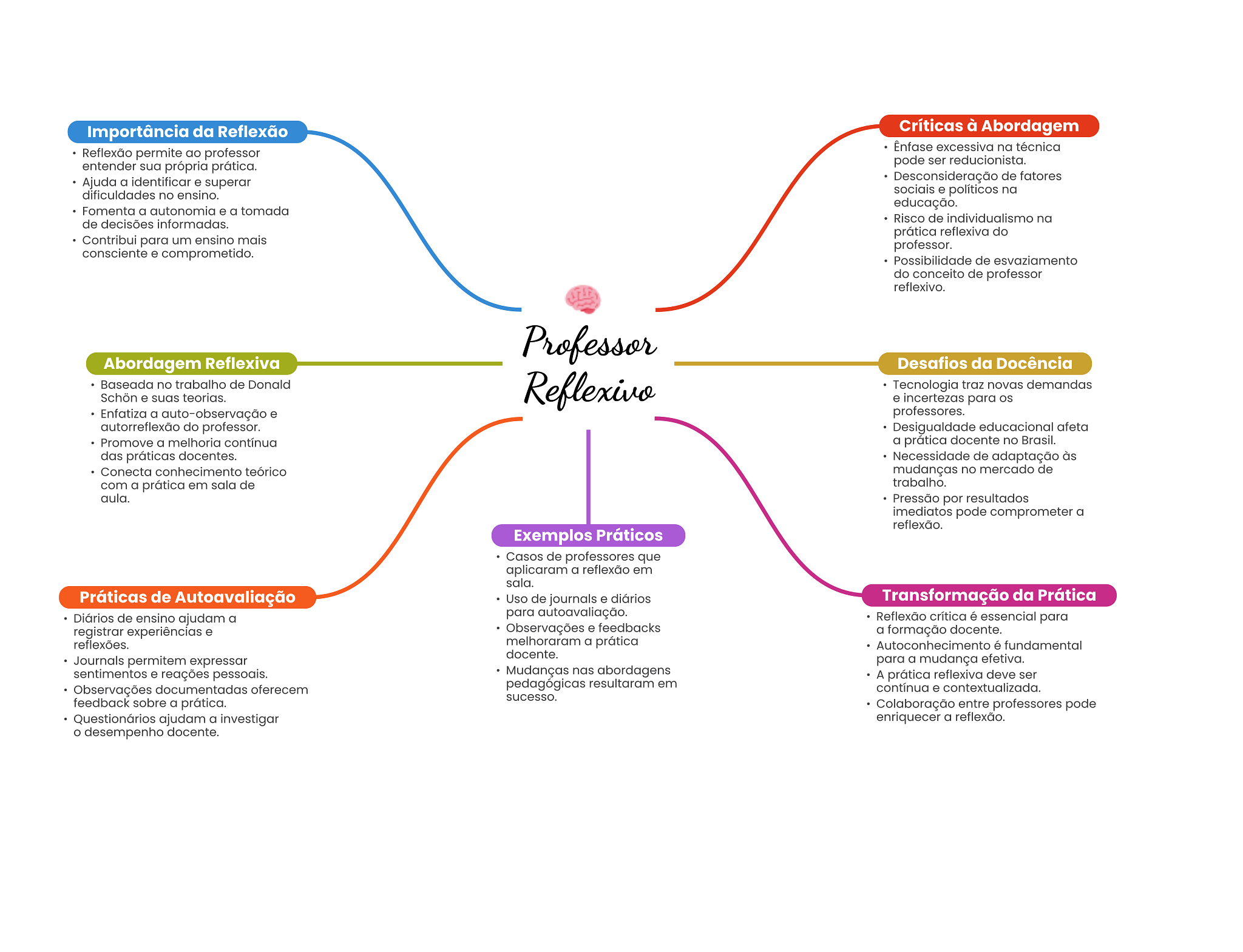 Importância da Reflexão Críticas à Abordagem Ênfase excessiva na técnica Reflexão permite ao professor entender sua própria prática. pode ser reducionista. Ajuda a identificar e superar Desconsideração de fatores dificuldades no ensino. sociais e políticos na educação. Fomenta a autonomia e a tomada Risco de individualismo na de decisões informadas. prática reflexiva do Contribui para um ensino mais professor. consciente e comprometido. Possibilidade de esvaziamento do conceito de professor reflexivo. Professor Abordagem Reflexiva Desafios da Docência Baseada no trabalho de Donald Schön e suas teorias. Reflexivo Tecnologia traz novas demandas e incertezas para Enfatiza a auto-observação e professores. autorreflexão do professor. Desigualdade educacional afeta Promove a melhoria contínua a prática docente no Brasil. das práticas docentes. Necessidade de adaptação às Conecta conhecimento teórico mudanças no mercado de com a prática em sala de trabalho. aula. Pressão por resultados imediatos pode comprometer a reflexão. Exemplos Práticos Casos de professores que aplicaram a reflexão em sala. Práticas de Autoavaliação Uso de journals e diários Transformação da Prática Diários de ensino ajudam a para autoavaliação. Reflexão crítica é essencial para registrar experiências e Observações e feedbacks a formação docente. reflexões. melhoraram a prática Autoconhecimento é fundamental docente. Journals permitem expressar para a mudança efetiva. sentimentos e reações pessoais. Mudanças nas abordagens A prática reflexiva deve ser Observações documentadas oferecem pedagógicas resultaram em contínua e contextualizada. sucesso. feedback sobre a prática. Colaboração entre professores pode Questionários ajudam a investigar enriquecer a reflexão. desempenho docente.