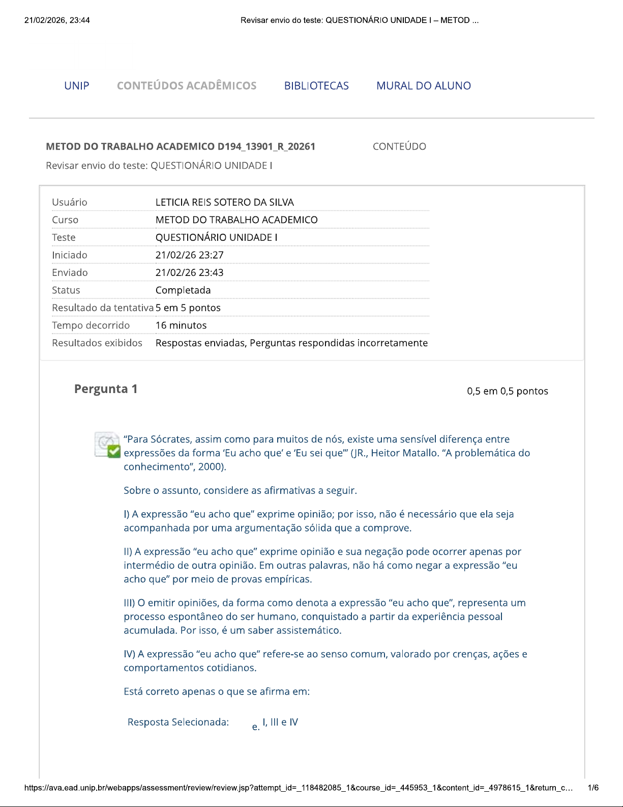 21/02/2026, 23:44 Revisar envio do teste: QUESTIONÁRIO UNIDADE I METOD UNIP CONTEÚDOS ACADÊMICOS BIBLIOTECAS MURAL DO ALUNO METOD DO TRABALHO ACADEMICO D194_13901_R_20261 CONTEÚDO Revisar envio do teste: QUESTIONÁRIO UNIDADE Usuário LETICIA REIS SOTERO DA SILVA Curso METOD DO TRABALHO ACADEMICO Teste QUESTIONÁRIO UNIDADE Iniciado 21/02/26 23:27 Enviado 21/02/26 23:43 Status Completada Resultado da tentativa 5 em 5 pontos Tempo decorrido 16 minutos Resultados exibidos Respostas enviadas, Perguntas respondidas incorretamente Pergunta 1 0,5 em 0,5 pontos "Para Sócrates, assim como para muitos de nós, existe uma sensível diferença entre expressões da forma 'Eu acho que' e 'Eu sei que" (JR., Heitor Matallo. "A problemática do conhecimento", 2000). Sobre assunto, considere as afirmativas a seguir. I) A expressão "eu acho que" exprime opinião; por isso, não é necessário que ela seja acompanhada por uma argumentação sólida que a comprove. II) A expressão "eu acho que" exprime opinião e sua negação pode ocorrer apenas por intermédio de outra opinião. Em outras palavras, não há como negar a expressão "eu acho que" por meio de provas empíricas. III) emitir opiniões, da forma como denota a expressão "eu acho que", representa um processo espontâneo do ser humano, conquistado a partir da experiência pessoal acumulada. Por isso, é um saber assistemático. IV) A expressão "eu acho que" refere-se ao senso comum, valorado por crenças, ações e comportamentos cotidianos. Está correto apenas que se afirma em: Resposta Selecionada: I, III e IV e. 1/621/02/2026, 23:44 Revisar envio do teste: QUESTIONÁRIO UNIDADE I METOD Pergunta 2 0,5 em 0,5 pontos É possível entender ser a pesquisa científica "uma investigação metódica acerca de um assunto determinado, com objetivo de esclarecer aspectos do objeto de estudo. que poderia diferenciar a pesquisa de um estudante e de um cientista é basicamente seu alcance ou grau. A finalidade das pesquisas em nível de graduação é levar estudante a refazer os caminhos já percorridos, repensando mundo." (BASTOS, Cleverson; KELLER, Vicente. "Aprendendo a aprender". Petrópolis: Editora Vozes, 2000, p. 55). Com base nisso, considere as afirmativas a seguir: I) Espera-se do estudante de graduação a mesma competência e a mesma originalidade constituintes do trabalho do cientista. II) As pesquisas na graduação não são capazes de gerar nada novo, já que estudante não tem liberdade para criar ou construir novas teorias. III) estudante da graduação percorre caminhos já percorridos; esta experiência é somada ao referencial teórico e ao arsenal metodológico oferecidos pelas disciplinas, capacitando-o a produzir conhecimento. Está correto apenas que se afirma em: Resposta Selecionada: III Pergunta 3 0,5 em 0,5 pontos (CQA UNIP/2012, com modificações) método indutivo é um processo mental por meio do qual se infere uma verdade geral ou universal não contida nas partes examinadas. objetivo dos argumentos é levar a conclusões cujo conteúdo é muito mais amplo do que das premissas nas quais se baseiam. método dedutivo é um processo mental, contrário à indução, por meio do qual é possível, a partir de uma ou mais premissas aceitas como verdadeiras, a obtenção de uma conclusão necessária e evidente. Qual das alternativas a seguir constitui um exemplo de método científico indutivo?" Resposta Selecionada: corvo 1 é negro. corvo 2 é negro. corvo negro. O corvo "n" é negro. a. (Todo) corvo é negro. Pergunta 4 0,5 em 0,5 pontos 2/621/02/2026, 23:44 Revisar envio do teste: QUESTIONÁRIO UNIDADE I METOD (UFRJ/2014, com modificações) conhecimento científico distingue-se do senso comum sob muitos aspectos. Sob a perspectiva científica, é correto afirmar que: Resposta d. Selecionada: Todo conhecimento é passível de crítica, mesmo aquele que parece mais bem estabelecido em um dado momento. Pergunta 5 0,5 em 0,5 pontos Cleverson Bastos e Vicente Keller em "Aprendendo a aprender" (Petrópolis: Editora Vozes, 2000, p. 19) dizem assim: [...] cotidiano apresenta uma gama quase infinita de fenômenos que se sucedem ininterruptamente, causando nos indivíduos que se chama dispersão. No entanto, cada indivíduo é dotado de capacidade de, entre este turbilhão fenomênico, selecionar alguns e considerá-los isoladamente dos demais. A esta capacidade se dá nome de atenção capacidade de concentração da inteligência em um só objeto. Nesse sentido, pode-se afirmar que: Resposta C. Selecionada: A atenção, entendida como uma das fontes para obtenção de conhecimento, permite produzir conhecimento. Pergunta 6 0,5 em 0,5 pontos Conforme João Ildebrando Bocchi ("Monografia para economia". São Paulo: Saraiva, 2004), conhecimento científico busca, por meio da formulação de problemas, uma clareza de abordagem da realidade. [...]. Diferentemente dos modos e resultados difusos, vagos e imprecisos das demais formas de conhecimento, como senso comum, por exemplo, conhecimento científico procura clareza e precisão, inclusive com relação aos seus limites." (p.17-18). Com base no que se apresenta, assinale a única alternativa que não faz referência ao conhecimento científico. Resposta b. Selecionada: sucesso profissional de um médico pode ser medido em função das características do seu signo. 3/621/02/2026, 23:44 Revisar envio do teste: QUESTIONÁRIO UNIDADE I METOD Pergunta 7 0,5 em 0,5 pontos Considere as afirmativas a seguir a respeito do conhecimento popular e do conhecimento científico: I) conhecimento popular, às vezes denominado senso comum, é similar ao conhecimento científico em relação à veracidade que alcança e à natureza do objeto ao qual se refere. II) O conhecimento popular, às vezes denominado senso comum, distingue-se do conhecimento científico por não pretender alcançar certezas e por dirigir-se a objetos que não necessariamente podem ser investigados à luz da ciência. III