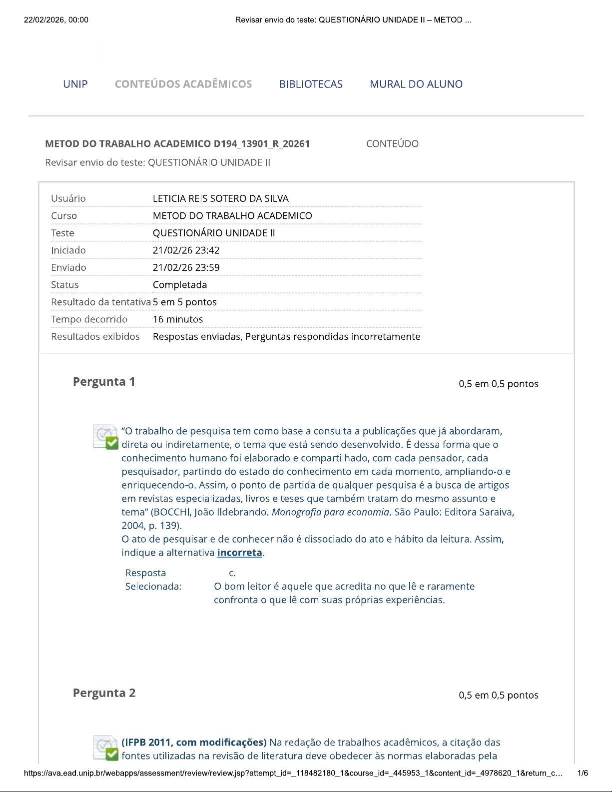 22/02/2026, 00:00 Revisar envio do teste: QUESTIONÁRIO UNIDADE METOD UNIP CONTEÚDOS ACADÊMICOS BIBLIOTECAS MURAL DO ALUNO METOD DO TRABALHO ACADEMICO D194_13901_R_20261 CONTEÚDO Revisar envio do teste: QUESTIONÁRIO UNIDADE Usuário LETICIA REIS SOTERO DA SILVA Curso METOD DO TRABALHO ACADEMICO Teste QUESTIONÁRIO UNIDADE Iniciado 21/02/26 23:42 Enviado 21/02/26 23:59 Status Completada Resultado da tentativa 5 em 5 pontos Tempo decorrido 16 minutos Resultados exibidos Respostas enviadas, Perguntas respondidas incorretamente Pergunta 1 0,5 em 0,5 pontos "O trabalho de pesquisa tem como base a consulta a publicações que já abordaram, direta ou indiretamente, tema que está sendo desenvolvido. É dessa forma que conhecimento humano foi elaborado e compartilhado, com cada pensador, cada pesquisador, partindo do estado do conhecimento em cada momento, ampliando-o e enriquecendo-o. Assim, ponto de partida de qualquer pesquisa é a busca de artigos em revistas especializadas, livros e teses que também tratam do mesmo assunto e tema" (BOCCHI, João Ildebrando. Monografia para economia. São Paulo: Editora Saraiva, 2004, p. 139). O ato de pesquisar e de conhecer não é dissociado do ato e hábito da leitura. Assim, indique a alternativa incorreta. Resposta C. Selecionada: bom leitor é aquele que acredita no que lê e raramente confronta que lê com suas próprias experiências. Pergunta 2 0,5 em 0,5 pontos (IFPB 2011, com modificações) Na redação de trabalhos acadêmicos, a citação das fontes utilizadas na revisão de literatura deve obedecer às normas elaboradas pela 1/622/02/2026, 00:00 Revisar envio do teste: QUESTIONÁRIO UNIDADE METOD Associação Brasileira de Normas Técnicas (ABNT). Com relação às citações, analise as afirmativas que se seguem. I. A citação direta é a transcrição fiel das palavras usadas no texto consultado, portanto, sem alteração por parte de quem elabora trabalho acadêmico. II. A citação direta com mais de três linhas deve ser usada com recuo de 2 cm da margem esquerda, com aspas e com fonte igual a do texto. III. A citação direta com até três linhas deve ser usada no texto corrido, entre aspas e com a mesma fonte do texto. Estão corretas apenas as afirmativas: Resposta Selecionada: b. e III apenas. Pergunta 3 0,5 em 0,5 pontos A respeito da prática de plágio acadêmico, considere as afirmativas a seguir. I. O plágio acadêmico envolve toda citação literal de texto de outros autores, independentemente de esses autores estarem ou não referenciados no trabalho do aluno. II. plágio acadêmico envolve apenas uso de ideias de outros autores, mesmo que referenciadas. III. plágio acadêmico envolve a ausência de referência ao texto e à ideia de outro autor. Está correto apenas que se afirma em: Resposta Selecionada: III. Pergunta 4 0,5 em 0,5 pontos Com relação à intertextualidade no texto acadêmico, considere as afirmativas a seguir: I. As citações diretas são trechos escritos por outros autores e que são utilizados integralmente, palavra por palavra, pelo aluno. II. As citações indiretas são realizadas quando aluno pretende melhorar texto de outro autor, introduzindo ideias e palavras novas. III. As citações indiretas devem sempre fazer uso de aspas, para que fique claro que as ideias ali citadas não são da autoria do aluno. Está correto apenas que se afirma em: Resposta Selecionada: 2/622/02/2026, 00:00 Revisar envio do teste: QUESTIONÁRIO UNIDADE METOD Pergunta 5 0,5 em 0,5 pontos Conforme João Ildebrando Bocchi (Monografia para economia. São Paulo: Editora Saraiva, 2004), "método designa um caminho pelo qual se obtém certo resultado. Pode designar também um conjunto de procedimentos e de regras utilizadas para atingir um objetivo desejado". (p. 54). Se objetivo for de efetuar a redação de um texto acadêmico: I.É preciso expressar-se, necessariamente, de forma racional e lógica. II. É imprescindível a realização de um rascunho para, apenas depois das correções e reflexões, elaborar texto final. III. Na falta de palavras para expressar a lógica da comunicação, devem ser utilizadas ilustrações como substituição ao texto. Está correto apenas que se afirma em: Resposta Selecionada: a. e II. Pergunta 6 0,5 em 0,5 pontos Considerando as condições do fazer científico, é importante lembrar que: Resposta a. Selecionada: A curiosidade faz parte da pesquisa, pois estimula olhar crítico sobre a realidade e a elaboração de perguntas sobre mundo que nos cerca. Pergunta 7 0,5 em 0,5 pontos Leia trecho de João Baptista de Almeida Júnior, "O estudo como forma de pesquisa" (in CARVALHO, Maria Cecília M. Metodologia científica: fundamentos e técnicas. Campinas: Editora Papirus, 2000). "Para se iniciar nos estudos superiores e obter um reconhecimento acadêmico, estudante deve estudar primeiro como aprender. Isto porque as mudanças ocorridas recentemente na sociedade e nas formas de relacionamento humano geraram novas necessidades para as quais a educação é solicitada a atender. [...] Dentro dessa perspectiva educacional, estudo aparece para o aluno como forma de pesquisa, apresentado comumente por diversos autores nas modalidades de pesquisa bibliográfica e documentação" (pp. 97-99). Com base no exposto, avalie as assertivas e responda ao solicitado: I. A pesquisa deve estudar aquilo que já foi investigado anteriormente, já que não é função da ciência pesquisar aquilo que nunca foi objeto de estudos anteriores. II. A pesquisa científica é uma investigação metódica acerca de um assunto 3/622/02/2026, 00:00 Revisar envio do teste: QUESTIONÁRIO UNIDADE METOD determinado, e é realizada com o objetivo de esclarecer aspectos do objeto em estudo. III. Toda pesquisa requer método, entendido como procedimento de investigação e controle que se adota para desenvolvimento rápido e eficiente de uma atividade qualquer. IV. Estudar como aprender auxilia estudante universitário 