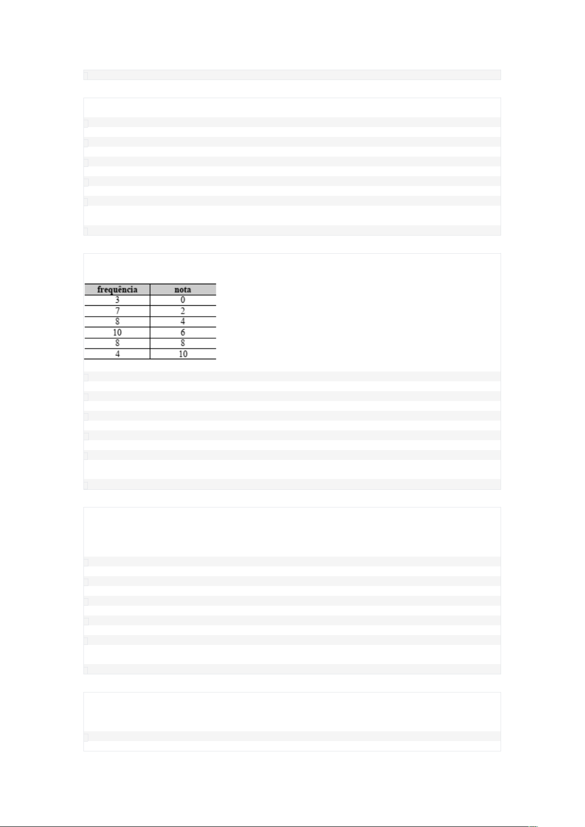 1 Marcar para revisão As medidas citadas abaixo descrevem uma amostra obtida em um experimento aleatório. A única que mede a dispersão da amostra é: A Desvio padrão B Mediana C Média aritmética D Média geométrica E Moda 2 Marcar para revisão (adaptada CESPE / CEBRASPE - 2021 - SEDUC-AL - Professor - Matemática) Considere que, em uma turma de matemática, o professor tenha distribuído as notas da primeira avaliação dos alunos conforme a tabela apresentada a seguir: É correto afirmar que a média das notas dessa turma na primeira avaliação foi superior há: A 5 B 4 C 3 D 2 E 1 3 Marcar para revisão Variáveis são características de interesse em um estudo qualquer. Elas podem ser classificadas em variáveis quantitativas ou qualitativas, que por sua vez, são classificadas em quantitativas discretas ou contínuas e qualitativas nominais ou ordinais. Durante um estudo epidemiológico, foi feito um levantamento do peso dos bebês nascidos durante o ano de 2022, para apurar onde o atendimento pré-natal não está sendo feito da maneira adequada ou se há algum empecilho que dificulte o acesso das gestantes para tal naquela situação específica. Como é classificada a variável peso das crianças ao nascer? A Quantitativa discreta B Quantitativa contínua C Qualitativa nominal D Qualitativa ordinal E Qualitativa contínua 4 Marcar para revisão Maria, aluna de educação física, está estudando alguns marcadores bioquímicos para correlacionar a performance de jogadores de futebol do seu time com esses marcadores. Durante sua análise, ela fez o levantamento de todas as idades dos jogadores do seu time, e teve a seguinte série de dados: 14, 14, 16, 16, 16, 16, 17, 17, 17, 18, 19, 25, 16, 19, 30, 31, 32, 32, 33, 35, 36, 37, 39, 39, 40, 41. Qual a amplitude que Maria encontrou? A 23 B 25 C 26 D 41 E 27 5 Marcar para revisão Para calcular a correlação entre duas variáveis, utilizando a fórmula do coeficiente de Spearman, é necessária uma condição. Marque a alternativa que apresenta essa condição. A Que as variâncias sejam números inteiros e distintos. B Que a covariância seja um número negativo. C Que a covariância seja um número inteiro positivo. D Que os postos sejam números inteiros. E Que os postos sejam números inteiros e distintos. 6 Marcar para revisão Na análise da quantidade de suor de jogadores de vôlei, por quantidades de pulos dados durante determinado jogo, foi calculado, considerando todos os jogadores, um coeficiente de Spearman igual a 0,6. Esse resultado indica que: A Os pulos dos jogadores são uma variável indireta para a quantidade de suor dos jogadores. B Os pulos dos jogadores são uma variável direta para a quantidade de suor dos jogadores. C Os pulos dos jogadores são a única variável que interfere na quantidade de suor dos jogadores. D Os pulos dos jogadores não interferem na quantidade de suor dos jogadores. E Os pulos dos jogadores são a única variável que interfere indiretamente na quantidade de suor dos jogadores. 7 Marcar para revisão O gráfico a seguir apresenta o número de nascidos vivos no Brasil em 2019, segundo a região do país. Fonte: MS/SVS/Dasis - Sistema de Informações sobre Nascidos Vivos ¿ Sinasc. Datasus, 2021. A partir da análise do gráfico, a série estatística apresentada pode ser classificada como uma: A série estatística temporal. B série estatística geográfica. C série estatística específica. D série estatística conjugada. E série estatística histórica. 8 Marcar para revisão Os dados coletados em estudos epidemiológicos são utilizados para calcular coeficientes e índices, que contribuirão para a análise da situação de saúde de uma população. Sobre os coeficientes e índices avalie as assertivas a seguir: I - Os coeficientes, também chamados de taxas, têm por objetivo mensurar uma probabilidade, ou seja, o risco de um indivíduo ser acometido pelo evento estudado. II - Já os índices, também chamados de proporções, não mensuram probabilidade de um evento ocorrer, apenas indicam a importância do evento em relação ao todo. III - Os índices podem ser calculados de modo geral ou proporcional, como mortalidade geral e mortalidade segundo sexo, por exemplo. IV - Os coeficientes podem ser calculados somente de modo geral, ou seja, com a especificação apenas de tempo e de espaço, permitindo uma visão global do fato analisado. Considera-se correto o que é descrito em: A I e II, apenas. B I, II e III, apenas. C I, II e IV, apenas. D I e IV, apenas. E III e IV, apenas. 9 Marcar para revisão Ao organizar dados experimentais, é comum representá-los graficamente por histogramas. Porém, para estimar probabilidades com maior precisão, é necessário um modelo teórico. Com base nos conceitos de distribuição normal e na representação gráfica dos dados, assinale a alternativa que identifica corretamente o recurso utilizado para determinar a probabilidade de ocorrência de um valor. A A probabilidade de ocorrência é identificada diretamente a partir do eixo vertical do histograma. B O histograma fornece a função densidade usada para cálculo da probabilidade exata de um valor. C A área sob as barras do histograma indica a distribuição acumulada dos dados observados. D A distribuição de Gauss, usada para calcular probabilidades, é obtida da frequência acumulada dos dados. E A determinação da probabilidade é feita com base em uma curva gaussiana, chamada distribuição normal. 10 Marcar para revisão (CONSULPLAN/FSERJ-2020/Adaptado) Em uma área com 100 mil habitantes, foram notificados cerca de 50 casos de sarampo nos últimos dois meses. Com essas informações, os serviços de saúde podem construir indicadores a respeito desse agravo. Considerando tais informações, assinale o indicador de saúde que poderá ser elaborado com os dados descritos. A Taxa de epidemia. B Coeficiente de incidência. C Coeficiente de prevalência. D Coeficient