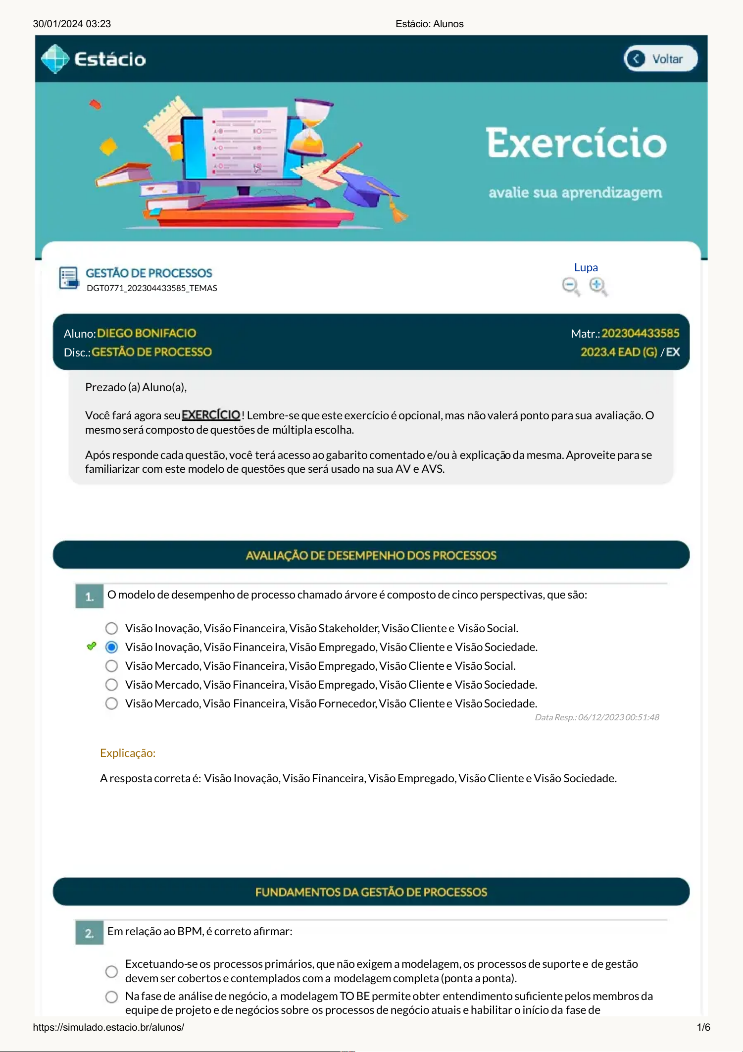 30/01/2024 03:23 Estácio: Alunos https://simulado.estacio.br/alunos/ 1/6 E x e r c í c i o O modelo de desempenho de processo chamado árvore é composto de cinco perspectivas, que são: Em relação ao BPM, é correto armar: Lupa DGT0771_202304433585_TEMAS Aluno: Matr.: Disc.: / Prezado (a) Aluno(a), Você fará agora seu ! Lembre-se que este exercício é opcional, mas não valerá ponto para sua avaliação. O mesmo será composto de questões de múltipla escolha. Após responde cada questão, você terá acesso ao gabarito comentado e/ou à explicação da mesma. Aproveite para se familiarizar com este modelo de questões que será usado na sua AV e AVS. Visão Inovação, Visão Financeira, Visão Stakeholder, Visão Cliente e Visão Social. Visão Inovação, Visão Financeira, Visão Empregado, Visão Cliente e Visão Sociedade. Visão Mercado, Visão Financeira, Visão Empregado, Visão Cliente e Visão Social. Visão Mercado, Visão Financeira, Visão Empregado, Visão Cliente e Visão Sociedade. Visão Mercado, Visão Financeira, Visão Fornecedor, Visão Cliente e Visão Sociedade. Data Resp.: 06/12/2023 00:51:48 Explicação: A resposta correta é: Visão Inovação, Visão Financeira, Visão Empregado, Visão Cliente e Visão Sociedade. Excetuando-se os processos primários, que não exigem a modelagem, os processos de suporte e de gestão devem ser cobertos e contemplados com a modelagem completa (ponta a ponta). Na fase de análise de negócio, a modelagem TO BE permite obter entendimento suciente pelos membros da equipe de projeto e de negócios sobre os processos de negócio atuais e habilitar o início da fase de http://voltar();/ http://voltar();/ 30/01/2024 03:23 Estácio: Alunos https://simulado.estacio.br/alunos/ 2/6 Ao monitorar os processos pela demanda,podemos classicá-las a partir do seu Volume, Variedade, Variação e Visibilidade. Qual das alternativas abaixo representa corretamente a relação entre elas: Pensar em estratégias de gerenciamento de risco de processo é essencial para as organizações. Assinale a alternativa correta em relação ao risco: transformação de processo. Nem todas as técnicas de uxogramas atendem aos requisitos da análise de processo e, nesse aspecto, as únicas técnicas aplicáveis são as do uxograma de blocos e do uxograma de procedimento. A simulação é uma etapa importante da automação, pois é nela que os processos são descobertos e desenhados. Na fase de análise de negócio, a modelagem AS IS permite obter entendimento suciente pelos membros da equipe de projeto e de negócios sobre os processos de negócio atuais e habilitar o início da fase de transformação de processo. Data Resp.: 06/12/2023 00:52:41 Explicação: Na fase de análise de negócio, a modelagem AS IS permite obter entendimento suciente pelos membros da equipe de projeto e de negócios sobre os processos de negócio atuais e habilitar o início da fase de transformação de processo. Alto Volume / Baixa Varidade / Alta Variação / Alta Visibilidade. Baixo Volume / Alta Varidade / Alta Variação / Alta Visibilidade. Baixo Volume / Baixa Varidade / Alta Variação / Alta Visibilidade. Alto Volume / Alta Varidade / Alta Variação / Alta Visibilidade. Baixo Volume / Baixa Varidade / Baixa Variação / Baixa Visibilidade. Data Resp.: 06/12/2023 00:53:21 Explicação: A resposta correta é: Baixo Volume / Alta Varidade / Alta Variação / Alta Visibilidade. O risco é entendido como sendo a possibilidade de um evento não desejável acontecer. O risco representa a certeza de que haverá falhas no processo. Todo risco tem uma falha, mas nem toda falha é um risco. O processo de gerenciamento de risco é entendido como a possibilidade de ter falhas. O risco é entendido como sendo a probabilidade de um evento desejável acontecer. Data Resp.: 06/12/2023 00:54:26 Explicação: O risco é entendido como a possibilidade de um evento não desejável acontecer, ou seja, a chance de ocorrer uma falha. Ela pode ter consequências mais ou menos graves dependendo de seu grau de seriedade. 30/01/2024 03:23 Estácio: Alunos https://simulado.estacio.br/alunos/ 3/6 As metas FAST ajudam a organização a ser mais dinâmica permitindo que os colaboradores estejam alinhados com as metas da organização. As metas FAST devem ser: I. Financeiras II. Ambiciosas III. Especícas IV. Transparentes Assinale a alternativa que indica os itens corretos. O modelo BPMN é amplamente utilizado para mapear processo organizacionais. Esse modelo consistem em etapas, são elas: I. Captura de alto nível de abstração II. Identicação e análise de problemas III. Ajustes IV. Degradação do processo Assinale a alternativa que indica as etapas corretas. II e III, apenas. I, II, III e IV. II, III e IV, apenas. I e IV, apenas. I, II e IV, apenas. Data Resp.: 06/12/2023 01:00:54 Explicação: I. Financeiras - errada. O correto seriam metas Frequentemente discutidas. II. Ambiciosas III. Especícas IV. Transparentes I, III e IV, apenas. II, III e IV, apenas. I, II e IV, apenas. I, II e III, apenas. I, II, III e IV. Data Resp.: 06/12/2023 01:01:29 Explicação: As três etapas do modelo BPMN são: captura de alto nível de abstração, identicação e análise de problema e ajuste. 30/01/2024 03:23 Estácio: Alunos https://simulado.estacio.br/alunos/ 4/6 A SOA é voltada a tecnologia, diferenciando-se da metodologia BPM que é pensada para modelo, implantação e monitoramento dos processos. A partir dessa armativa, considere as fases do BPM abaixo. I. Compartilhamento II. Modelagem Inicial III. Simulação IV. Monitoramento São fases do BPM os itens Com o objetivo de aprimorar e otimizar os resultados, o gerenciamento de processos pode ser dividido em quatro etapas: Dirigir, projetar, entregar e desenvolver. A descrição da etapa "Desenvolver" é: A identicação das conformidades pode ser realizada pelo comprador, quem adquire o produto, pelo fornecedor, quem entrega o produto. Exi