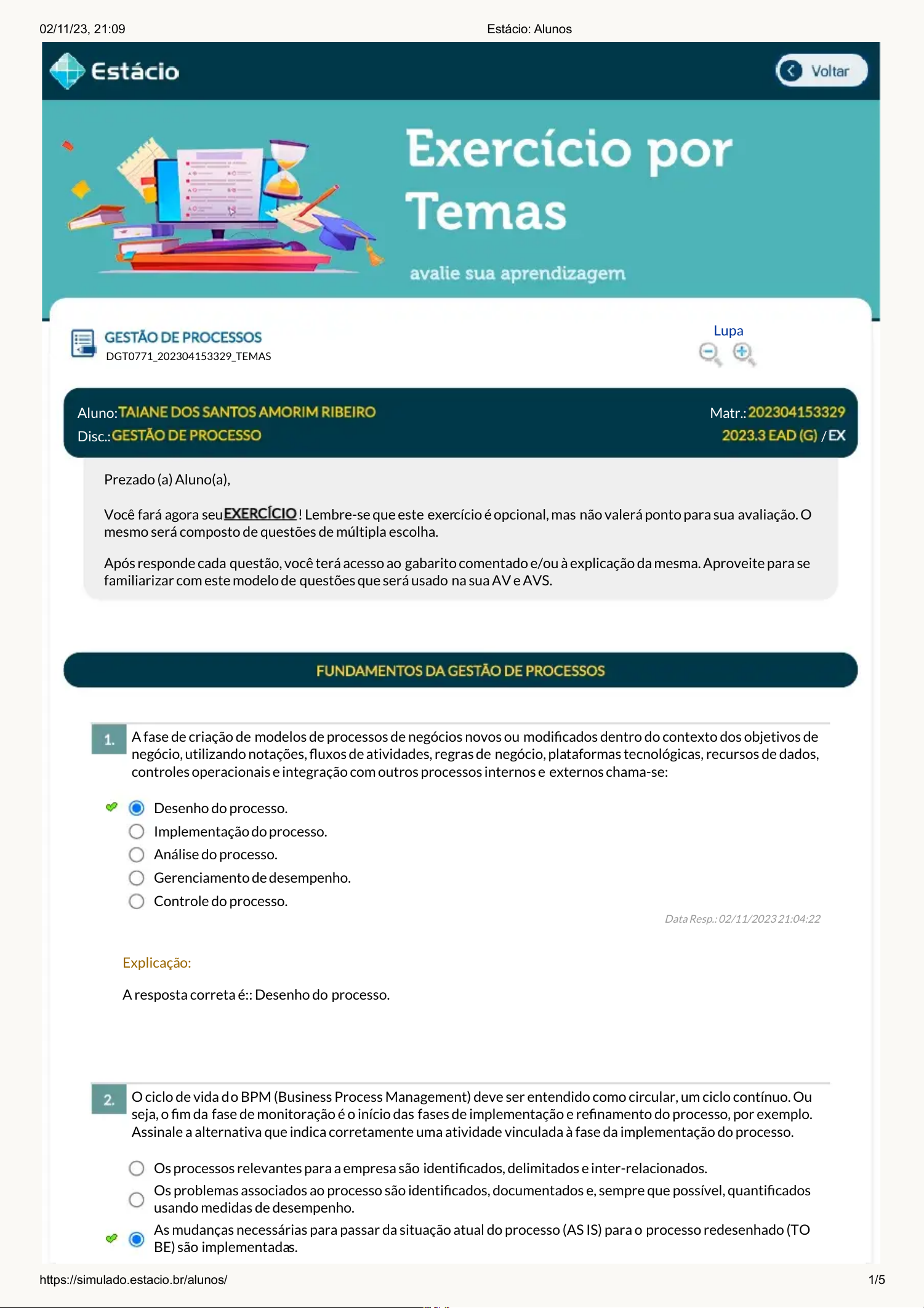 02/11/23, 21:09 Estácio: Alunos https://simulado.estacio.br/alunos/ 1/5 E x e r c í c i o p o r T e m a s A fase de criação de modelos de processos de negócios novos ou modicados dentro do contexto dos objetivos de negócio, utilizando notações, uxos de atividades, regras de negócio, plataformas tecnológicas, recursos de dados, controles operacionais e integração com outros processos internos e externos chama-se: O ciclo de vida do BPM (Business Process Management) deve ser entendido como circular, um ciclo contínuo. Ou seja, o m da fase de monitoração é o início das fases de implementação e renamento do processo, por exemplo. Assinale a alternativa que indica corretamente uma atividade vinculada à fase da implementação do processo. Lupa DGT0771_202304153329_TEMAS Aluno: Matr.: Disc.: / Prezado (a) Aluno(a), Você fará agora seu ! Lembre-se que este exercício é opcional, mas não valerá ponto para sua avaliação. O mesmo será composto de questões de múltipla escolha. Após responde cada questão, você terá acesso ao gabarito comentado e/ou à explicação da mesma. Aproveite para se familiarizar com este modelo de questões que será usado na sua AV e AVS. Desenho do processo. Implementação do processo. Análise do processo. Gerenciamento de desempenho. Controle do processo. Data Resp.: 02/11/2023 21:04:22 Explicação: A resposta correta é:: Desenho do processo. Os processos relevantes para a empresa são identicados, delimitados e inter-relacionados. Os problemas associados ao processo são identicados, documentados e, sempre que possível, quanticados usando medidas de desempenho. As mudanças necessárias para passar da situação atual do processo (AS IS) para o processo redesenhado (TO BE) são implementadas. http://diminui();/ http://aumenta();/ http://voltar();/ 02/11/23, 21:09 Estácio: Alunos https://simulado.estacio.br/alunos/ 2/5 Em relação ao BPM, é correto armar: A gestão de processos visa: As tarefas para gerenciar os processos no dia a dia estão associadas a diversas atividades, com exceção de: Dados relevantes são coletados e medidas de desempenho são analisadas para determinar o desempenho do processo implementado. Os processos relevantes para a empresa são desenhados. Data Resp.: 02/11/2023 21:04:46 Explicação: A resposta correta é: As mudanças necessárias para passar da situação atual do processo (AS IS) para o processo redesenhado (TO BE) são implementadas. Na fase de análise de negócio, a modelagem AS IS permite obter entendimento suciente pelos membros da equipe de projeto e de negócios sobre os processos de negócio atuais e habilitar o início da fase de transformação de processo. A simulação é uma etapa importante da automação, pois é nela que os processos são descobertos e desenhados. Nem todas as técnicas de uxogramas atendem aos requisitos da análise de processo e, nesse aspecto, as únicas técnicas aplicáveis são as do uxograma de blocos e do uxograma de procedimento. Na fase de análise de negócio, a modelagem TO BE permite obter entendimento suciente pelos membros da equipe de projeto e de negócios sobre os processos de negócio atuais e habilitar o início da fase de transformação de processo. Excetuando-se os processos primários, que não exigem a modelagem, os processos de suporte e de gestão devem ser cobertos e contemplados com a modelagem completa (ponta a ponta). Data Resp.: 02/11/2023 21:05:24 Explicação: Na fase de análise de negócio, a modelagem AS IS permite obter entendimento suciente pelos membros da equipe de projeto e de negócios sobre os processos de negócio atuais e habilitar o início da fase de transformação de processo. à valorização de um processo organizacional centrado nos relacionamentos pessoais. ao gerenciamento e melhoria das atividades e utilização dos recursos da organização. ao suporte na tomada de decisões em contextos estratégicos críticos. à redução das questões legais que podem afetar a produtividade da organização. à denição clara da cadeia hierárquica funcional de uma organização. Data Resp.: 02/11/2023 21:05:46 Explicação: A resposta correta é: ao gerenciamento e melhoria das atividades e utilização dos recursos da organização. acompanhar a execução dos processos. implementar novos processos. evitar mudanças ou ajustes de curto prazo. promover a realização dos processos. 02/11/23, 21:09 Estácio: Alunos https://simulado.estacio.br/alunos/ 3/5 A implementação da gestão por processos em uma organização contempla a identicação, a gestão, o monitoramento e a melhoria dos processos, entendido processo como um conjunto de atividades inter- relacionadas que transforma insumos (entradas) em produtos (saídas). Entre as ferramentas que fazem parte dessa metodologia, pode-se citar: Existem muitas formas de se mapear processos, a mais antiga delas é o uxograma. O esquema do uxograma consiste nos seguintes tipos de nós: I. Atividade II. Automação de processo III. Evento IV. Fluxo Assinale a alternativa que indica os tipos de nós corretos. realizar ajustes quando for aplicável. Data Resp.: 02/11/2023 21:06:10 Explicação: A resposta correta é: evitar mudanças ou ajustes de curto prazo. A matriz SWOT, que identica os desaos e as oportunidades da organização. O uxograma, utilizado no mapeamento dos processos da organização. O benchmarking , que identica os fatores-chave para o sucesso dos processos estratégicos. O mapa estratégico, que aponta a cadeia de valor gerada pelo conjunto de processos da organização. O Diagrama de Pareto, que identica os pontos críticos de cada processo. Data Resp.: 02/11/2023 21:06:36 Explicação: A resposta correta é: O uxograma, utilizado no mapeamento dos processos da organização. I, II e IV, apenas. II, III e IV, apenas. I, II, III e IV. I, III e IV, apenas. I, II e III, apenas. Data Resp.: 02/11/2023 21:06:48 Explicação: Existem muitas técnicas para modela