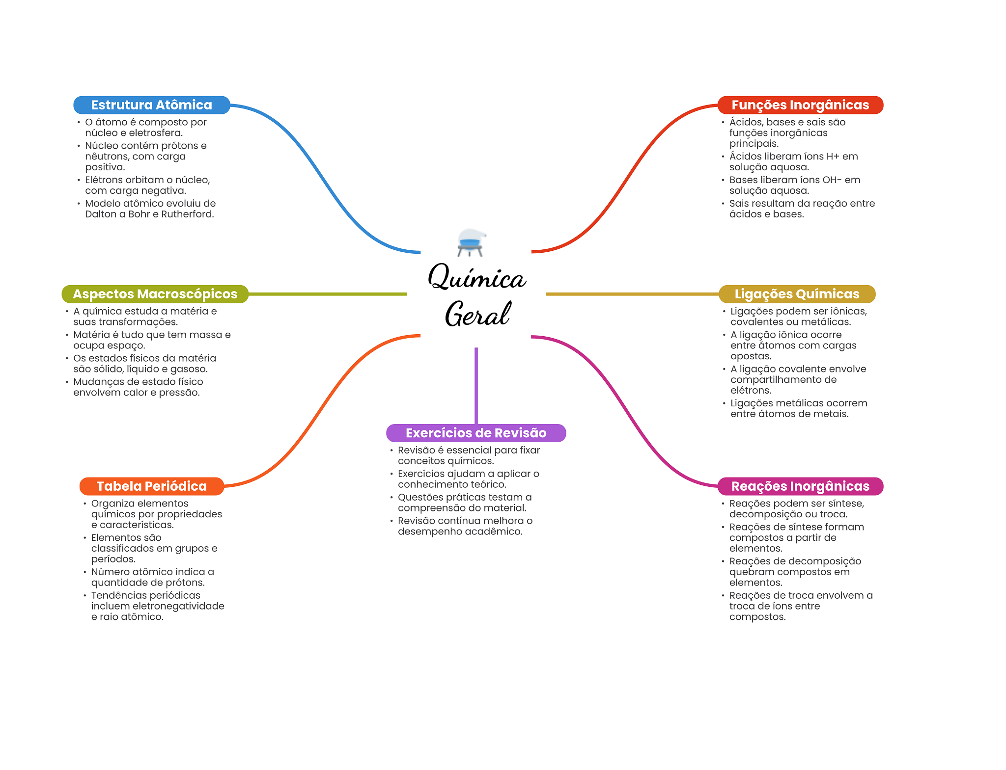 Estrutura Atômica Funções Inorgânicas átomo é composto por Ácidos, bases e sais são núcleo e eletrosfera. funções inorgânicas Núcleo contém prótons e principais. nêutrons, com carga Ácidos liberam H+ em positiva. solução aquosa. Elétrons orbitam núcleo, Bases liberam em com carga negativa. solução aquosa. Modelo atômico evoluiu de Sais resultam da reação entre Dalton a Bohr e Rutherford. ácidos e bases. Química Aspectos Macroscópicos Ligações Químicas A química estuda a matéria e suas transformações. Geral Ligações podem ser iônicas, covalentes ou metálicas. Matéria é tudo que tem massa e A ligação iônica ocorre ocupa espaço. entre átomos com cargas Os estados físicos da matéria opostas. são sólido, líquido e gasoso. A ligação covalente envolve Mudanças de estado físico compartilhamento de envolvem calor e pressão. elétrons. Ligações metálicas ocorrem entre átomos de metais. Exercícios de Revisão Revisão é essencial para fixar conceitos químicos. Exercícios ajudam a aplicar Tabela Periódica conhecimento teórico. Reações Inorgânicas Questões práticas testam a Organiza elementos compreensão do material. Reações podem ser síntese, químicos por propriedades decomposição ou troca. e características. Revisão contínua melhora O Elementos são desempenho acadêmico. Reações de síntese formam compostos a partir de classificados em grupos e elementos. períodos. Reações de decomposição Número atômico indica a quebram compostos em quantidade de prótons. elementos. Tendências periódicas Reações de troca envolvem a incluem eletronegatividade troca de ions entre e raio atômico. compostos.