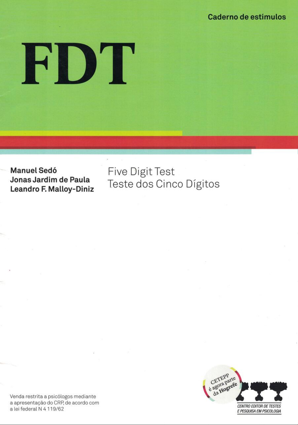 Caderno de estímulos FDT Manuel Sedó Five Digit Test Jonas Jardim de Paula Leandro F. Malloy-Diniz Teste dos Cinco Dígitos Venda restrita a psicólogos mediante a apresentação do CRP, de acordo com CENTRO EDITOR DE TESTES a lei federal N 4 119/62 E PESQUISA EM PSICOLOGIA