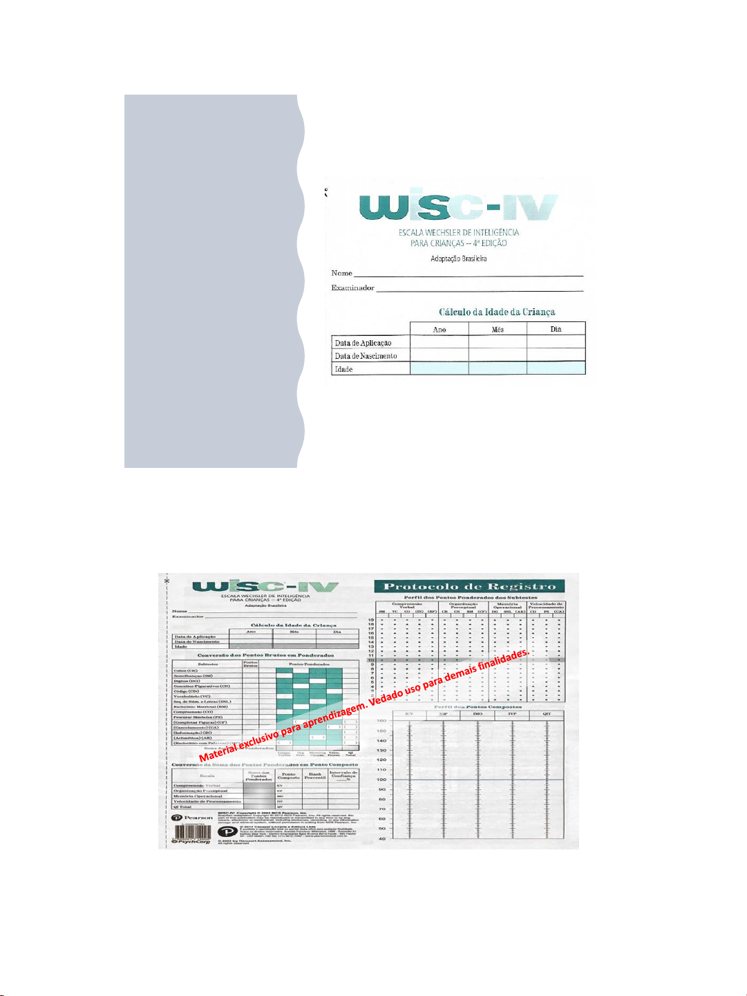 17/09/2023 35 Correção 17/09/2023 36 Pontuação 17/09/2023 37 17/09/2023 38 Aspectos importantes da correção do WISC IV • Passos da correção: 2. Calcular o total de pontos brutos dos subtestes - Cálculo já precisa estar pronto quando entrar no sistema para a correção online! Aspectos importantes da correção do WISC IV • Passos da correção: 1. Calcular a idade cronológica da criança - Na correção online, o próprio sistema faz 17/09/2023 39 Correção – Cálculo idade cronológica S c a n n e d w it h C a m S c a n n e r Aspectos importantes da correção do WISC IV • Passos da correção: 3. Converter o total de pontos brutos em pontuação ponderada - Tabelas A.1. de acordo com idade cronológica da criança. - Páginas 218 a 250 17/09/2023 40 17/09/2023 41 • Pagina 205 S ca n n ed w it h C am S ca n n er Interpretação dos Pontos Ponderados Pontos Ponderados Interpretação 01 e 02 Dificuldade grave 03 e 04 Dificuldade moderada 05, 06 e 07 Dificuldade leve 08 a 12 Média 13, 14 e 15 Média Superior 16 e 17 Superior 18 e 19 Muito Superior 17/09/2023 42 Aspectos importantes da correção do WISC IV • Passos da correção: 4. Obter a soma das pontuações ponderadas. Aspectos importantes da correção do WISC IV • Passos da correção: 5. Determinar a pontuação composta - Tabelas A2 a A6 de acordo com idade cronológica da criança. - Páginas 251 a 254 17/09/2023 43 17/09/2023 44 17/09/2023 45 Interpretação dos QIs e Índices QI Interpretação Abaixo de 70 Extremamente baixo 70 a 79 Limítrofe 80 a 89 Média Inferior 90 a 109 Média 110 a 119 Média Superior 120 a 129 Superior 130 para cima Muito Superior 17/09/2023 46 WISC IV – Índice de Compreensão Verbal (ICV) • Relação com desenvolvimento da leitura e desempenho em matemática. • Crianças com déficits no conhecimento cristalizado ou na recuperação das informações previamente adquiridas e armazenadas podem pontuar mais em SM, CO e RP do que em VC e IN se tiverem habilidades de raciocínio verbal adequadas. 17/09/2023 47 WISC IV WISC IV – Índice de Compreensão Verbal (ICV) • Avalia habilidades verbais utilizando raciocínio, compreensão e conceituação. • Tarefas que exigem conhecimento cristalizado, raciocínio verbal fluido, memória de longo prazo e compreensão • INTELIGÊNCIA CRISTALIZADA Alguém precisa me ensinar – eu sei e aplico. 17/09/2023 48 WISC IV – Índice de Compreensão Verbal (ICV) • Inteligência cristalizada - preditor de inteligência geral WISC IV – Índice de Compreensão Verbal (ICV) • INTELIGÊNCIA CRISTALIZADA Compreensão verbal e expressão, habilidade para avaliar e utilizar experiências anteriores e habilidade para transmitir informações de forma prática 17/09/2023 49 Compreensão Adequação Social Produção de linguagem Conhecimento das regras sociais e convenções WISC IV – Índice de Compreensão Verbal (ICV) • INTELIGÊNCIA CRISTALIZADA Conhecimentos factuais, memória semântica, capacidade de reter e recuperar informações adquiridas na escola e no ambiente em que vive. 17/09/2023 50 WISC IV – Índice de Compreensão Verbal (ICV) • Inteligência cristalizada + Raciocínio verbal fluido Compreensão oral, memória, capacidade de distinguir o essencial do não essencial e a forma de se expressar verbalmente WISC IV – Índice de Compreensão Verbal (ICV) • Inteligência cristalizada + Raciocínio verbal fluido Raciocínio analógico e geral, abstrações verbais, conhecimento do assunto e habilidade de criar conceitos alternativos 17/09/2023 51 WISC IV – Índice de Organização Perceptual (IOP) • Avalia raciocínio perceptual com organização visoperceptual. • Tarefas que exigem conhecimento fluido e processamento visual (gerar, perceber, analisar, sintetizar, manipular, transformar e pensar com padrões espaciais e estímulos). • INTELIGÊNCIA FLUIDA Ninguém ensinou – identificação, abstração, resolução de problemas WISC IV 17/09/2023 52 WISC IV – Índice de Organização Perceptual (IOP) • Processamento visual + Raciocínio fluido Analisar e sintetizar estímulos visuais abstratos, percepção visual e organização, pensamento simultâneo, coordenação motora e visual. Cubos Processamento visual Atenção/Função executiva Velocidade de processamento Raciocínio fluido 17/09/2023 53 WISC IV – Índice de Organização Perceptual (IOP) • Raciocínio fluido WISC IV – Índice de Organização Perceptual (IOP) • Processamento visual + Raciocínio fluido Processamento visual das informações e raciocínio abstrato 17/09/2023 54 WISC IV – Índice de Organização Perceptual (IOP) • Percepção visual (figura e fundo) + cristalizado WISC IV 17/09/2023 55 WISC IV – Índice de Memória Operacional (IMO) •MEMÓRIA OPERACIONAL •Capacidade de sustentar temporariamente uma representação mental que será utilizada na realização de tarefas cognitivas. Reter e manipular as informações a curto prazo WISC IV – Índice de Memória Operacional (IMO) Memória operacional, sequenciação, atenção auditiva e concentração. 17/09/2023 56 WISC IV – Índice de Memória Operacional (IMO) Memória operacional, sequenciação, atenção auditiva e concentração. WISC IV – Índice de Memória Operacional (IMO) Memória operacional, sequenciação, atenção auditiva e concentração e raciocínio numérico. 17/09/2023 57 WISC IV WISC IV – Índice de Velocidade de Processamento (IVP) Memória operacional, sequenciação, atenção auditiva e concentração e raciocínio numérico. Capacidade de desempenhar atividades cognitivas fluente a automaticamente, em especial quando sob pressão para manter a atenção e concentração – rapidez atenta 17/09/2023 58 WISC IV – Índice de Velocidade de Processamento (IVP) WISC IV – Índice de Velocidade de Processamento (IVP) • Procurar Símbolos 17/09/2023 59 WISC IV – Índice de Velocidade de Processamento (IVP) • Cancelamen