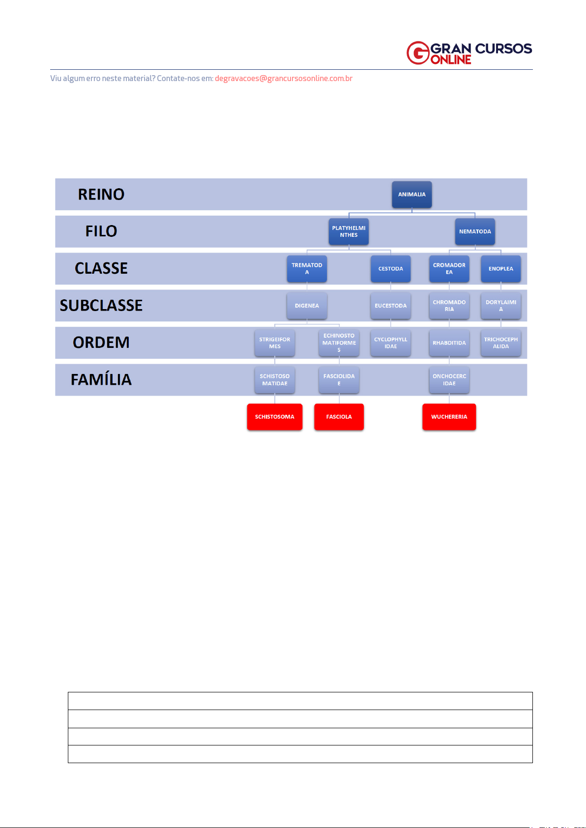 1www.grancursosonline.com.br Viu algum erro neste material? Contate-nos em: degravacoes@grancursosonline.com.br A N O TA ÇÕ E S Parasitologia Clínica – Parasitos Sanguíneos e Teciduais – Helmintos CONHECIMENTOS ESPECÍFICOS PARASITOLOGIA CLÍNICA – PARASITOS SANGUÍNEOS E TECIDUAIS – HELMINTOS HELMINTOS SANGUÍNEOS E TECIDUAIS ESQUISTOSSOMOSE Doença que também é conhecida como Xistose, Barriga-d’água ou Mal do caramujo. Foi introduzida na época do tráfico e imigrantes orientais e asiáticos. É comum em regiões com baixas condições sanitárias, pois a eliminação do parasito ocorre por meio das fezes jogadas nas beiras de córregos, rios e açudes. É uma patologia antiga, sendo descoberta em múmias com mais de 6000 anos. No Brasil, o agente causador da esquistossomose é o Schistosoma mansoni, contudo, existem outros agentes, como o Schistosoma japonicum, o Schistosoma mehongi e o Schis- tosom a intercaíatum. Parasitas de vasos sanguíneos de mamíferos e aves. Presente na África, Antilhas e América do Sul. www.grancursosonline.com.br 2www.grancursosonline.com.br Viu algum erro neste material? Contate-nos em: degravacoes@grancursosonline.com.br A N O TA ÇÕ E S Parasitologia Clínica – Parasitos Sanguíneos e Teciduais – Helmintos CONHECIMENTOS ESPECÍFICOS Morfologia 5m www.grancursosonline.com.br 3www.grancursosonline.com.br Viu algum erro neste material? Contate-nos em: degravacoes@grancursosonline.com.br A N O TA ÇÕ E S Parasitologia Clínica – Parasitos Sanguíneos e Teciduais – Helmintos CONHECIMENTOS ESPECÍFICOS Nos helmintos, o macho costuma ser menor que a fêmea. No caso específico da esquis- tossomose, o macho possui o canal ginecóforo em que a fêmea será inserida e ocorrerá o processo de reprodução. Esse espículo é característica marcante desse ovo e diferencia o Schistosoma mansoni das outras espécies de Schistosoma. www.grancursosonline.com.br 4www.grancursosonline.com.br Viu algum erro neste material? Contate-nos em: degravacoes@grancursosonline.com.br A N O TA ÇÕ E S Parasitologia Clínica – Parasitos Sanguíneos e Teciduais – Helmintos CONHECIMENTOS ESPECÍFICOS Fonte: Neves, David Pereira. Parasitologia humana / David Pereira Neves. - 13. ed. São Paulo: Editora Atheneu, 2016. www.grancursosonline.com.br 5www.grancursosonline.com.br Viu algum erro neste material? Contate-nos em: degravacoes@grancursosonline.com.br Parasitologia Clínica – Parasitos Sanguíneos e Teciduais – Helmintos CONHECIMENTOS ESPECÍFICOS Fonte: Neves, David Pereira. Parasitologia humana / David Pereira Neves. - 13. ed. São Paulo: Editora Atheneu, 2016. 10m www.grancursosonline.com.br 6www.grancursosonline.com.br Viu algum erro neste material? Contate-nos em: degravacoes@grancursosonline.com.br A N O TA ÇÕ E S Parasitologia Clínica – Parasitos Sanguíneos e Teciduais – Helmintos CONHECIMENTOS ESPECÍFICOS • Cp: glândulas de penetração; Ga: glândulas adesivas; • Cf: células flama; Te: túbulos excretores; • Pe: poro excretor; • Tb: terebratorium; • Vo: ventosa oral; • Po: poro oral; • Dgp: duetos das glândulas de penetração; • C: ceco; • Gp: gândulas de penetração; • Vv: ventosa ventral; • Pg: primórdio genital. Fonte: Neves, David Pereira. Parasitologia humana / David Pereira Neves. - 13. ed. São Paulo: Editora Atheneu, 2016. Obs.: vale lembrar que a cauda não possui estruturas importantes e que também será per- dida no momento da infecção. Ciclo Biológico: • Vermes vivem no sistema porta (fígado); • Vida média de 5 anos; • Transmissão: penetração de pele e mucosas. www.grancursosonline.com.br 7www.grancursosonline.com.br Viu algum erro neste material? Contate-nos em: degravacoes@grancursosonline.com.br A N O TA ÇÕ E S Parasitologia Clínica – Parasitos Sanguíneos e Teciduais – Helmintos CONHECIMENTOS ESPECÍFICOS Taxonomia do hospedeiro: • Filo Mollusca; • Classe Gastropoda; • Subclasse Pulmonata; • Ordem Basommomatophora; • Família Planorbidae; • Gênero Biomphalaria. Principais espécies de hospedeiros intermediários: • Biomphalaria tenagophila; • Biomphalaria glabrata; • Biomphalaria straminea. O ser humano é um dos hospedeiros definitivos e local em que haverá a reprodução sexuada. Vermes adultos: • Atingem a maturidade: 25 a 28 dias após a penetração; • Deposição de ovos: 35 dias; • Surgimentos de ovos nas fezes: 42 dias. 15m www.grancursosonline.com.br 8www.grancursosonline.com.br Viu algum erro neste material? Contate-nos em: degravacoes@grancursosonline.com.br A N O TA ÇÕ E S Parasitologia Clínica – Parasitos Sanguíneos e Teciduais – Helmintos CONHECIMENTOS ESPECÍFICOS Fonte: Neves, David Pereira. Parasitologia humana / David Pereira Neves. - 13. ed. São Paulo: Editora Atheneu, 2016. De uma forma mais detalhada: • Ao atingirem a fase adulta, migram para a veia mesentérica inferior e acasalam; • Postura de ovos e eliminação nas fezes; www.grancursosonline.com.br 9www.grancursosonline.com.br Viu algum erro neste material? Contate-nos em: degravacoes@grancursosonline.com.br A N O TA ÇÕ E S Parasitologia Clínica – Parasitos Sanguíneos e Teciduais – Helmintos CONHECIMENTOS ESPECÍFICOS • Em água, os ovos liberam miracídios; • Miracídios são atraídos por substâncias liberadas pelos caramujos; • Invasão do caramujo com auxílio do terebratorium, glândula de penetração e enzimas; • Perda de estruturas e transformação em esporocisto; • Intenso processo de multiplicação, migração e transformação em cercarias; • Penetração da cercária na pele humana e transformam-se em esquistossômulos; • Migração pelo tecido subcutâneo e vascular aos pulmões e coração; • Migram para o sistema porta e desenvolvem-se em vermes. Patogenia Sintomas provenientes de uma resposta inflamatória granulomatosa que ocorre em torno dos ovos do parasito. Esses ovos liberam antígenos solúveis, que s