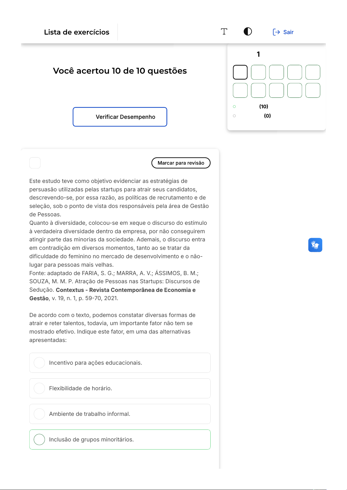 Verifique o seu desempenho e continue treinando! Você pode refazer o exercício quantas vezes quiser. A B C D 1 Este estudo teve como objetivo evidenciar as estratégias de persuasão utilizadas pelas startups para atrair seus candidatos, descrevendo-se, por essa razão, as políticas de recrutamento e de seleção, sob o ponto de vista dos responsáveis pela área de Gestão de Pessoas. Quanto à diversidade, colocou-se em xeque o discurso do estímulo à verdadeira diversidade dentro da empresa, por não conseguirem atingir parte das minorias da sociedade. Ademais, o discurso entra em contradição em diversos momentos, tanto ao se tratar da dificuldade do feminino no mercado de desenvolvimento e o não- lugar para pessoas mais velhas. Fonte: adaptado de FARIA, S. G.; MARRA, A. V.; ÁSSIMOS, B. M.; SOUZA, M. M. P. Atração de Pessoas nas Startups: Discursos de Sedução. , v. 19, n. 1, p. 59�70, 2021. De acordo com o texto, podemos constatar diversas formas de atrair e reter talentos, todavia, um importante fator não tem se mostrado efetivo. Indique este fator, em uma das alternativas apresentadas: Incentivo para ações educacionais. Flexibilidade de horário. Ambiente de trabalho informal. Inclusão de grupos minoritários. Questão de 10 Corretas Em branco 1 2 3 4 5 6 7 8 9 10 Equipe e Produto Firefox https://estacio.saladeavaliacoes.com.br/exercicio/699b544647f1180ee... 1 of 11 22/02/2026, 16:13 E A B C Utilização de redes sociais. Parabéns, você selecionou a alternativa correta. Confira o gabarito comentado! A inclusão de grupos minoritários, apesar de ser um fator preponderante que pode colaborar para atração e retenção de talentos, não se mostrou efetiva na pesquisa desenvolvida. Constatou-se que a contratação de pessoas mais velhas e de mulheres é ainda um ponto dissonante na forma de atuação de organizações que atuam com foco na inovação como as startups. 2 “Os resultados da pesquisa levaram à identificação de que os itens que mais influenciam a fidelidade do cliente no varejo farmacêutico são popularidade, nível de conhecimento e familiaridade das marcas mais frequentadas (drogarias), enquanto para as marcas menos frequentadas (drogarias) esses itens são o nível de conhecimento e familiaridade. Esses resultados mostram uma relação positiva entre a reputação da marca e a fidelidade do cliente, ou seja, quanto melhor a reputação da marca, mais aumenta a fidelidade para com as drogarias do estudo.” PEREIRA, P. E. J.; ARDIGÓ, C. M.; LIMBERGER, P. F. Reputação da Marca e a Relação com a Fidelidade do Cliente no Varejo Farmacêutico: Um Estudo de Caso. , v. 23, n. 3, p. 557�570, 2021. Os clientes são mais fiéis às marcas mais conhecidas de drogarias. Qual seria uma forma de divulgação que poderia permitir uma retenção maior de clientes? Inbound marketing. Campanha publicitária nos bairros. Divulgação em redes sociais. Firefox https://estacio.saladeavaliacoes.com.br/exercicio/699b544647f1180ee... 2 of 11 22/02/2026, 16:13 D E A B C Disparos periódicos de e-mail aos clientes cadastrados. Eventos de promoção nas drogarias. Parabéns, você selecionou a alternativa correta. Confira o gabarito comentado! A abordagem de atrair e reter clientes com conteúdos e ferramentas voltadas para as suas expectativas é a forma de divulgação conhecida como inbound marketing, que congrega várias formas de comunicação voltadas para fidelização dos clientes. Não tem foco nos produtos e serviços ofertados, mas na entrega de valor aos consumidores. 3 “O interesse nesta investigação centra-se na compreensão do papel do inbound marketing na estratégia de comunicação. O enfoque é assimilar o contributo dos conteúdos nas redes sociais na atração do consumidor, aplicado ao caso do turismo. Os resultados deste estudo indiciam que os conteúdos são o elemento chave de comunicação da marca com o consumidor final. Desta forma, a marca procura posicionar-se como líder de opinião na área das viagens, apresentando-se como uma relevante fonte de informação para o consumidor.” SILVEIRA, P.; PINTO, J. Comunicação digital e inbound marketing: estratégias aplicadas ao setor do turismo em Portugal. , v. 7, n. 1, p. 1�42, 2022. A partir do texto apresentado, aponte a alternativa que melhor identifique a abordagem do inbound marketing. Apresentação de informações sobre os produtos e serviços ofertados. Anúncios publicitários com influenciadores digitais. Live chat para interação com clientes. Firefox https://estacio.saladeavaliacoes.com.br/exercicio/699b544647f1180ee... 3 of 11 22/02/2026, 16:13 D E A B C D E Stories em redes sociais. Conteúdos atraentes que estejam conectados com as preferências do consumidor. Parabéns, você selecionou a alternativa correta. Confira o gabarito comentado! O inbound marketing utiliza-se de diversas formas de comunicação para atrair e reter consumidores. Neste caso, a organização tem conteúdos diferenciados para os clientes atuais e para os clientes potenciais. As demais alternativas apresentadas contribuem para o inbound marketing quando são orquestradas para atuarem de forma sistêmica com os consumidores. 4 O design thinking é utilizado, frequentemente, no levantamento de ideias iniciais para posterior implementação. Identifique a alternativa que apresenta a característica principal desta abordagem. Requisitos funcionais do sistema. Foco nas necessidades e expectativas do cliente. Implantação da solução. Inspiração. Ideação. Parabéns, você selecionou a alternativa correta. Confira o gabarito comentado! Firefox https://estacio.saladeavaliacoes.com.br/exercicio/699b544647f1180ee... 4 of 11 22/02/2026, 16:13 A B C D E O grande diferencial existente na abordagem do design thinking é a empatia que deve-se ter com o cliente. O que ele pensa, o que precisa, materializadas em suas necessidades e expectativas. A inspiração, ideação e implantação são etapas do 