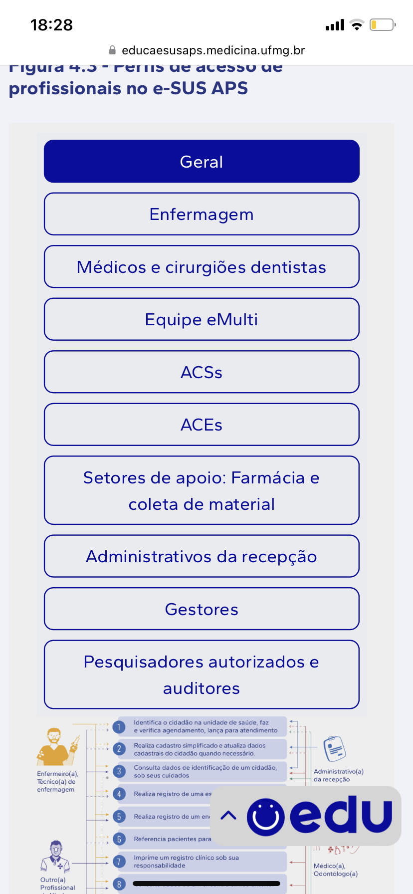 18:28 educaesusaps.medicina.ufmg.br Figura - acesso profissionais no e-SUS APS Geral Enfermagem Médicos e cirurgiões dentistas Equipe eMulti ACSs ACEs Setores de apoio: Farmácia e coleta de material Administrativos da recepção Gestores Pesquisadores autorizados e auditores Identifica cidadão na unidade de saúde, faz 1 e verifica agendamento, lança para atendimento 2 Realiza cadastro simplificado e atualiza dados cadastrais do cidadão quando necessário. Enfermeiro(a), 3 Consulta dados de identificação de um cidadão, Administrativo(a) sob seus cuidados Técnico(a) de da recepção enfermagem 4 Realiza registro de uma es 5 Realiza registro de um en 6 Referencia pacientes para 7 Imprime um registro clínico sob sua responsabilidade Médico(a), Odontólogo(a) Outro(a) Profissional 8