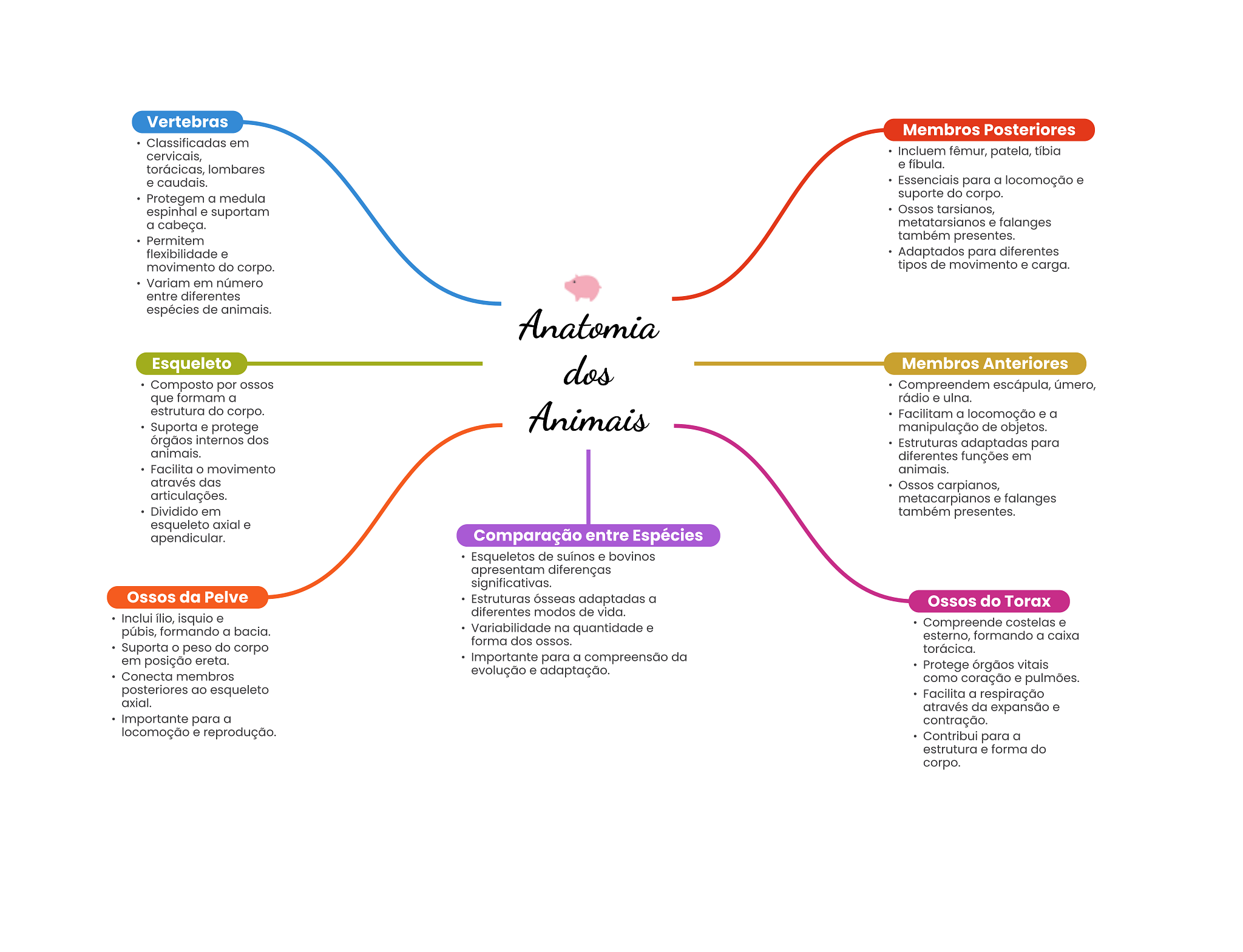 Vertebras Membros Posteriores Classificadas em cervicais, Incluem fêmur, patela, tíbia torácicas, lombares e fíbula. e caudais. Essenciais para a locomoção e Protegem a medula suporte do corpo. espinhal e suportam Ossos tarsianos, a cabeça. metatarsianos e falanges Permitem também presentes. flexibilidade e Adaptados para diferentes movimento do corpo. tipos de movimento e carga. Variam em número entre diferentes espécies de animais. Anatomia Esqueleto dos Membros Anteriores Composto por OSSOS Compreendem escápula, úmero, que formam a rádio e ulna. estrutura do corpo. Animais Facilitam a locomoção e a Suporta e protege manipulação de objetos. órgãos internos dos Estruturas adaptadas para animais. diferentes funções em Facilita movimento animais. através das Ossos carpianos, articulações. metacarpianos e falanges Dividido em também presentes. esqueleto axial e apendicular. Comparação entre Espécies Esqueletos de suínos e bovinos apresentam diferenças significativas. Ossos da Pelve Estruturas ósseas adaptadas a Ossos do Torax diferentes modos de vida. Inclui isquio e púbis, formando a bacia. Variabilidade na quantidade e Compreende costelas e forma dos OSSOS. esterno, formando a caixa Suporta peso do corpo torácica. em posição ereta. Importante para a compreensão da evolução e adaptação. Protege órgãos vitais Conecta membros como coração e pulmões. posteriores ao esqueleto Facilita a respiração axial. através da expansão e Importante para a contração. locomoção e reprodução. Contribui para a estrutura e forma do corpo.