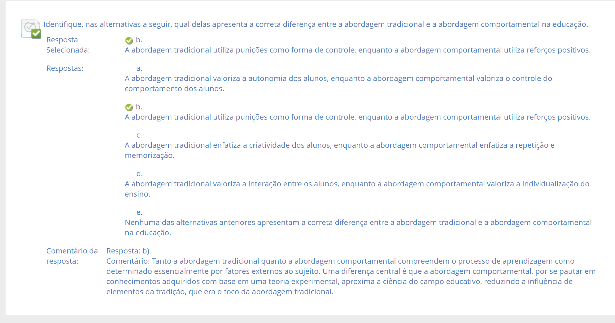 Identifique, nas alternativas a seguir, qual delas apresenta a correta diferença entre a abordagem tradicional e a abordagem comportamental na educação. Resposta b. Selecionada: A abordagem tradicional utiliza punições como forma de controle, enquanto a abordagem comportamental utiliza reforços positivos. Respostas: a. A abordagem tradicional valoriza a autonomia dos alunos, enquanto a abordagem comportamental valoriza controle do comportamento dos alunos. b. A abordagem tradicional utiliza punições como forma de controle, enquanto a abordagem comportamental utiliza reforços positivos. C. A abordagem tradicional enfatiza a criatividade dos alunos, enquanto a abordagem comportamental enfatiza a repetição e memorização. d. A abordagem tradicional valoriza a interação entre os alunos, enquanto a abordagem comportamental valoriza a individualização do ensino. e. Nenhuma das alternativas anteriores apresentam a correta diferença entre a abordagem tradicional e a abordagem comportamental na educação. Comentário da Resposta: b) resposta: Comentário: Tanto a abordagem tradicional quanto a abordagem comportamental compreendem processo de aprendizagem como determinado essencialmente por fatores externos ao sujeito. Uma diferença central é que a abordagem comportamental, por se pautar em conhecimentos adquiridos com base em uma teoria experimental, aproxima a ciência do campo educativo, reduzindo a influência de elementos da tradição, que era foco da abordagem tradicional.