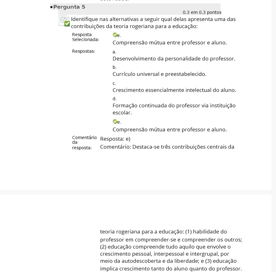 Pergunta 5 0,3 em 0,3 pontos Identifique nas alternativas a seguir qual delas apresenta uma das contribuições da teoria rogeriana para a educação: Resposta e. Selecionada: Compreensão mútua entre professor e aluno. Respostas: a. Desenvolvimento da personalidade do professor. b. Currículo universal e preestabelecido. C. Crescimento essencialmente intelectual do aluno. d. Formação continuada do professor via instituição escolar. e. Compreensão mútua entre professor e aluno. Comentário Resposta: e) da resposta: Comentário: Destaca-se três contribuições centrais da teoria rogeriana para a educação: (1) habilidade do professor em compreender-se e compreender os outros; (2) educação compreende tudo aquilo que envolve O crescimento pessoal, interpessoal e intergrupal, por meio da autodescoberta e da liberdade; e (3) educação implica crescimento tanto do aluno quanto do professor.