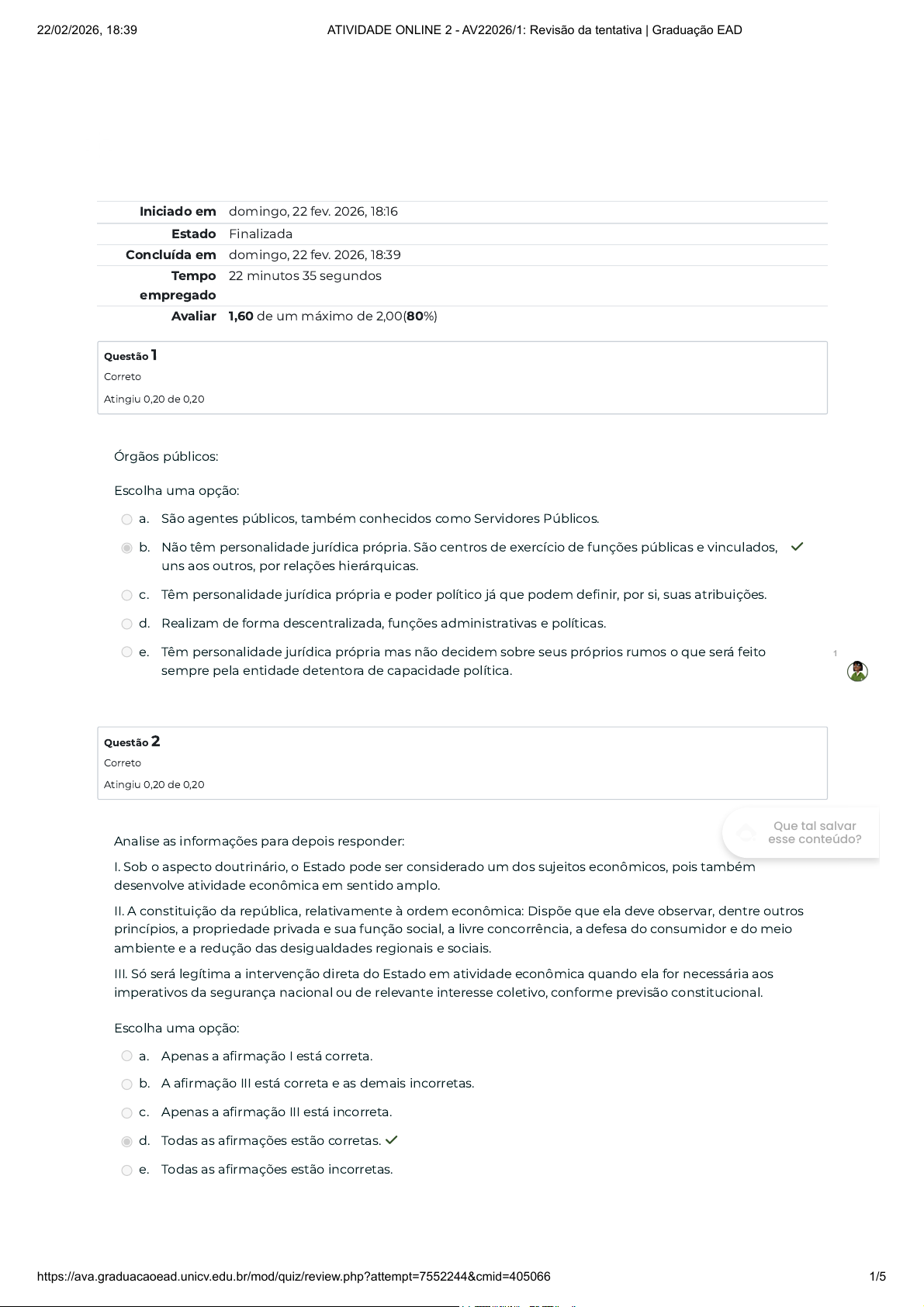 Iniciado em domingo, 22 fev. 2026, 18:16 Estado Finalizada Concluída em domingo, 22 fev. 2026, 18:39 Tempo empregado 22 minutos 35 segundos Avaliar 1,60 de um máximo de 2,00(80%) Questão 1 Correto Atingiu 0,20 de 0,20 Questão 2 Correto Atingiu 0,20 de 0,20 Órgãos públicos: Escolha uma opção: a. São agentes públicos, também conhecidos como Servidores Públicos. b. Não têm personalidade jurídica própria. São centros de exercício de funções públicas e vinculados, uns aos outros, por relações hierárquicas. ✓ c. Têm personalidade jurídica própria e poder político já que podem definir, por si, suas atribuições. d. Realizam de forma descentralizada, funções administrativas e políticas. e. Têm personalidade jurídica própria mas não decidem sobre seus próprios rumos o que será feito sempre pela entidade detentora de capacidade política. Analise as informações para depois responder: I. Sob o aspecto doutrinário, o Estado pode ser considerado um dos sujeitos econômicos, pois também desenvolve atividade econômica em sentido amplo. II. A constituição da república, relativamente à ordem econômica: Dispõe que ela deve observar, dentre outros princípios, a propriedade privada e sua função social, a livre concorrência, a defesa do consumidor e do meio ambiente e a redução das desigualdades regionais e sociais. III. Só será legítima a intervenção direta do Estado em atividade econômica quando ela for necessária aos imperativos da segurança nacional ou de relevante interesse coletivo, conforme previsão constitucional. Escolha uma opção: a. Apenas a afirmação I está correta. b. A afirmação III está correta e as demais incorretas. c. Apenas a afirmação III está incorreta. d. Todas as afirmações estão corretas. ✓ e. Todas as afirmações estão incorretas. 1 Que tal salvar esse conteúdo? 22/02/2026, 18:39 ATIVIDADE ONLINE 2 - AV22026/1: Revisão da tentativa | Graduação EAD https://ava.graduacaoead.unicv.edu.br/mod/quiz/review.php?attempt=7552244&cmid=405066 1/5 Questão 3 Correto Atingiu 0,20 de 0,20 Questão 4 Correto Atingiu 0,20 de 0,20 Questão 5 Incorreto Atingiu 0,00 de 0,20 Marque a alternativa incorreta: Escolha uma opção: a. A exigência de licitação e de concursos públicos são decorrência da impessoalidade com que deve agir a Administração Pública. b. O princípio da publicidade não admite qualquer exceção, em hipótese alguma, sendo valor absoluto no regime da Administração Pública brasileira. ✓ c. O princípio da impessoalidade aponta para a circunstância de que a Administração Pública não poderá atuar discriminando pessoas de forma gratuita, a não ser aquelas que venham privilegiar o interesse público. d. Impõe-se à Administração Pública a obrigação e o dever de dar total transparência a todos os atos que praticar. e. A transparência e publicidade da Administração Púbica decorrem dos regimes democrático e republicano adotados pela Constituição Federal de 1988. Serviços Públicos: Escolha uma opção: a. São atividades desenvolvidas direta e exclusivamente pelo Poder Público. b. São atividades políticas-governamentais que se envolvem nas ações desenvolvidas pelo poder público. c. São caracterizados pelo fato de serem atividades públicas ou privadas, assumida pela entidade pública ou particular segundo a capacidade de investimento de cada um. d. Estão entre as principais atividades administrativas concretas desenvolvidas pela entidade estatal competente, no exercício das atribuições previstas na Constituição e nas leis. ✓ e. São todas as atividades desenvolvidas pela Administração Pública. Ou seja, a atividade da Administração Pública é prestar Serviços Públicos e, nesse conceito, estão incluídos todos os tipos de ações estatais. Funções públicas são tarefas que a constituição e a lei atribuem: Escolha uma opção: a. À União, Estados, Distrito Federal e Municípios. b. À União, Estados, Distrito Federal, Municípios e Territórios. × c. À União, Estados, Distrito Federal e Territórios. d. Aos Estados e Distrito Federal apenas. e. Aos Estados, Distrito Federal e Municípios apenas. 1 Que tal salvar esse conteúdo? 22/02/2026, 18:39 ATIVIDADE ONLINE 2 - AV22026/1: Revisão da tentativa | Graduação EAD https://ava.graduacaoead.unicv.edu.br/mod/quiz/review.php?attempt=7552244&cmid=405066 2/5 Questão 6 Correto Atingiu 0,20 de 0,20 Questão 7 Correto Atingiu 0,20 de 0,20 São atributos do poder de polícia: Escolha uma opção: a. Irreversibilidade, imperatividade, facultatividade para o particular. b. É transferível ao particular, facultatividade e vinculação à lei. c. Auto-executoriedade, coercibilidade e indelegabilidade. ✓ d. Ilegalidade, impessoalidade e eficiência. e. Auto-executoriedade, facultatividade e discricionariedade. Analise as informações para depois responder: I. Órgãos públicos exercem parcelas de funções públicas. II. Órgãos públicos são centros de competência do Estado. III. Órgão público é o resultado do fracionamento da Administração Pública em centros de exercício da função pública, de acordo com a vocação especializada de cada um. Escolha uma opção: a. Todas as afirmações estão incorretas. b. A afirmação III está correta e as demais incorretas. c. Apenas a afirmação I está correta. d. Todas as afirmações estão corretas. ✓ e. Apenas a afirmação II está incorreta. 1 Que tal salvar esse conteúdo? 22/02/2026, 18:39 ATIVIDADE ONLINE 2 - AV22026/1: Revisão da tentativa | Graduação EAD https://ava.graduacaoead.unicv.edu.br/mod/quiz/review.php?attempt=7552244&cmid=405066 3/5 Questão 8 Correto Atingiu 0,20 de 0,20 Questão 9 Incorreto Atingiu 0,00 de 0,20 Analise as informações para depois responder: I. O serviço público se traduz numa atividade positiva do Estado, numa ação estatal, num fazer, no entregar algo (prestação positiva) ao destinatár