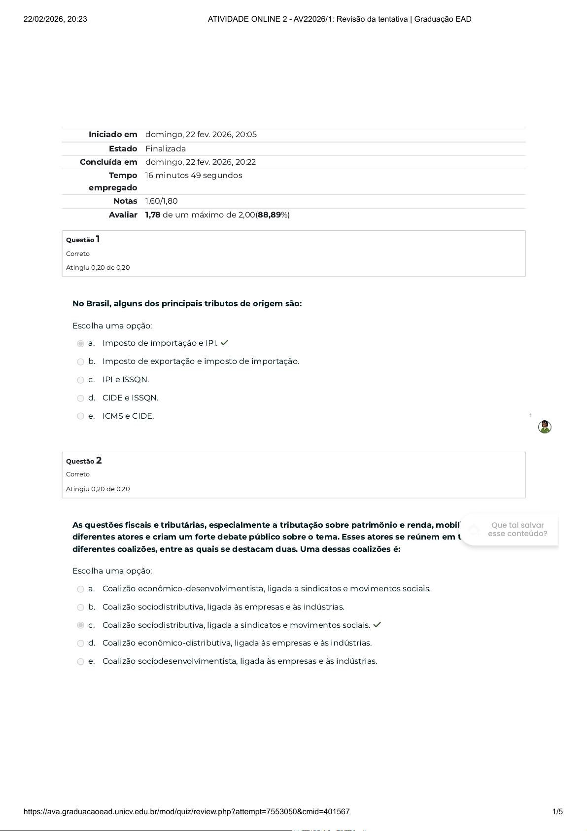 Iniciado em domingo, 22 fev. 2026, 20:05 Estado Finalizada Concluída em domingo, 22 fev. 2026, 20:22 Tempo empregado 16 minutos 49 segundos Notas 1,60/1,80 Avaliar 1,78 de um máximo de 2,00(88,89%) Questão 1 Correto Atingiu 0,20 de 0,20 Questão 2 Correto Atingiu 0,20 de 0,20 No Brasil, alguns dos principais tributos de origem são: Escolha uma opção: a. Imposto de importação e IPI. ✓ b. Imposto de exportação e imposto de importação. c. IPI e ISSQN. d. CIDE e ISSQN. e. ICMS e CIDE. As questões fiscais e tributárias, especialmente a tributação sobre patrimônio e renda, mobilizam diferentes atores e criam um forte debate público sobre o tema. Esses atores se reúnem em torno de diferentes coalizões, entre as quais se destacam duas. Uma dessas coalizões é: Escolha uma opção: a. Coalizão econômico-desenvolvimentista, ligada a sindicatos e movimentos sociais. b. Coalizão sociodistributiva, ligada às empresas e às indústrias. c. Coalizão sociodistributiva, ligada a sindicatos e movimentos sociais. ✓ d. Coalizão econômico-distributiva, ligada às empresas e às indústrias. e. Coalizão sociodesenvolvimentista, ligada às empresas e às indústrias. 1 Que tal salvar esse conteúdo? 22/02/2026, 20:23 ATIVIDADE ONLINE 2 - AV22026/1: Revisão da tentativa | Graduação EAD https://ava.graduacaoead.unicv.edu.br/mod/quiz/review.php?attempt=7553050&cmid=401567 1/5 Questão 3 Correto Atingiu 0,20 de 0,20 Questão 4 Correto Atingiu 0,20 de 0,20 Questão 5 Incorreto Atingiu 0,00 de 0,20 Segundo, exclusivamente, um dos princípios de origem ou de destino, teríamos a seguinte situação, com relação aos tributos de importação e de exportação: I. Segundo o princípio de origem, tanto as importações quanto as exportações seriam tributadas. II. Segundo o princípio de origem, as importações seriam isentas e as exportações tributadas. III. Segundo o princípio de destino, as importações seriam isentas e as exportações tributadas. IV. Segundo o princípio de destino, as exportações seriam isentas e as importações tributadas. Marque a alternativa que apresenta as assertivas corretas. Escolha uma opção: a. Apenas as assertivas I e III. b. Apenas a assertiva I. c. Apenas as assertivas I e IV. d. Apenas as assertivas II e III. ✓ e. Apenas as assertivas II e IV. Por que, nos âmbitos estadual e municipal, o tipo de tributação do imposto de renda adotado pelas empresas não é relevante? Escolha uma opção: a. Porque as empresas estaduais e municipais são isentas de imposto de renda. b. Porque elas não pagam imposto de renda. c. Porque não causa impacto na apuração de impostos estaduais e municipais. ✓ d. Porque elas optam entre pagar o imposto de renda ou os impostos estaduais e municipais. e. Porque elas recolhem pelo Simples. É o segundo momento do processo de política pública e envolve a identificação e delimitação do problema. Estamos falando de qual etapa? Escolha uma opção: a. A execução. b. A formação da agenda. × c. A formulação. d. A elaboração das políticas. e. A implementação. 1 Que tal salvar esse conteúdo? 22/02/2026, 20:23 ATIVIDADE ONLINE 2 - AV22026/1: Revisão da tentativa | Graduação EAD https://ava.graduacaoead.unicv.edu.br/mod/quiz/review.php?attempt=7553050&cmid=401567 2/5 Questão 6 Correto Atingiu 0,20 de 0,20 Questão 7 Completo Não avaliada As origens das receitas que financiam os gastos públicos são agrupadas em fontes de recursos, permitindo a demonstração da relação existente entre as fontes de financiamento e os gastos públicos. Essas receitas são divididas em dois tipos. A receita própria pertence a que tipo de receita? Escolha uma opção: a. Receita ordinária. b. Receita primária. ✓ c. Receita financeira. d. Receita de operação de crédito. e. Receita vinculada. O déficit público é a diferença entre todos os gastos orçamentários e todas as receitas financeiras e não financeiras arrecadadas pelo governo. Ou seja, o déficit público acontece quando o governo gasta mais do que arrecada. Na avaliação da situação financeira de um país, são considerados alguns conceitos de déficit. Como é chamado o déficit que corresponde à receita pública menos a despesa pública, incluindo os gastos que o governo tem com juros e correção monetária de empréstimos que precisou contrair para pagar essa diferença entre gasto e receita? Escolha uma opção: a. Déficit orçamentário. b. Déficit primário. c. Déficit comercial. d. Déficit nominal. e. Déficit operacional. 1 Que tal salvar esse conteúdo? 22/02/2026, 20:23 ATIVIDADE ONLINE 2 - AV22026/1: Revisão da tentativa | Graduação EAD https://ava.graduacaoead.unicv.edu.br/mod/quiz/review.php?attempt=7553050&cmid=401567 3/5 Questão 8 Correto Atingiu 0,20 de 0,20 Questão 9 Correto Atingiu 0,20 de 0,20 O que são subsídios? Escolha uma opção: a. Toda ajuda oficial de governo, seja de natureza comercial, financeira, cambial ou fiscal, com o fim de estimular a produtividade de indústrias instaladas no país. ✓ b. Ato do poder público quando abre mão de uma parte dos recursos que receberia para incentivar a execução de iniciativas sociais, culturais, educacionais, de saúde e esportivas, em benefício de várias pessoas. c. Instrumentos utilizados pelo governo a fim de estimular pessoas físicas ou jurídicas a desenvolverem projetos culturais, sociais e esportivos para a sociedade e terem em troca redução ou isenção de alguns impostos e contribuições. d. Todas as ações, metas e planos traçados pelos governos, nas três esferas de atuação, para promover o bem-estar da sociedade e o interesse público. e. Conjunto de decisões, recursos a serem alocados, um plano geral de ação, um público-alvo ou vários públicos, metas e objetivos a serem atingidos, definidos em função de normas e valores. A atividade financeira do Estado diz respeito ao desempenho de atividades politicas, econômicas e admin