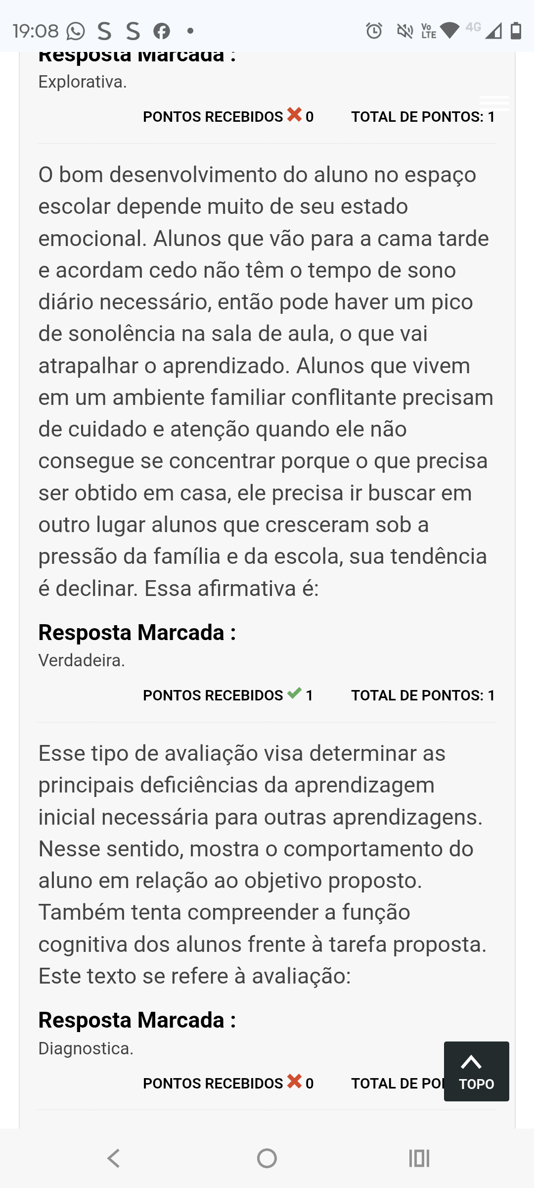 19:08 S S Vo 4G LTE Resposta : Explorativa. PONTOS RECEBIDOS TOTAL DE PONTOS: 1 bom desenvolvimento do aluno no espaço escolar depende muito de seu estado emocional. Alunos que vão para a cama tarde e acordam cedo não têm tempo de sono diário necessário, então pode haver um pico de sonolência na sala de aula, que vai atrapalhar o aprendizado. Alunos que vivem em um ambiente familiar conflitante precisam de cuidado e atenção quando ele não consegue se concentrar porque que precisa ser obtido em casa, ele precisa ir buscar em outro lugar alunos que cresceram sob a pressão da família e da escola, sua tendência é declinar. Essa afirmativa é: Resposta Marcada : Verdadeira. PONTOS RECEBIDOS 1 TOTAL DE PONTOS: 1 Esse tipo de avaliação visa determinar as principais deficiências da aprendizagem inicial necessária para outras aprendizagens. Nesse sentido, mostra comportamento do aluno em relação ao objetivo proposto. Também tenta compreender a função cognitiva dos alunos frente à tarefa proposta. Este texto se refere à avaliação: Resposta Marcada : Diagnostica. PONTOS RECEBIDOS 0 TOTAL DE POI TOPO