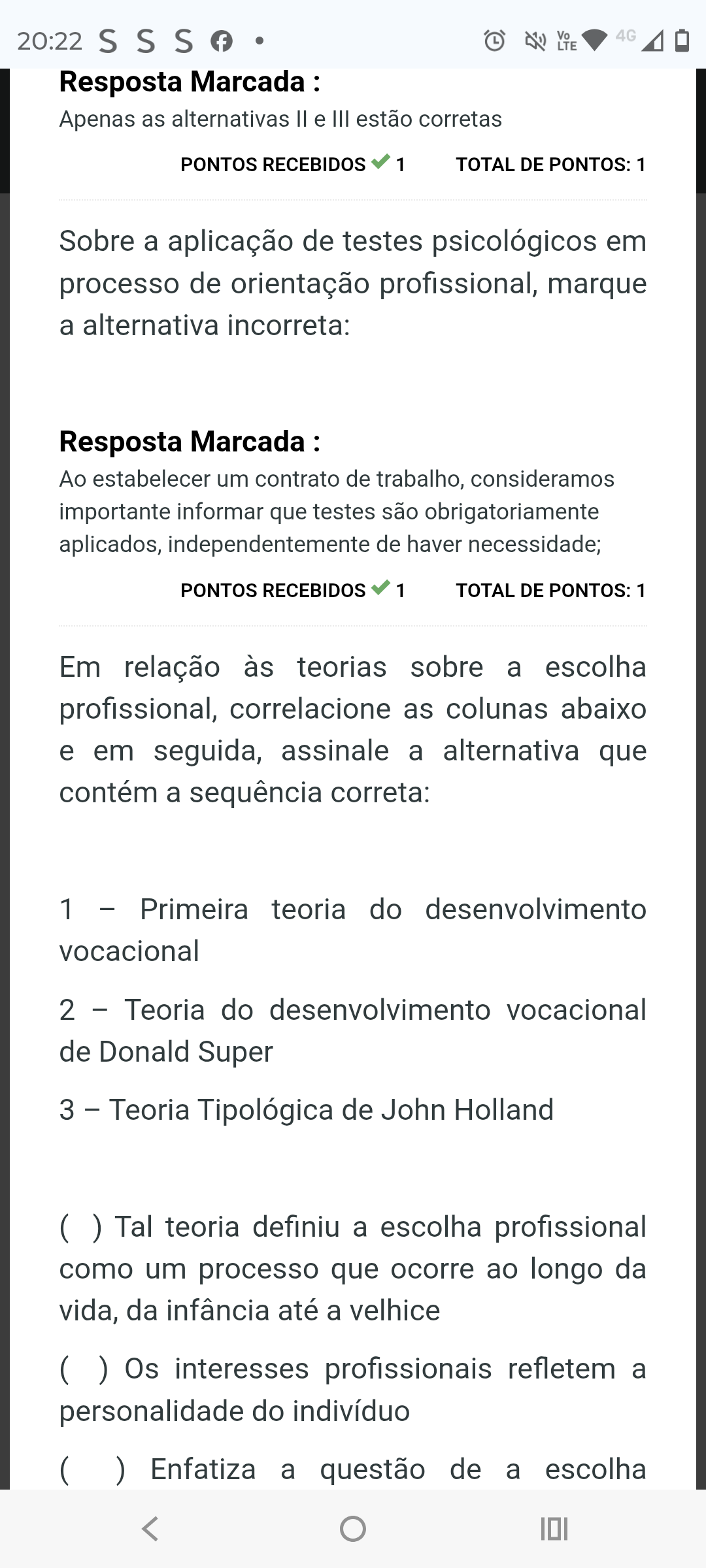 Vo 4G LTE Resposta Marcada : Apenas as alternativas e III estão corretas PONTOS RECEBIDOS 1 TOTAL DE PONTOS: 1 Sobre a aplicação de testes psicológicos em processo de orientação profissional, marque a alternativa incorreta: Resposta Marcada : Ao estabelecer um contrato de trabalho, consideramos importante informar que testes são obrigatoriamente aplicados, independentemente de haver necessidade; PONTOS RECEBIDOS 1 TOTAL DE PONTOS: 1 Em relação às teorias sobre a escolha profissional, correlacione as colunas abaixo e em seguida, assinale a alternativa que contém a sequência correta: 1 - Primeira teoria do desenvolvimento vocacional 2 - Teoria do desenvolvimento vocacional de Donald Super 3 Teoria Tipológica de John Holland ( ) Tal teoria definiu a escolha profissional como um processo que ocorre ao longo da vida, da infância até a velhice ( ) Os interesses profissionais refletem a personalidade do indivíduo ( ) Enfatiza a questão de a escolha