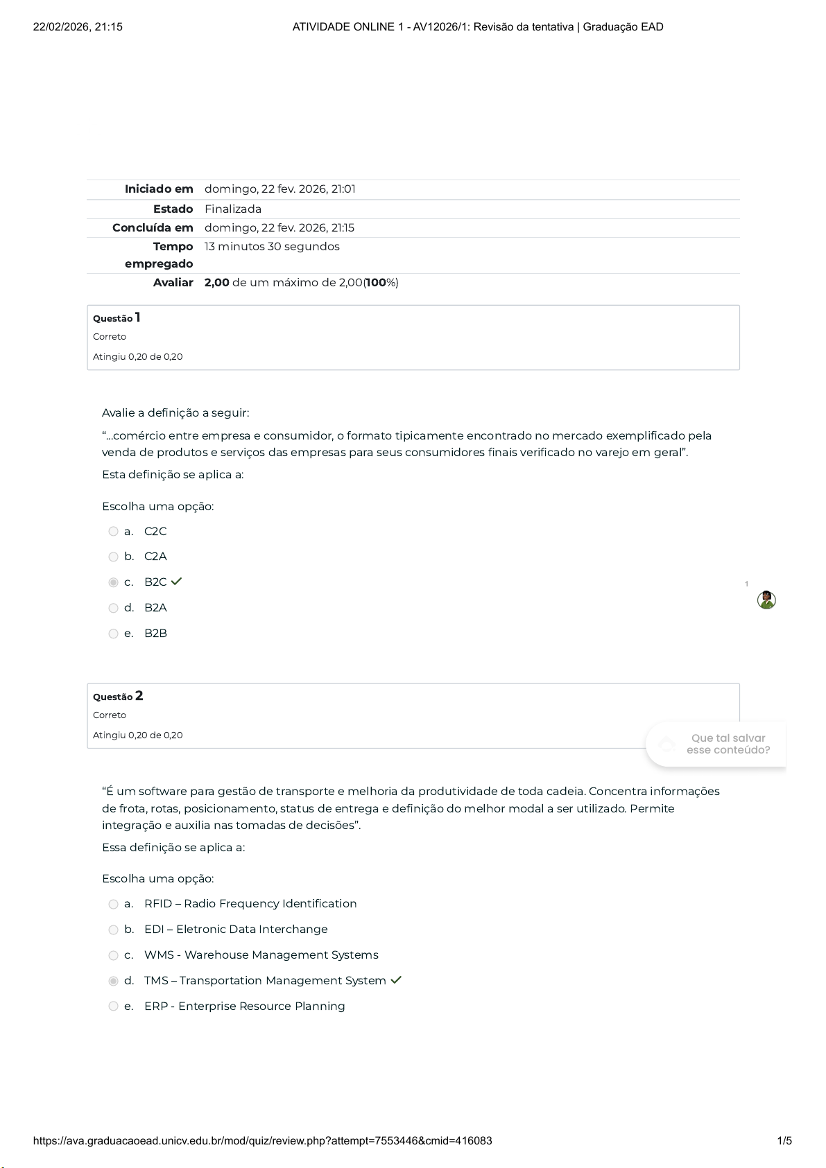 Iniciado em domingo, 22 fev. 2026, 21:01 Estado Finalizada Concluída em domingo, 22 fev. 2026, 21:15 Tempo empregado 13 minutos 30 segundos Avaliar 2,00 de um máximo de 2,00(100%) Questão 1 Correto Atingiu 0,20 de 0,20 Questão 2 Correto Atingiu 0,20 de 0,20 Avalie a definição a seguir: “...comércio entre empresa e consumidor, o formato tipicamente encontrado no mercado exemplificado pela venda de produtos e serviços das empresas para seus consumidores finais verificado no varejo em geral”. Esta definição se aplica a: Escolha uma opção: a. C2C b. C2A c. B2C ✓ d. B2A e. B2B “É um software para gestão de transporte e melhoria da produtividade de toda cadeia. Concentra informações de frota, rotas, posicionamento, status de entrega e definição do melhor modal a ser utilizado. Permite integração e auxilia nas tomadas de decisões”. Essa definição se aplica a: Escolha uma opção: a. RFID – Radio Frequency Identification b. EDI – Eletronic Data Interchange c. WMS - Warehouse Management Systems d. TMS – Transportation Management System ✓ e. ERP - Enterprise Resource Planning 1 Que tal salvar esse conteúdo? 22/02/2026, 21:15 ATIVIDADE ONLINE 1 - AV12026/1: Revisão da tentativa | Graduação EAD https://ava.graduacaoead.unicv.edu.br/mod/quiz/review.php?attempt=7553446&cmid=416083 1/5 Questão 3 Correto Atingiu 0,20 de 0,20 Questão 4 Correto Atingiu 0,20 de 0,20 Leite (2003) cita em sua obra o exemplo do e-commerce, que funciona à base de pedidos online, os produtos geralmente são de pequeno porte e entregues em embalagens individuais para clientes desconhecidos, sendo, portanto, a demanda instável e imprevisível. Leite (2003) comenta que as empresas mais modernas se utilizam da logística reversa: diretamente ou por meio de terceirização com empresas especializadas, como forma de ganho de competitividade no mercado. I. De forma não-planejada II. Diretamente III. Por Terceirização IV. Pela internet É CORRETO o que se afirma em: Escolha uma opção: a. IV, apenas b. I e IV, apenas c. II, apenas d. I, II, III e IV e. II e III, apenas ✓ É um senso comum que a tecnologia é grande fonte de competitividade no mercado logístico, e a utilização de aplicativos (softwares) que proporcionam uma conexão online são as alternativas atuais mais usadas, assim iremos citar os principais sistemas de gestão para busca dessa inovação tecnológica: I. PDI (Produção de Dados Incontroláveis) II. WMS (Sistema de Gerenciamento de Armazém) III. RFID (Identificação por frequência de rádio) IV. Fichas de Cadastro É correto somente o que se afirma em: Escolha uma opção: a. II, apenas b. IV, apenas c. II e III, apenas ✓ d. I e IV, apenas e. I, II, III e IV 1 Que tal salvar esse conteúdo? 22/02/2026, 21:15 ATIVIDADE ONLINE 1 - AV12026/1: Revisão da tentativa | Graduação EAD https://ava.graduacaoead.unicv.edu.br/mod/quiz/review.php?attempt=7553446&cmid=416083 2/5 Questão 5 Correto Atingiu 0,20 de 0,20 Questão 6 Correto Atingiu 0,20 de 0,20 É óbvio que você já notou que a internet revolucionou os negócios, criando também o que chamamos de “economia digital” e, trabalhar com o comércio eletrônico e seus derivados deixou de ser mera escolha e passou a ser obrigatório para empresas que buscam destaque no mercado. Nesse contexto surgiram inúmeras transações comerciais, advindas dessa revolução tecnológica, tais como: I. B2B (business to business) II. B2A (business to administration) III. C2C (consumer to consumer) IV. C2A (consumer to administration) É correto somente o que se afirma em: Escolha uma opção: a. I, II, III e IV ✓ b. II e III, apenas c. IV, apenas d. II, apenas e. I e IV, apenas Leia a definição a seguir: “...um arranjo voluntário entre empresas envolvendo a troca, compartilhamento e co- desenvolvimento de produtos, tecnologias e serviços. Elas podem ocorrer como resultado de uma ampla quantidade de motivos e objetivos, tomar uma variedade de formas e acontecer através de limites verticais e horizontais da empresa”. Esta definição se aplica a: Escolha uma opção: a. Cadeia de Suprimentos b. Alianças Estratégicas ✓ c. Logística Reversa d. Marketing Digital e. Ponto de Venda 1 Que tal salvar esse conteúdo? 22/02/2026, 21:15 ATIVIDADE ONLINE 1 - AV12026/1: Revisão da tentativa | Graduação EAD https://ava.graduacaoead.unicv.edu.br/mod/quiz/review.php?attempt=7553446&cmid=416083 3/5 Questão 7 Correto Atingiu 0,20 de 0,20 Questão 8 Correto Atingiu 0,20 de 0,20 O elemento confiança deve estar presente em uma relação colaborativa, de parceria. Não somente esse elemento é importante. Outros também ganham destaque. São eles: I. cultura colaborativa II. confiança III. mutualidade IV. troca de informações É correto o que se afirma em: Escolha uma opção: a. I e IV, apenas b. I, II, III e IV ✓ c. II, apenas d. IV, apenas e. II e III, apenas Avalie a definição a seguir: “...processo de implementação e controle da eficiência e custo efetivo do fluxo de matérias-primas, estoques em processo, produtos acabados e as informações correspondentes do ponto de consumo para o ponto de origem com o propósito de recapturar o valor ou destinar à apropriada disposição.”. Essa definição se aplica a: Escolha uma opção: a. Controle de Estoques b. Estocagem c. Armazenagem d. Logística Reversa ✓ e. Cadeia de Suprimentos 1 Que tal salvar esse conteúdo? 22/02/2026, 21:15 ATIVIDADE ONLINE 1 - AV12026/1: Revisão da tentativa | Graduação EAD https://ava.graduacaoead.unicv.edu.br/mod/quiz/review.php?attempt=7553446&cmid=416083 4/5 Questão 9 Correto Atingiu 0,20 de 0,20 Questão 10 Correto Atingiu 0,20 de 0,20 As atividades industriais são, de modo geral, fortemente orientadas para o local onde estão os recursos. Matéria-prima, água, energia e mão-de-obra. As atividades de serviços, sejam públicas ou particulares, orientar-se-ão mais para fatores como proximidade do mercado (clientes