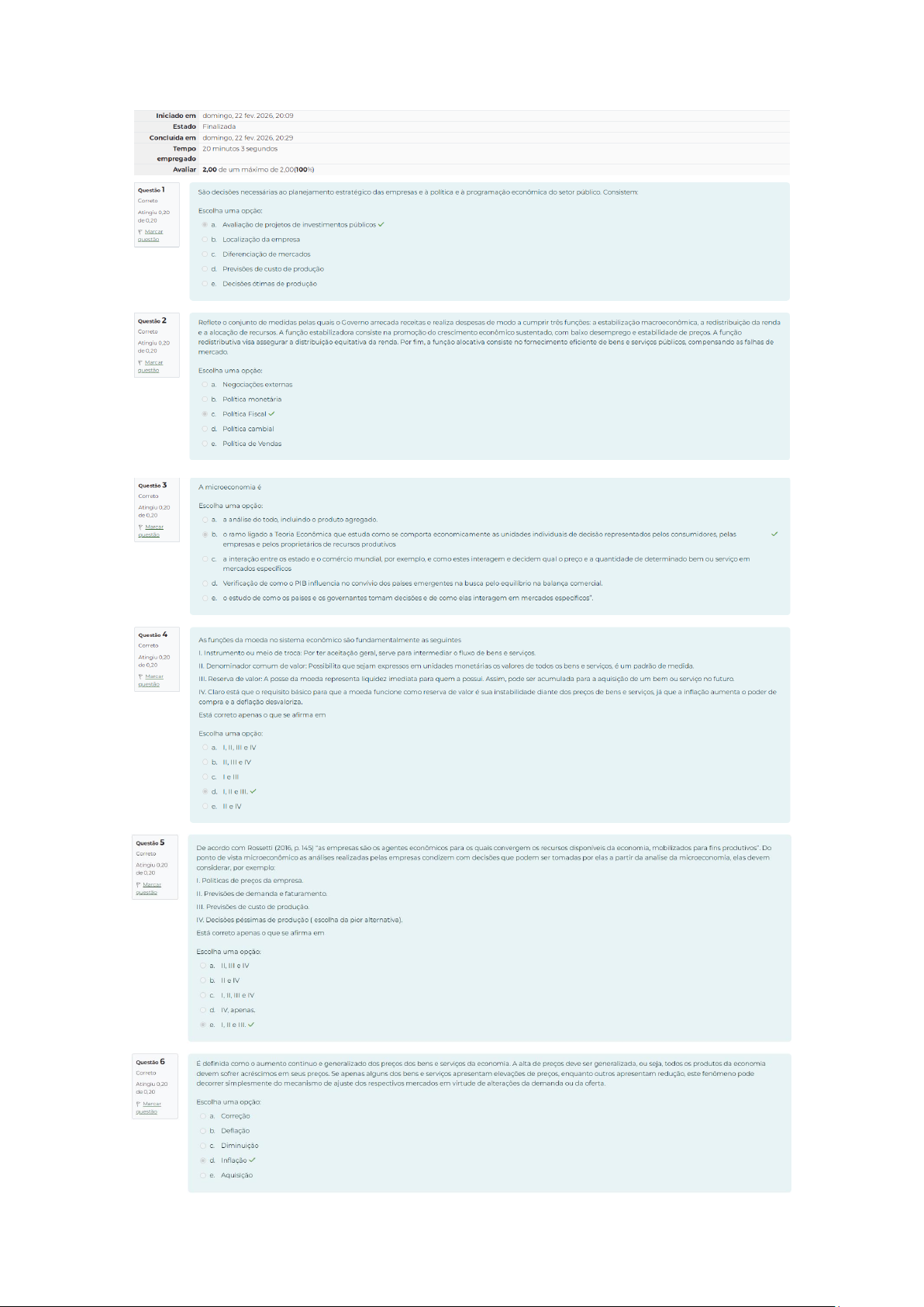 Iniciado em domingo, 22 fev. 20:09 Estado Finalizada Concluída em domingo, 22 fev. 2026. 20:29 Tempo 20 minutos segundos empregado Avaliar 2,00 de um máximo de 2,00(100%) Questão São decisões necessárias ao planejamento estratégico das empresas à política e à programação econômica do setor público. Consistem: Correto Atingiu Escolha uma opção: Avaliação de projetos de investimentos públicos Marcar guestão b. Localização da empresa C. Diferenciação de mercados d. Previsões de custo de produção Decisões ótimas de produção Questão 2 Reflete conjunto de medidas pelas quais Governo arrecada receitas e realiza despesas de modo cumprir três funções: a estabilização macroeconômica, a redistribuição da renda Correto e a alocação de A função estabilizadora consiste na promoção do crescimento econômico sustentado, com baixo desemprego e estabilidade de preços. A função Atingiu redistributiva visa assegurar a distribuição equitativa da renda. Por fim, a função alocativa consiste no fornecimento eficiente de bens e serviços públicos, compensando as falhas de de Marcar Escolha uma opção: a. Negociações externas b. Política monetária Política Fiscal d. Política cambial e. Política de Vendas Questão 3 A microeconomia é Correto Atingiu Escolha uma opção: de a. a análise do todo, incluindo produto agregado. P Marcar b. ramo ligado a Teoria Econômica que estuda como se comporta economicamente as unidades individuais de decisão representados pelos consumidores, pelas empresas e pelos proprietários de recursos produtivos C. a interação entre estado e comércio mundial, por exemplo, e como estes interagem e decidem qual preço e a quantidade de determinado bem ou serviço em mercados específicos d. Verificação de como PIB influencia no convívio dos países emergentes na busca pelo equilíbrio na balança e. estudo de como países e governantes tomam decisões e de como elas interagem em mercados específicos". Questão 4 As funções da moeda no sistema econômico são fundamentalmente as seguintes Correto Instrumento ou meio de troca: Por ter aceitação geral, serve para intermediar fluxo de bens e Atingiu 0,20 Denominador comum de valor: Possibilita que sejam expressos em unidades monetárias valores de todos bens e serviços, é um padrão de medida. P Marcar III. Reserva de valor: A posse da moeda representa liquidez imediata para quem a possui. Assim, pode ser acumulada para a aquisição de um bem ou serviço no futuro. IV. Claro está que requisito básico para que a moeda funcione como reserva de valor é sua instabilidade diante dos preços de bens e serviços, que inflação aumenta poder de compra a deflação Está correto apenas que se afirma em Escolha uma opção: IV b. IV III IV Questão 5 De acordo com Rossetti (2016, 145) "as empresas são OS agentes econômicos para os quais convergem recursos disponíveis da economia, mobilizados para fins produtivos". Do Correto ponto de vista microeconômico as análises realizadas pelas empresas condizem com decisões que podem ser tomadas por elas a partir da analise da microeconomia, elas devem Atingiu 0.20 considerar, por exemplo: Politicas de preços da empresa. P Marcar Previsões de demanda e III. Previsões de custo de produção IV. Decisões péssimas de produção escolha da pior alternativa). Está correto apenas que se afirma em Escolha uma opção: a. IV IV IV d. III. Questão 6 É definida como aumento continuo e generalizado dos preços dos bens e serviços da economia. A alta de preços deve ser generalizada, ou seja, todos produtos da economia Correto devem sofrer acréscimos em seus preços. Se apenas alguns dos bens e serviços apresentam elevações de preços, enquanto outros apresentam redução, este fenômeno pode Atingiu decorrer simplesmente do mecanismo de ajuste dos respectivos mercados em virtude de alterações da demanda ou da oferta. Marcar Escolha uma opção: questão a. Correção b. Deflação Diminuição d. Inflação AquisiçãoQuestão 7 As economias de escala ocorrem quando curva de custo total médio de longo prazo decresce com aumento da produção, já as deseconomias de escalas ocorrem quando curva Correto de custo total médio se eleva com a produção (MANKIW, 2013) Atingiu Quanto às economias de escala podemos destacar três possíveis causas para sua ocorrência. Sobre elas avalie as afirmativas a seguir: Marcar Economia de escala na fábrica está ligada ao investimento no capital fixo e humano, trazendo ganhos provenientes da especialização, que, por sua vez, estão relacionados à produtividade dos ou seja, estão relacionados aos aumentos mais que proporcionais da capacidade produtiva em relação aos custos de Economia de escala no produto está relacionada ao aumento da especialização dos fatores quando a produção de um único e específico produto, por exemplo mão de obra, tende a se tornar cada vez mais qualificada para a elaboração de um produto por causa das repetidas vezes que lida com ele. Economia de escala ligada à empresa são várias as vantagens que esse tipo de economia pode Está correto apenas que se afirma em Escolha uma opção: III Questão 8 Julgue V-verdadeiro ou F-falso Correto () Moeda Fiduciária: emitida pelos Bancos Centrais, tendo agentes econômicos direito de uso, representado pelo papel-moeda e a moeda Atingiu 0,20 de 0.20 () Moeda Escritural ou Bancária: Criada pelo sistema bancário, ao conceder crédito aos agentes econômicos, isto é, são créditos concedidos pelas instituições financeiras P Marcar Quase Moeda: São meios de pagamento que não tem total aceitação da população, mas ultimamente é muito utilizado pelos agentes econômicos. cheques por exemplo são considerados moeda, como não se trata de uma ordem vista de transferência de depósito, é aceito pela Escolha uma opção: b. VVF F d. VVVF e. V Questão 9 A condução dessa política afeta diretamente a vid