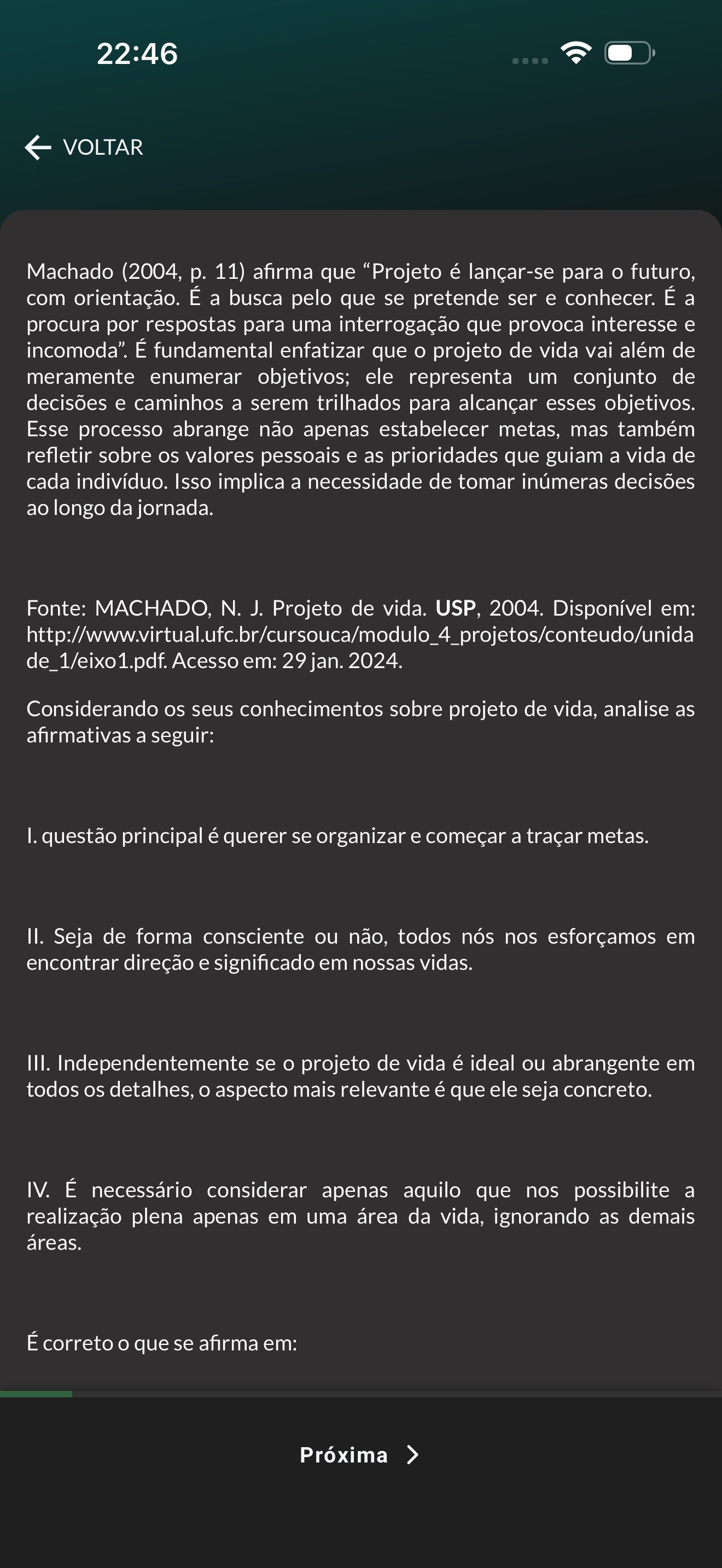 22:46 VOLTAR Machado (2004, p. 11) afirma que "Projeto é lançar-se para o futuro, com orientação. É a busca pelo que se pretende ser e conhecer. É a procura por respostas para uma interrogação que provoca interesse e incomoda". É fundamental enfatizar que projeto de vida vai além de meramente enumerar objetivos; ele representa um conjunto de decisões e caminhos a serem trilhados para alcançar esses objetivos. Esse processo abrange não apenas estabelecer metas, mas também refletir sobre os valores pessoais e as prioridades que guiam a vida de cada indivíduo. Isso implica a necessidade de tomar inúmeras decisões ao longo da jornada. Fonte: MACHADO, N. J. Projeto de vida. USP, 2004. Disponível em: http://www.virtual.ufc.br/cursouca/modulo_4_projetos/conteudo/unida de_1/eixo1.pdf. Acesso em: 29 jan. 2024. Considerando os seus conhecimentos sobre projeto de vida, analise as afirmativas a seguir: I. questão principal é querer se organizar e começar a traçar metas. II. Seja de forma consciente ou não, todos nós nos esforçamos em encontrar direção e significado em nossas vidas. III. Independentemente se o projeto de vida é ideal ou abrangente em todos os detalhes, o aspecto mais relevante é que ele seja concreto. IV. É necessário considerar apenas aquilo que nos possibilite a realização plena apenas em uma área da vida, ignorando as demais áreas. É correto o que se afirma em: Próxima >