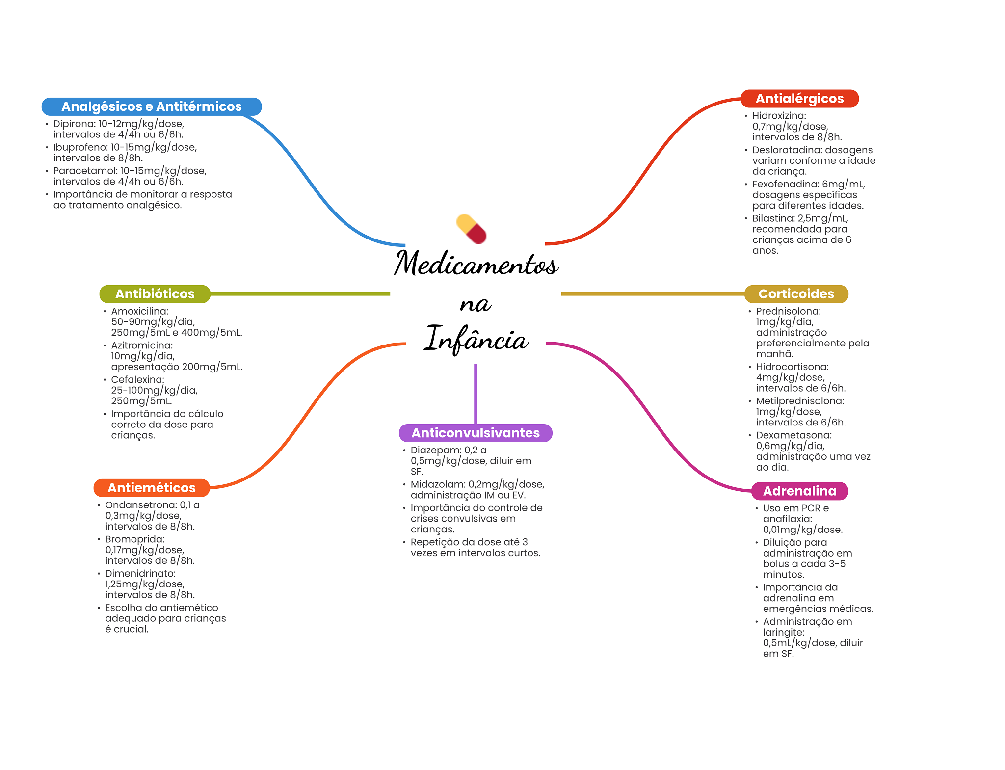 Analgésicos e Antitérmicos Antialérgicos Hidroxizina: Dipirona: 10-12mg/kg/dose, 0,7mg/kg/dose, intervalos de 4/4h ou 6/6h. intervalos de 8/8h. Ibuprofeno: 10-15mg/kg/dose, Desloratadina: dosagens intervalos de 8/8h. variam conforme a idade Paracetamol: 10-15mg/kg/dose, da criança. intervalos de 4/4h ou 6/6h. Fexofenadina: 6mg/mL, Importância de monitorar a resposta dosagens específicas ao tratamento analgésico. para diferentes idades. Bilastina: 2,5mg/mL, recomendada para crianças acima de 6 anos. Medicamentos Antibióticos Corticoides Amoxicilina: na Prednisolona: 50-90mg/kg/dia, 250mg/5mL e 400mg/5mL. Infância administração Azitromicina: preferencialmente pela 10mg/kg/dia, manhã. apresentação 200mg/5mL. Hidrocortisona: Cefalexina: 4mg/kg/dose, 25-100mg/kg/dia, intervalos de 6/6h. 250mg/5mL. Metilprednisolona: Importância do cálculo correto da dose para intervalos de 6/6h. crianças. Anticonvulsivantes Dexametasona: Diazepam: 0,2 a 0,6mg/kg/dia, 0,5mg/kg/dose, diluir em administração uma vez ao dia. SF. Antieméticos Midazolam: 0,2mg/kg/dose, administração IM ou EV. Adrenalina Ondansetrona: 0,1 a Importância do controle de Uso em PCR e 0,3mg/kg/dose, crises convulsivas em anafilaxia: intervalos de 8/8h. crianças. 0,01mg/kg/dose. Bromoprida: Repetição da dose até 3 Diluição para 0,17mg/kg/dose, vezes em intervalos curtos. administração em intervalos de 8/8h. bolus a cada 3-5 Dimenidrinato: minutos. 1,25mg/kg/dose, Importância da intervalos de 8/8h. adrenalina em Escolha do antiemético emergências médicas. adequado para crianças Administração em é crucial. laringite: 0,5mL/kg/dose, diluir em SF.