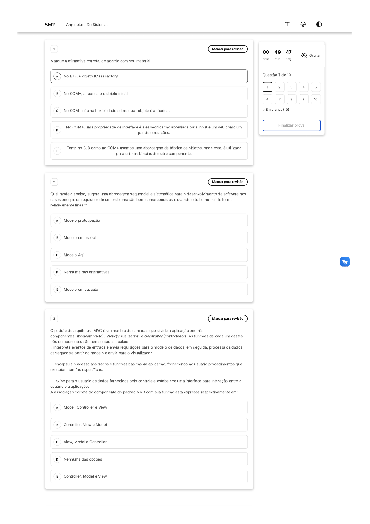 A B C D E A B C D E A B C D E 1 Marcar para revisão Marque a afirmativa correta, de acordo com seu material. No EJB, é objeto IClassFactory. No COM+, a fábrica é o objeto inicial. No COM+ não há flexibilidade sobre qual objeto é a fábrica. No COM+, uma propriedade de interface é a especificação abreviada para inout e um set, como um par de operações. Tanto no EJB como no COM+ usamos uma abordagem de fábrica de objetos, onde este, é utilizado para criar instâncias de outro componente. 2 Marcar para revisão Qual modelo abaixo, sugere uma abordagem sequencial e sistemática para o desenvolvimento de software nos casos em que os requisitos de um problema são bem compreendidos e quando o trabalho flui de forma relativamente linear? Modelo prototipação Modelo em espiral Modelo Ágil Nenhuma das alternativas Modelo em cascata 3 Marcar para revisão O padrão de arquitetura MVC é um modelo de camadas que divide a aplicação em três componentes: Model(modelo), View (visualizador) e Controller (controlador). As funções de cada um destes três componentes são apresentadas abaixo: I. interpreta eventos de entrada e envia requisições para o modelo de dados; em seguida, processa os dados carregados a partir do modelo e envia para o visualizador. II. encapsula o acesso aos dados e funções básicas da aplicação, fornecendo ao usuário procedimentos que executam tarefas específicas. III. exibe para o usuário os dados fornecidos pelo controle e estabelece uma interface para interação entre o usuário e a aplicação. A associação correta do componente do padrão MVC com sua função está expressa respectivamente em: Model, Controller e View Controller, View e Model View, Model e Controller Nenhuma das opções Controller, Model e View 00 hora : 49 min : 47 seg Ocultar Questão 1 de 10 Em branco (10) Finalizar prova 1 2 3 4 5 6 7 8 9 10 SM2 Arquitetura De Sistemas A B C D E A B C D E A B C D E A B C 4 Marcar para revisão São requisitos funcionais, exceto: Gerar consulta ou relatório com 10 melhores clientes. Gerar gráfico de barra com evolução das despesas nos últimos 12 meses. Calcular faturamento mensalmente. Registrar cada login e logout de usuário. Fechamento da compra do cliente deve ter processamento inferior a 10 segundo. 5 Marcar para revisão O componente Controller do MVC: Define o comportamento da aplicação, as ações do usuário para atualizar os componentes de dados e seleciona os componentes para exibir respostas de requisições. Envia requisições do usuário para o controlador e recebe dados atualizados dos componentes de acesso a dados. Responde às solicitações de queries e encapsula o estado da aplicação. Notifica os componentes de apresentação das mudanças efetuadas nos dados e expõe a funcionalidade da aplicação. É onde são concentradas todas as regras de negócio da aplicação e o acesso aos dados. 6 Marcar para revisão Baseado no modelo CANVAS de modelagem de negócios, separamos o modelo de negócio em grandes grupos que estão associados às seguintes perguntas: Como?, Por que?, Quanto? Por que?, Quando?, Quanto? Quem?, O que?, Quando?, Como?, Onde? O que?, Onde? Como? Quanto? Como?, O que?, Para quem?, Quanto? 7 Marcar para revisão O modelo mais tradicional de desenvolvimento de software é o modelo em cascata. Considerando a utilização desse modelo e suas fases, assinale a alternativa que apresenta uma afirmação verdadeira. A divisão dos requisitos para implementação do sistema em hardware ou software é feita na fase de operação e manutenção. A especificação do sistema é produzida após o estágio de implementação e teste de unidade. Não há necessidade de se produzir qualquer tipo de documentação em suas fases. D E A B C D E A B C D E A B C D E Nenhuma das alternativas. O primeiro estágio de desenvolvimento de um novo sistema consiste na definição de requisitos. 8 Marcar para revisão Analise as afirmações a seguir e escolha a alternativa correta I - Os dados estarem presentes em um único lugar é uma característica da arquitetura em camadas II - Estilos arquiteturais podem ser classificados em situações em que o seu uso é apropriado, com a classificação das vantagens e desvantagens do uso nessas situações III - A arquitetura de repositório (blackboard) é fortemente baseada no uso de dados centralizados IV - Uma das características da arquitetura MVC é a sua aplicação em sistemas interativos Somente a alternativa I é verdadeira. Somente as alternativas I e II são verdadeiras. Somente a alternativa III é verdadeira. Somente as alternativas II e III são verdadeiras. Somente as alternativas II, III e IV são verdadeiras. 9 Marcar para revisão A modelagem de interação de componentes é uma técnica de modelagem do comportamento dos componentes em relação ao problema a ser resolvido. São subprocessos de interação de componentes: I. Definir operações de negócios. II. Refinar interfaces e regras de negócio. III. Refinar definição de componentes e arquitetura. Assinale a alternativa correta. Apenas I. Apenas I e II. Apenas II e III. Apenas I e III. I e II e III estão corretas. 10 Marcar para revisão Uma empresa está seguindo todos os passos para o desenvolvimento de componente. Após o arquiteto de sistemas ter realizado toda a especificação do componente, cabe agora o desenvolvedor implementá-lo. Mas ao pegar a especificação do componente, o mesmo descobriu que não conhece muito bem o padrão especificado pelo arquiteto. Mediante a essa situação o que o desenvolvedor deve fazer? Buscar a referência na metodologia de processo. Buscar a referência na metodologia de interface. Escolher outro padrão, que conheça, para substitui-lo. Desenvolver a aplicação sem a implementação do padrão definido. Buscar a referência na metodologia de produto.